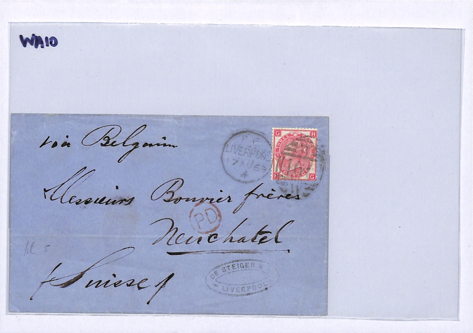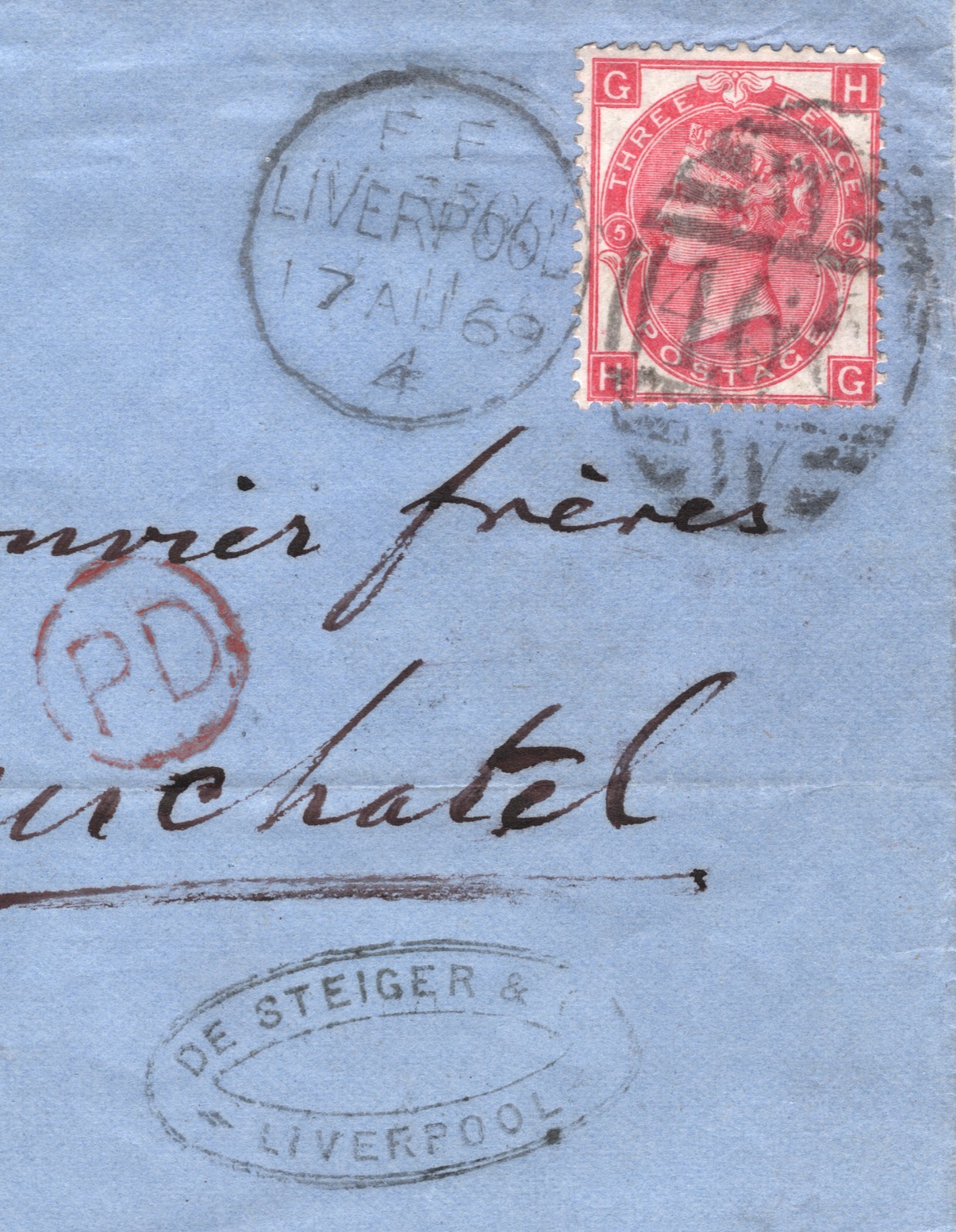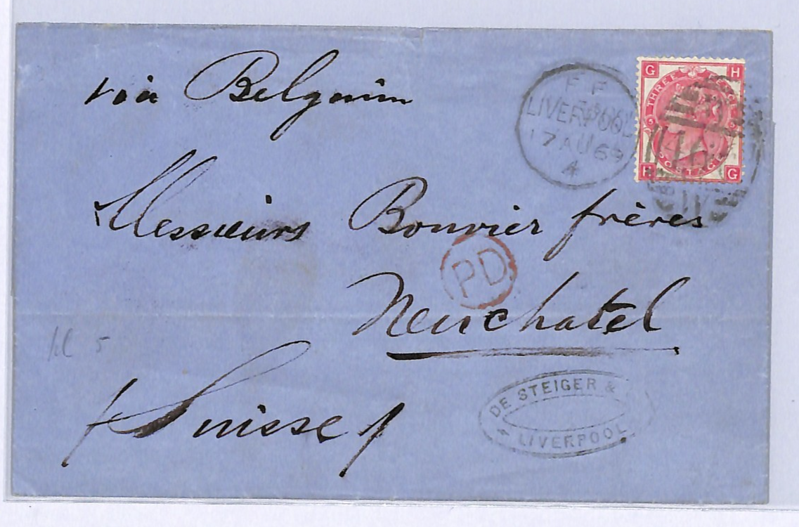 GB QV SWITZERLAND MAIL 3d Plate 5 Cover *LIVERPOOL/W* Duplex 1869 Neuchatel WA10