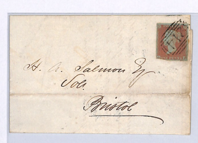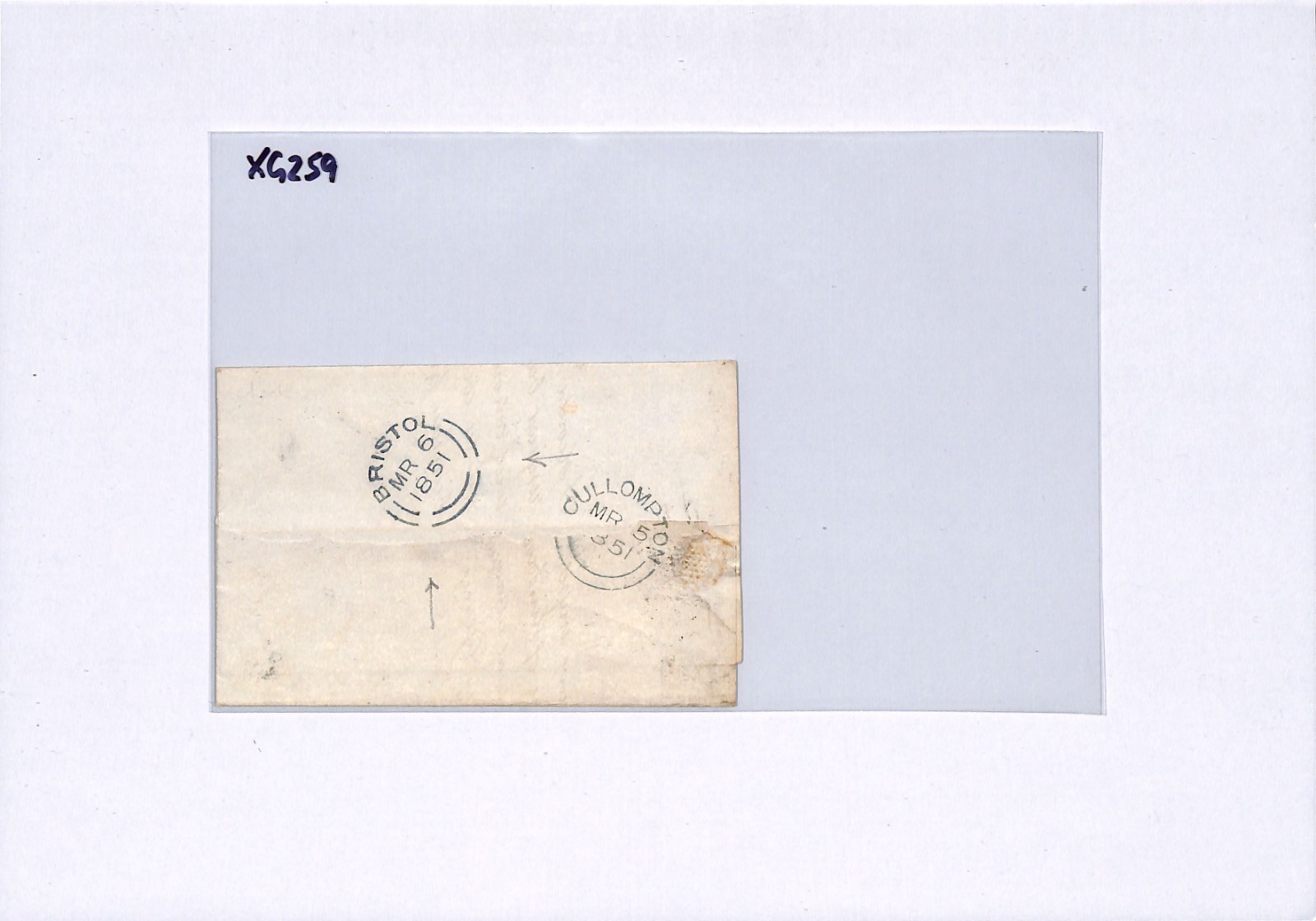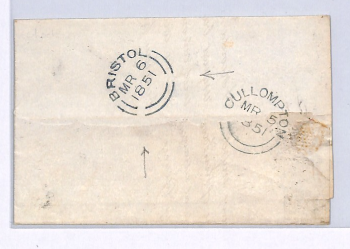 GB RAILWAY QV Cover 1851 *BRISTOL STATION* TRANSIT Blue BROKEN-ARCS CDS 1d Imperf Cullompton Devon XG259