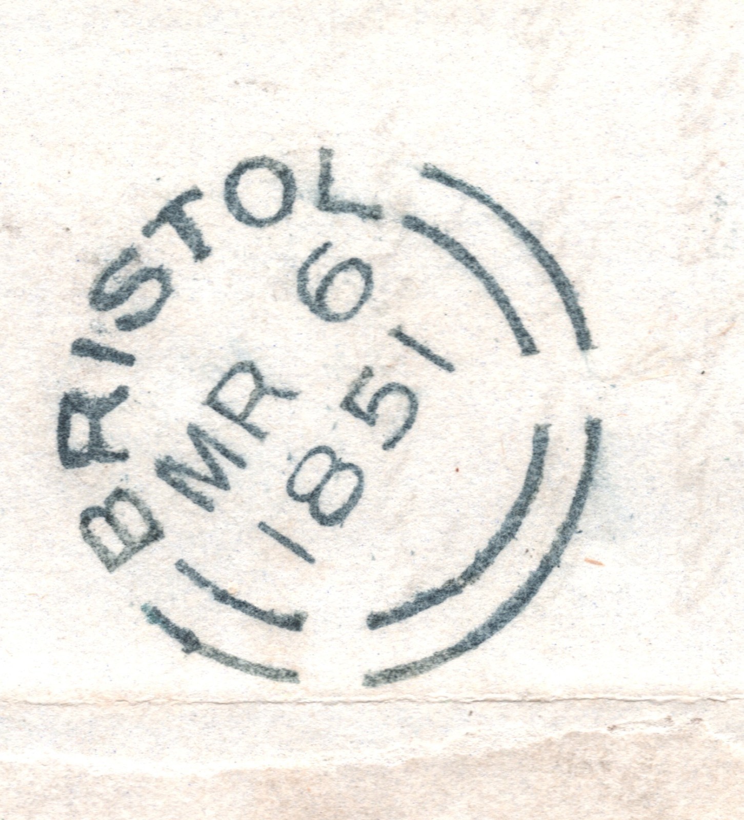 GB RAILWAY QV Cover 1851 *BRISTOL STATION* TRANSIT Blue BROKEN-ARCS CDS 1d XG259