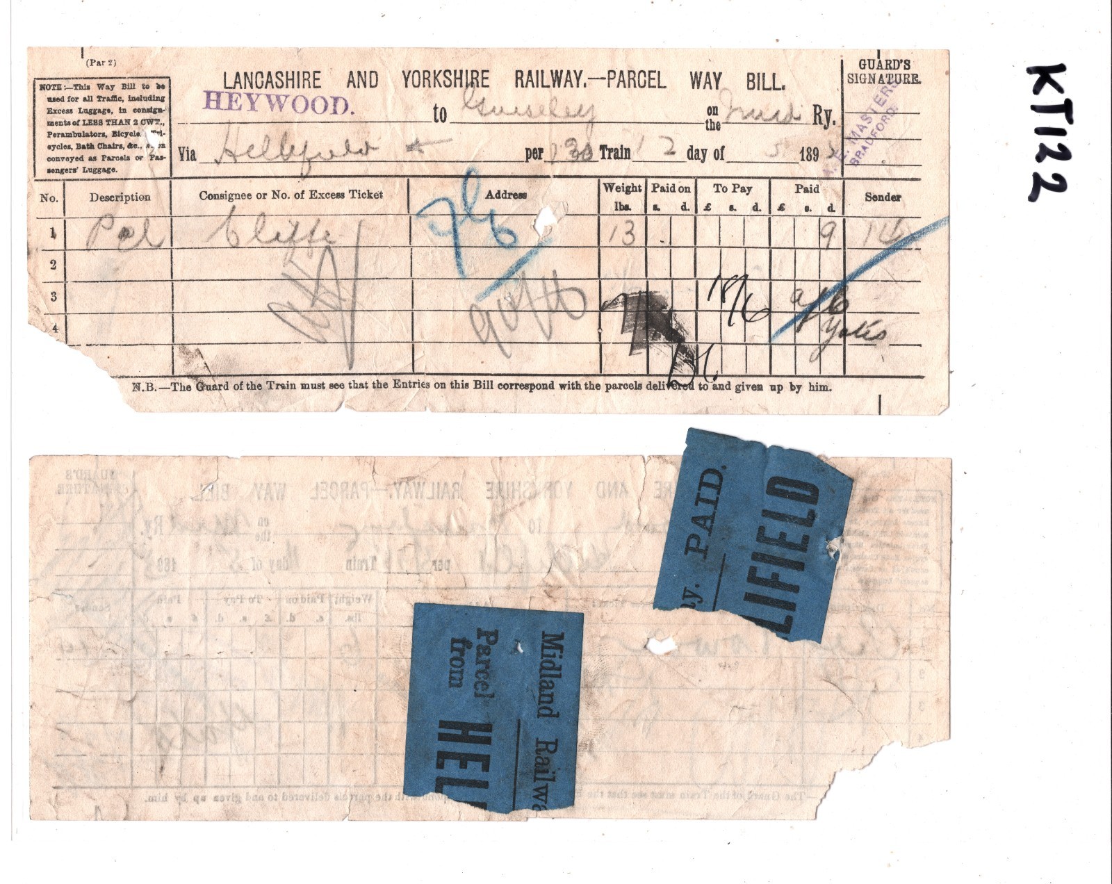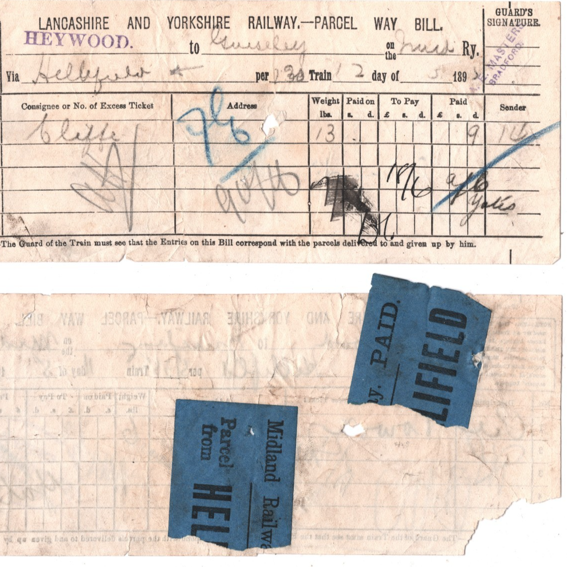 REMARKABLE USE of Blue Paper *PAID* Parcel Stamps of HELLIFIELD STATION (Yorks). MATCHED PAIR OF LANCASHIRE & YORKSHIRE RAILWATY Way Bills both from HEYWOOD STATION (Lancs). RAILWAY PARCEL STAMP EXHIBITION ITEM from archive lot discovered by Samwells Ltd. NOT OFFERED to collectors previously. Faults. Overall Good for an item of this type & period. Please look at all the scans to help form your own opinion (WAF).