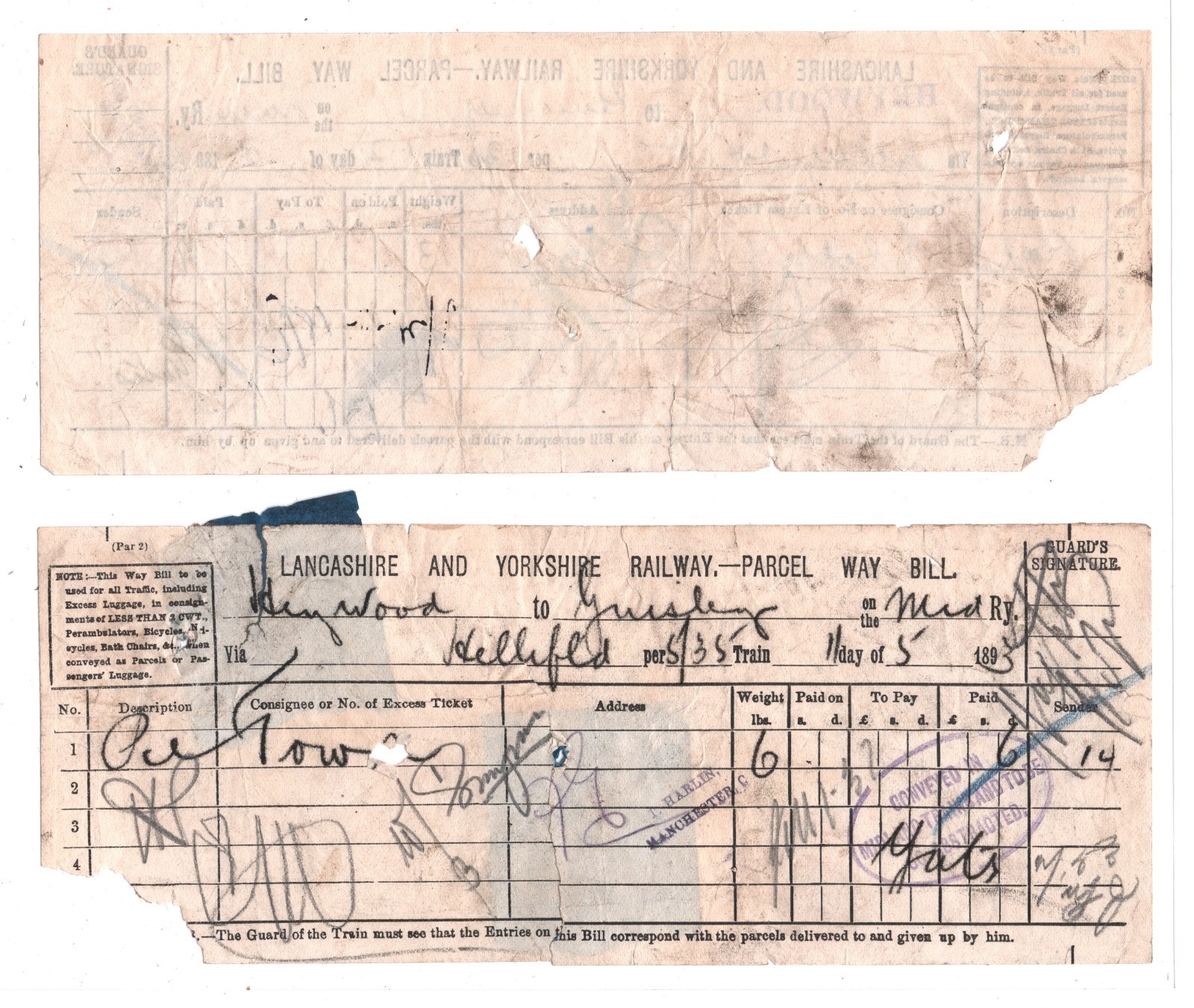 GB L&YR Way Bill{2} Heywood HELLIFIELD *PAID* MIDLAND RAILWAY Parcel Stamp 1893 KT122