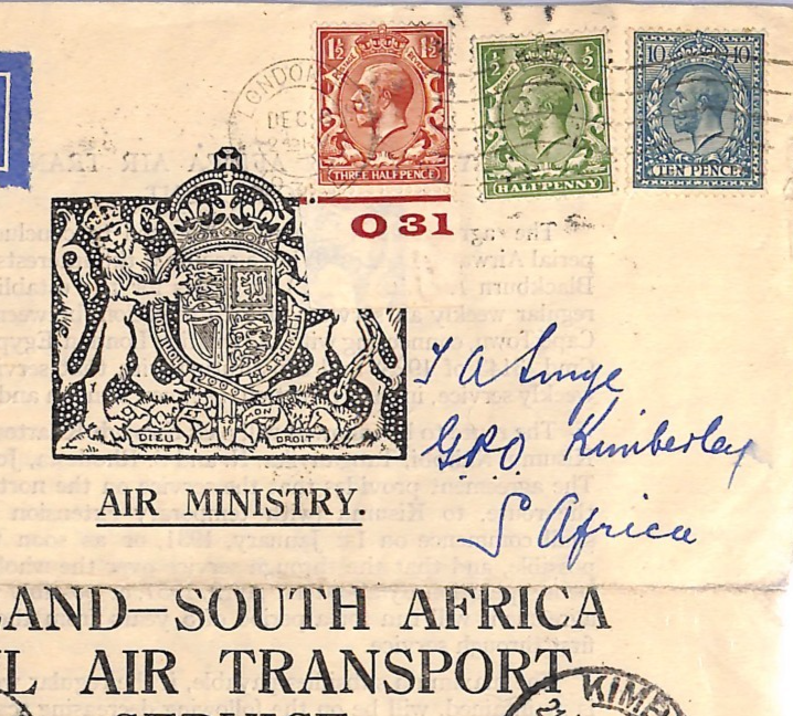GB/SOUTH AFRICA Air Mail FIRST FLIGHT CIVIL AIR TRANSPORT 1934 Kimberley WT5