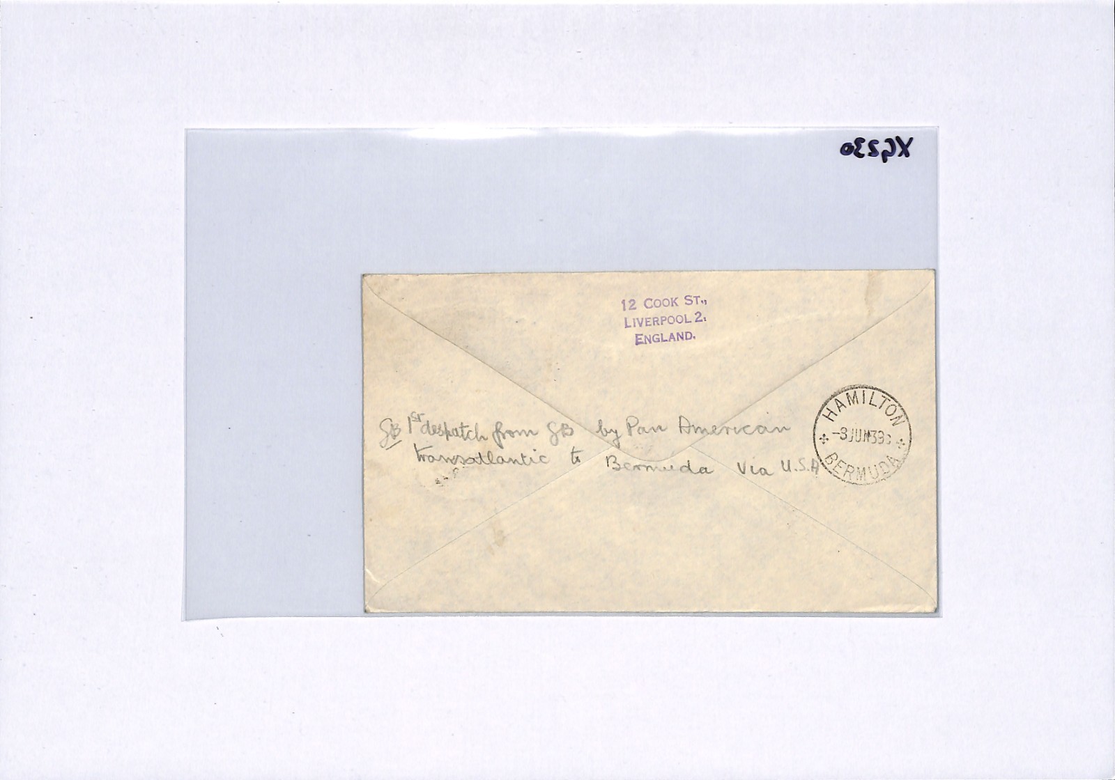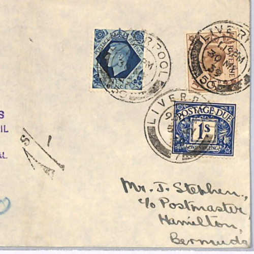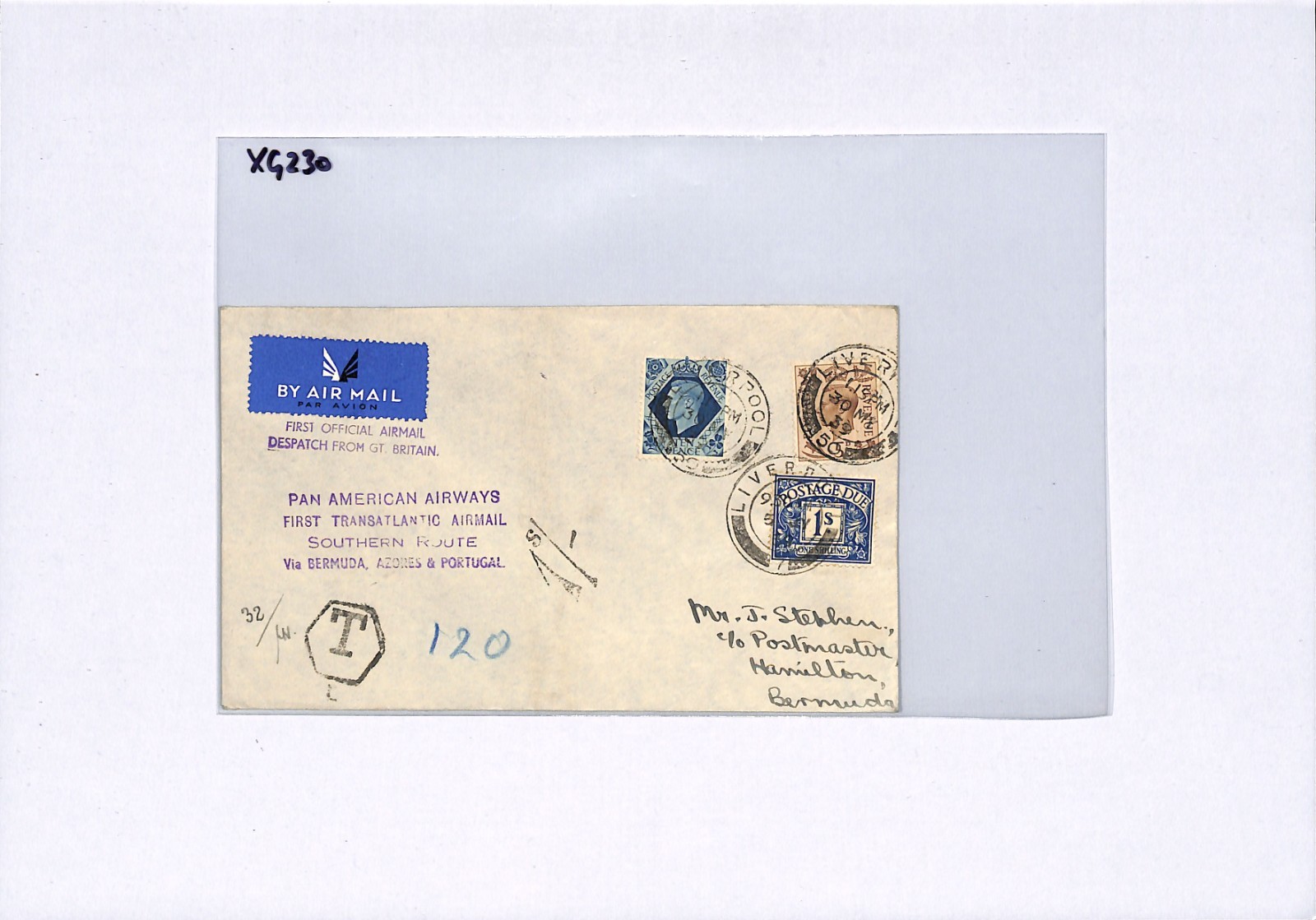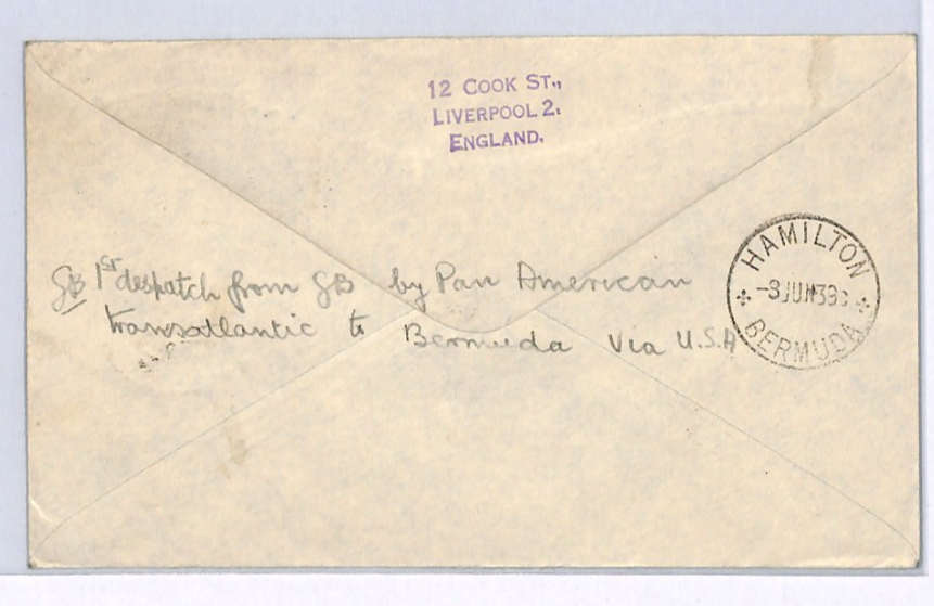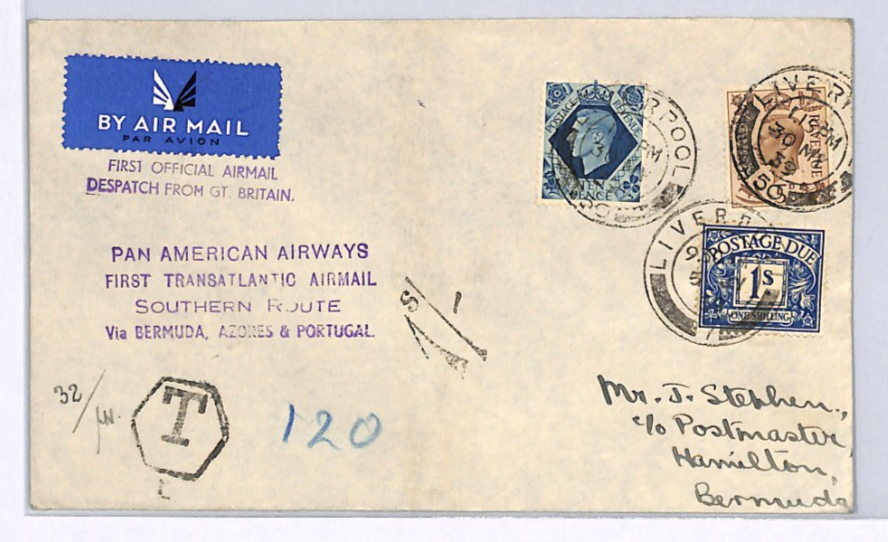 GB Underpaid Air Mail PAN-AM FIRST FLIGHT BERMUDA TAXE 1s Liverpool 1939 XG230