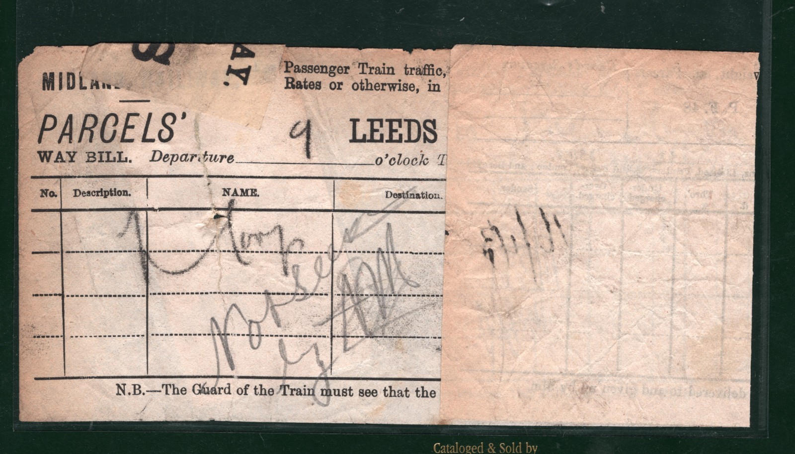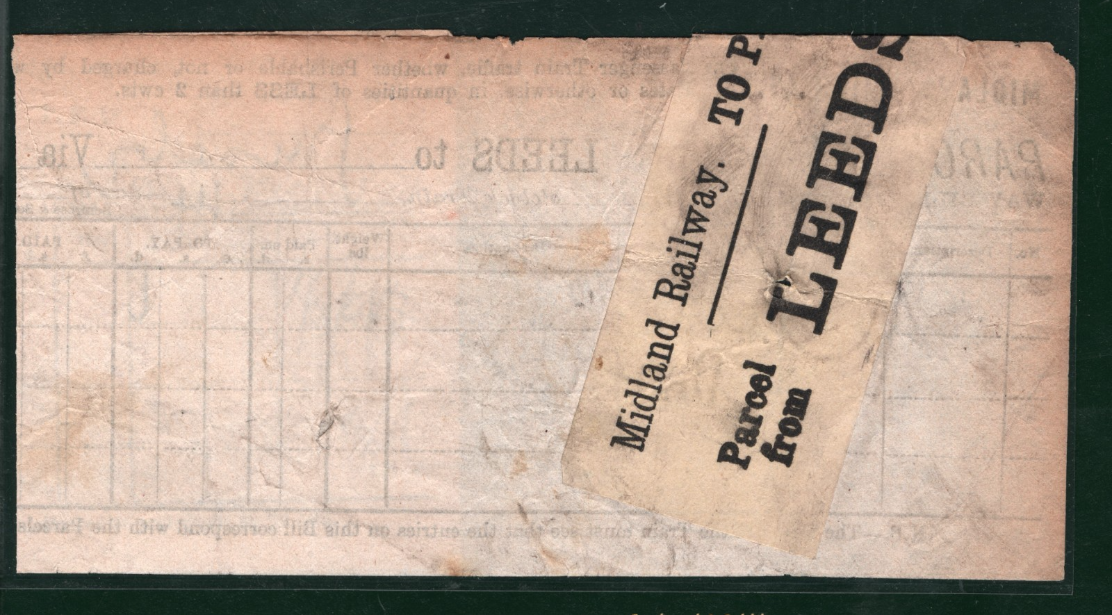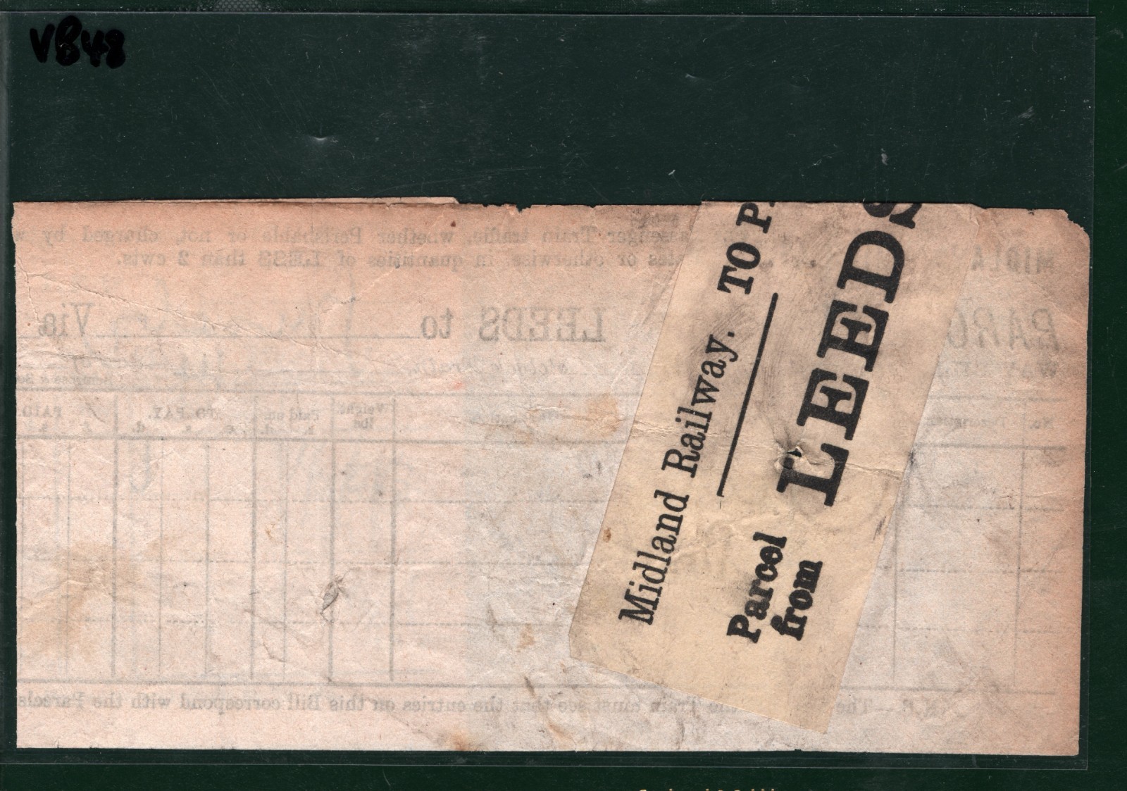 GB Yorks MIDLAND RAILWAY QV Parcel Stamp *TO PAY* LEEDS 1890s LYR Way Bill VB48