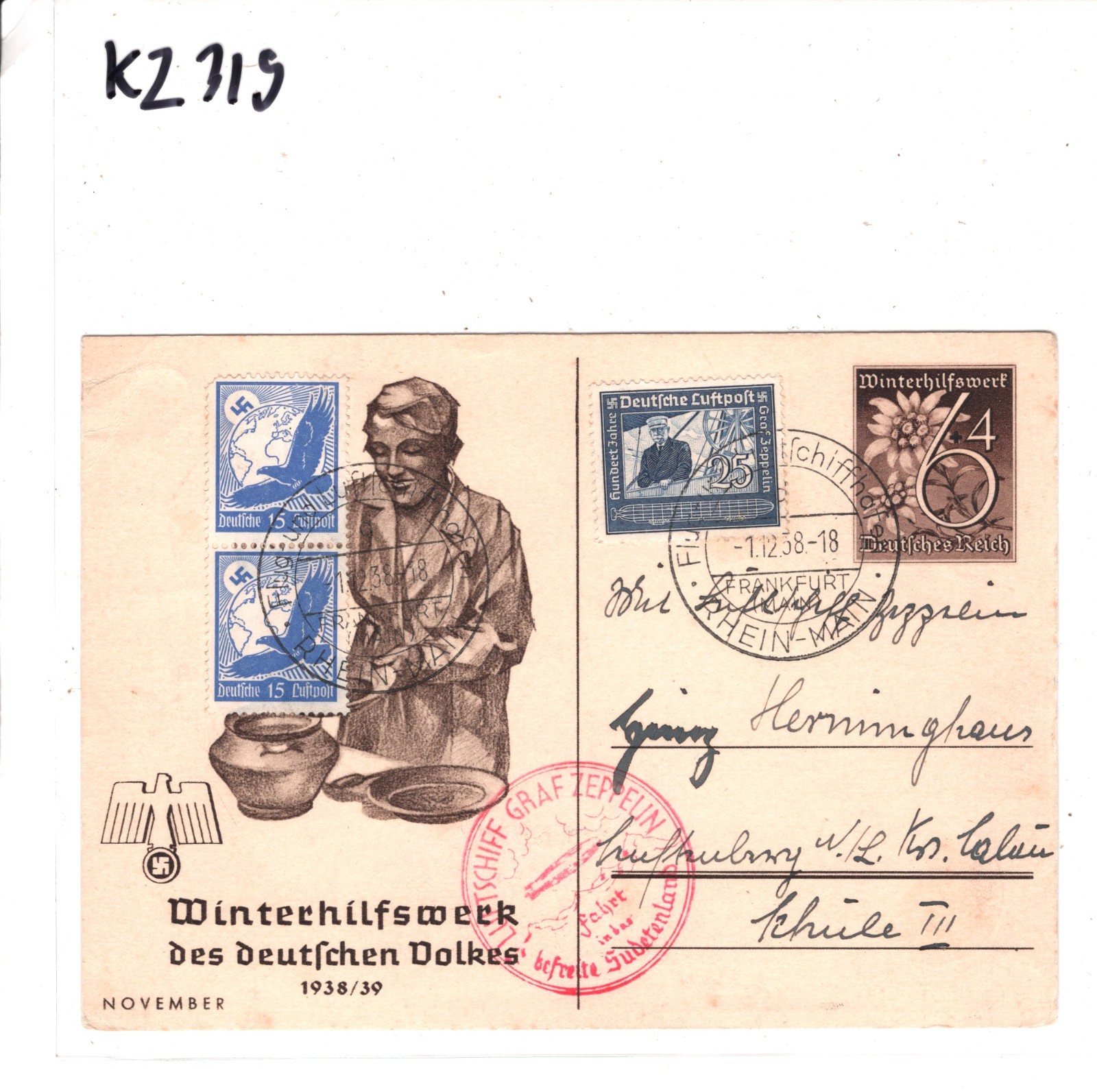 GERMANY GRAF ZEPPELIN Air Mail Card SUDETENLAND 1938 Czechoslovakia Reichenberg Liberec KZ319