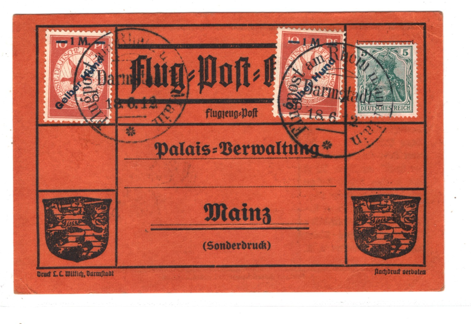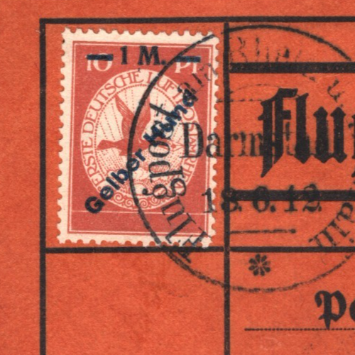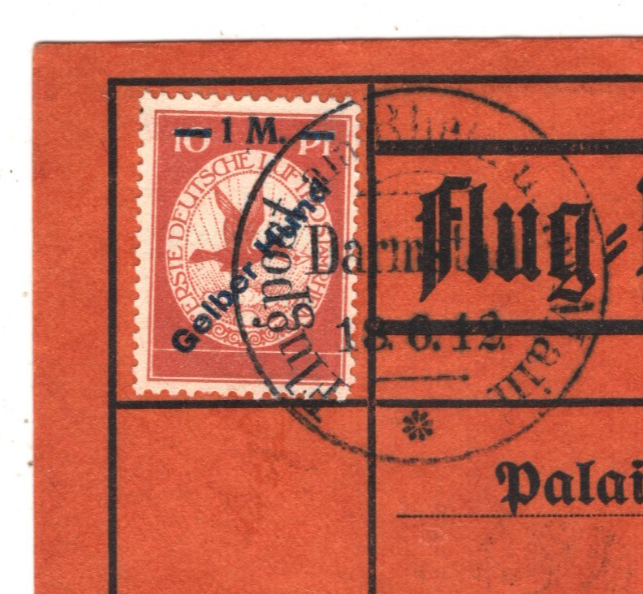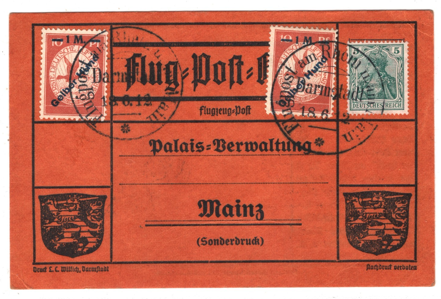 GERMANY Pioneer 1912 Air 1m *Gelber-Hund* Stamp{2} Darmstadt 18/6 Flight KZ498