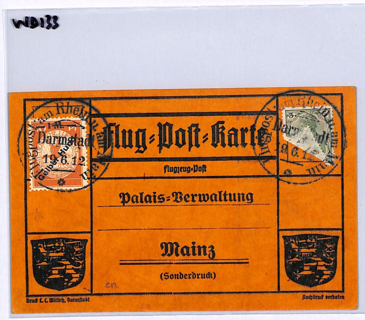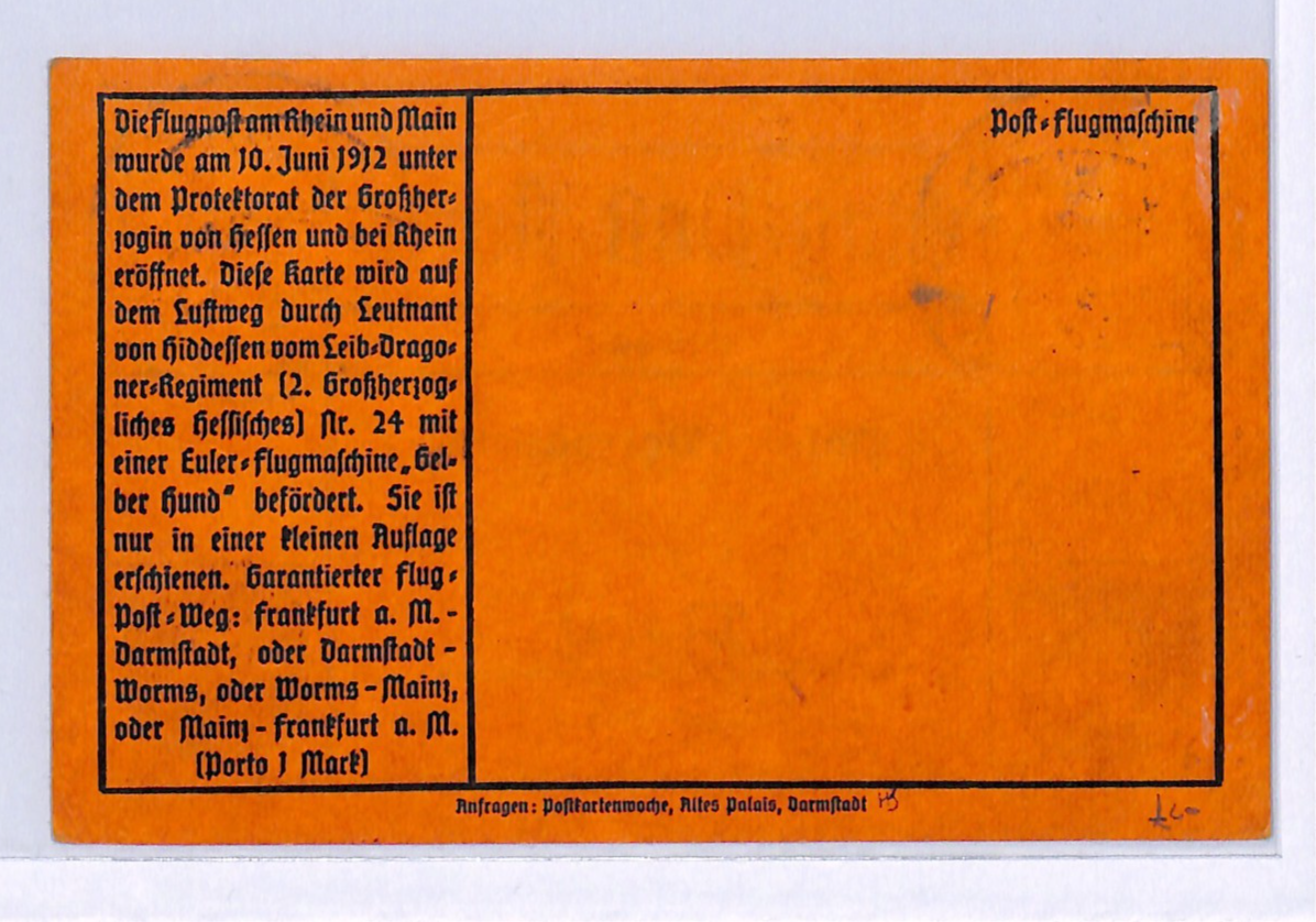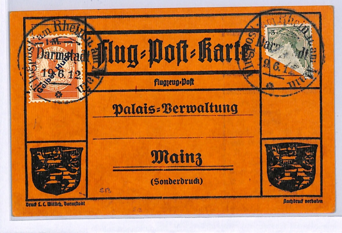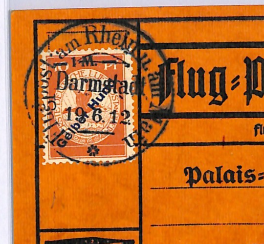 GERMANY Pioneer Air 1912 Card 1m *Gelber-Hund* Stamp Darmstadt 19/6 Flight WD133