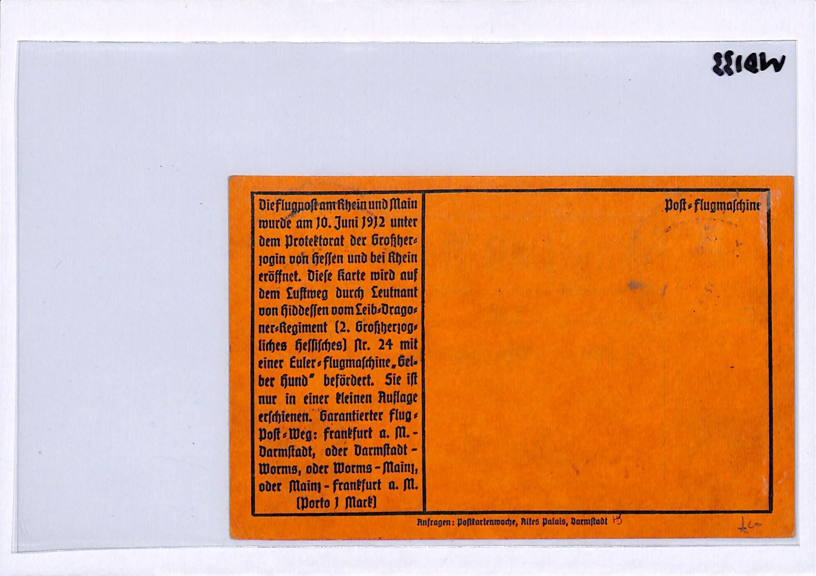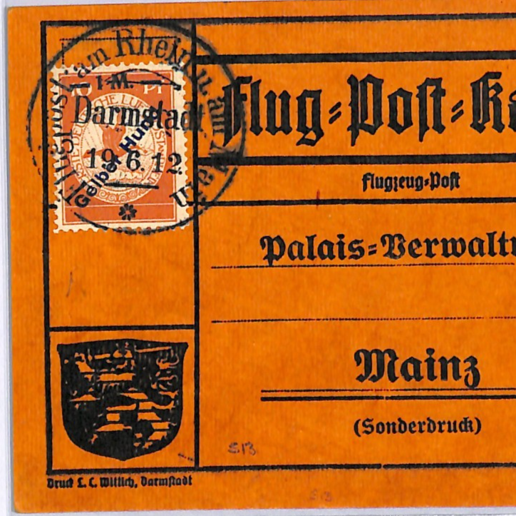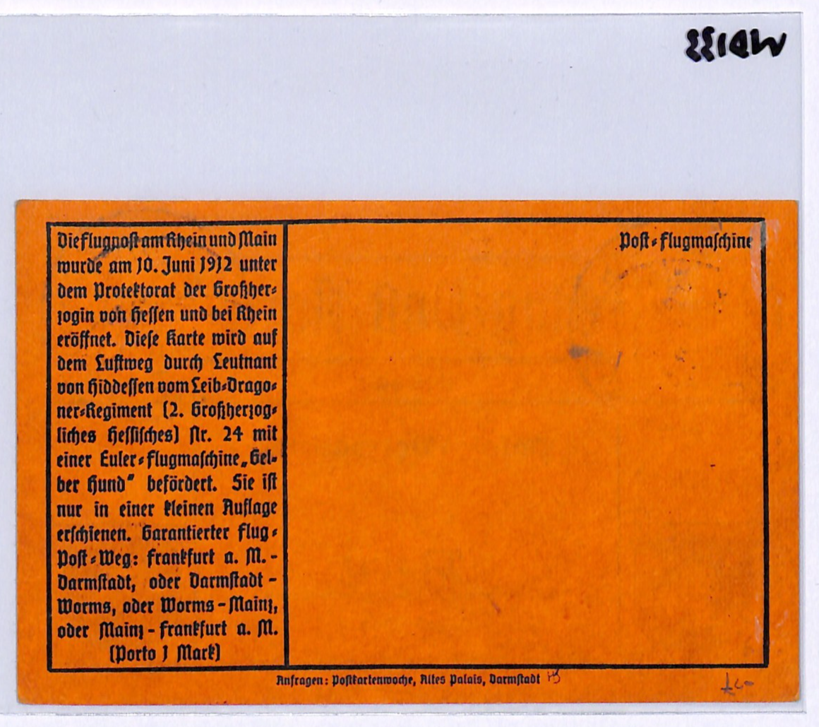 GERMANY Pioneer Air 1912 Card 1m *Gelber-Hund* Stamp Darmstadt 19/6 Flight WD133