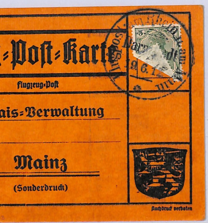 GERMANY Air Mail 1912 1M GELBER HUND Pigeon SEMI-OFFICIAL Darmstadt Mainz WD133