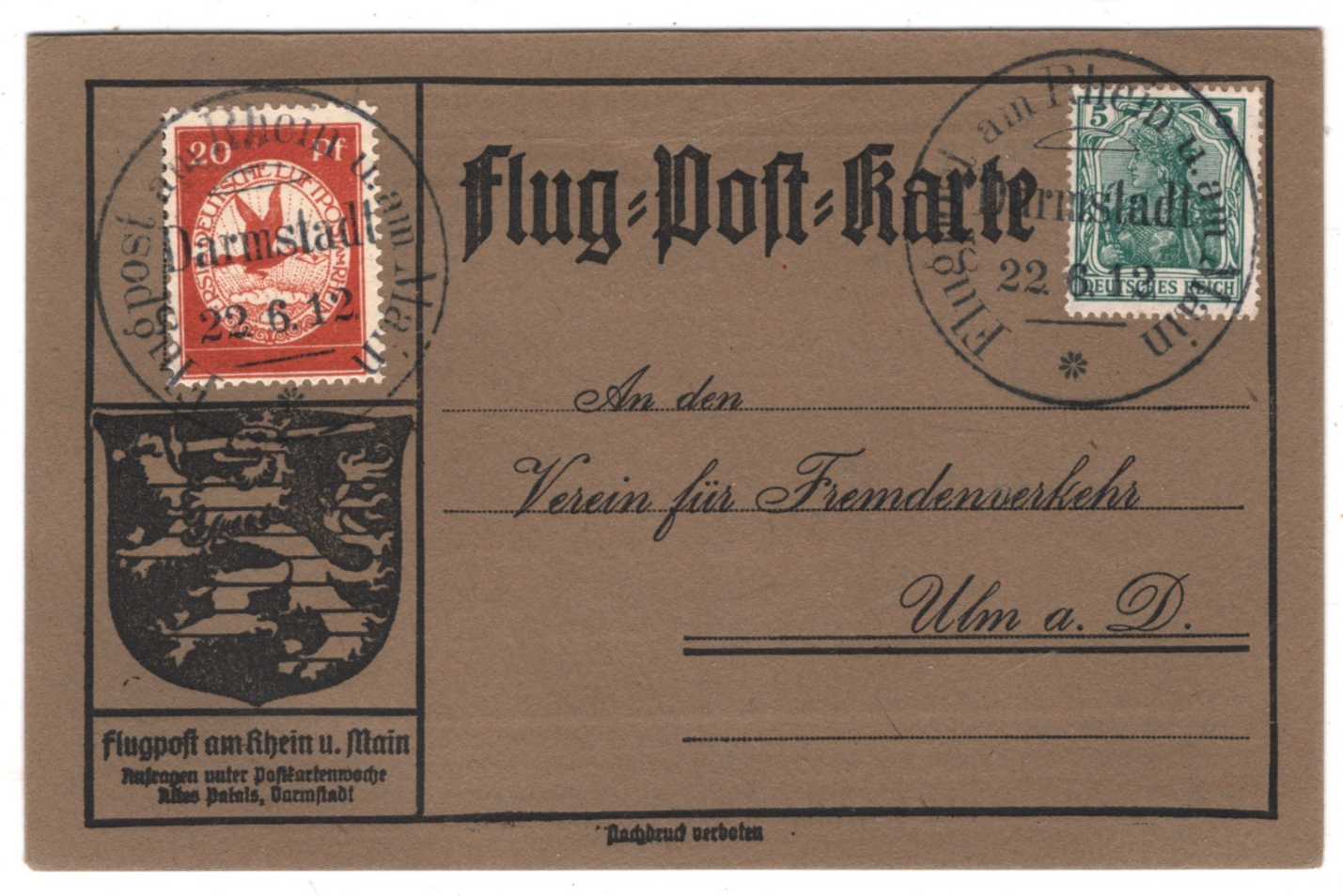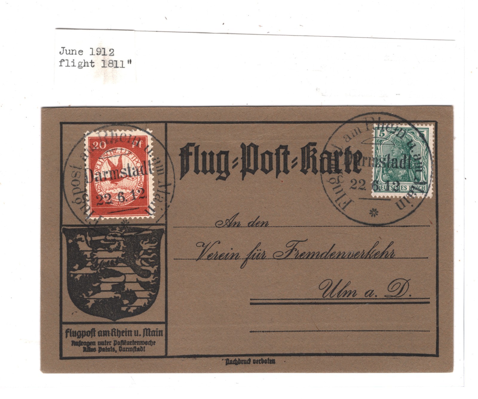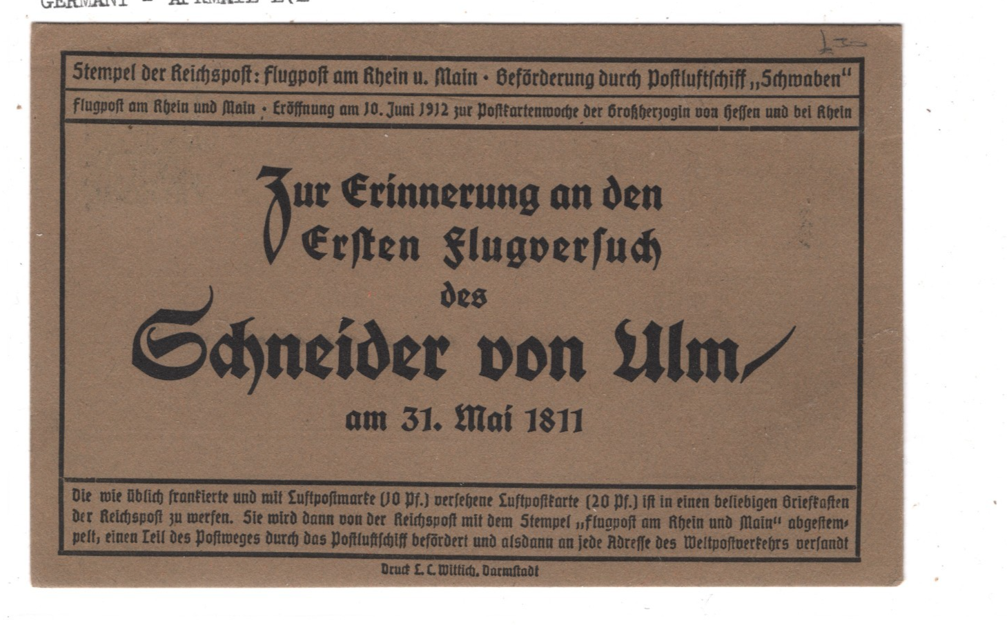 GERMANY Pioneer Air 1912 *SCHNEIDER ULM* Card 20pf BIRD Stamp Darmstadt KZ495