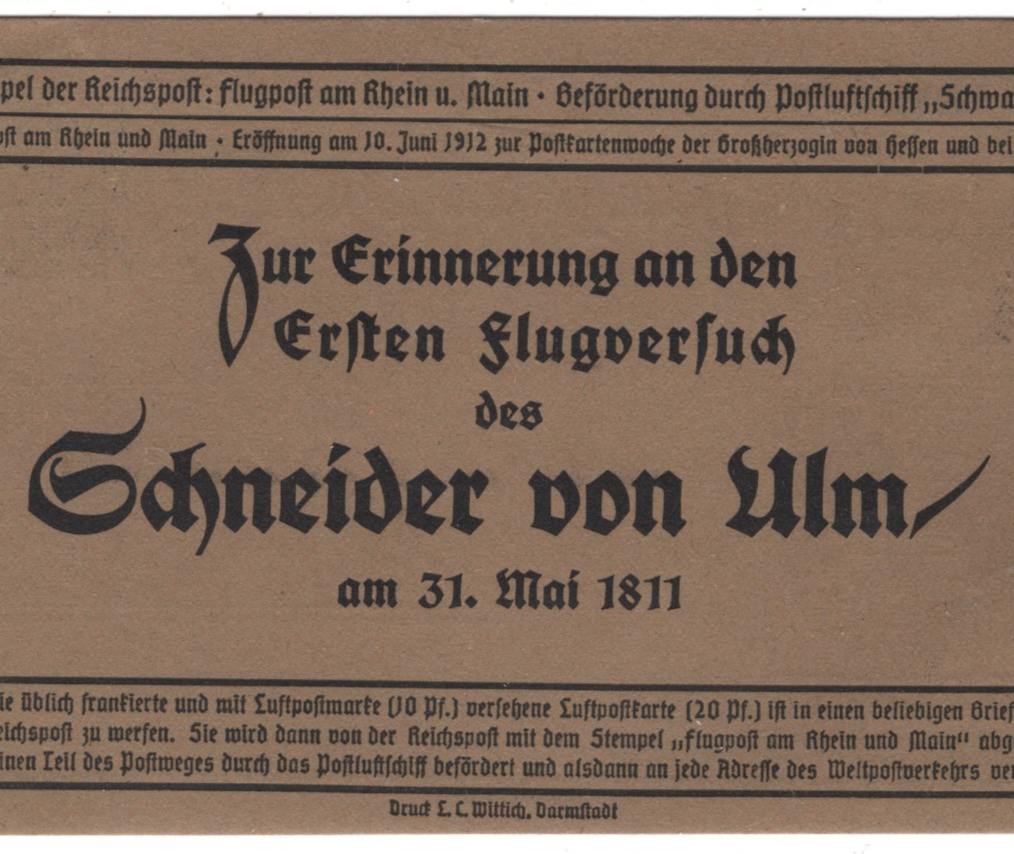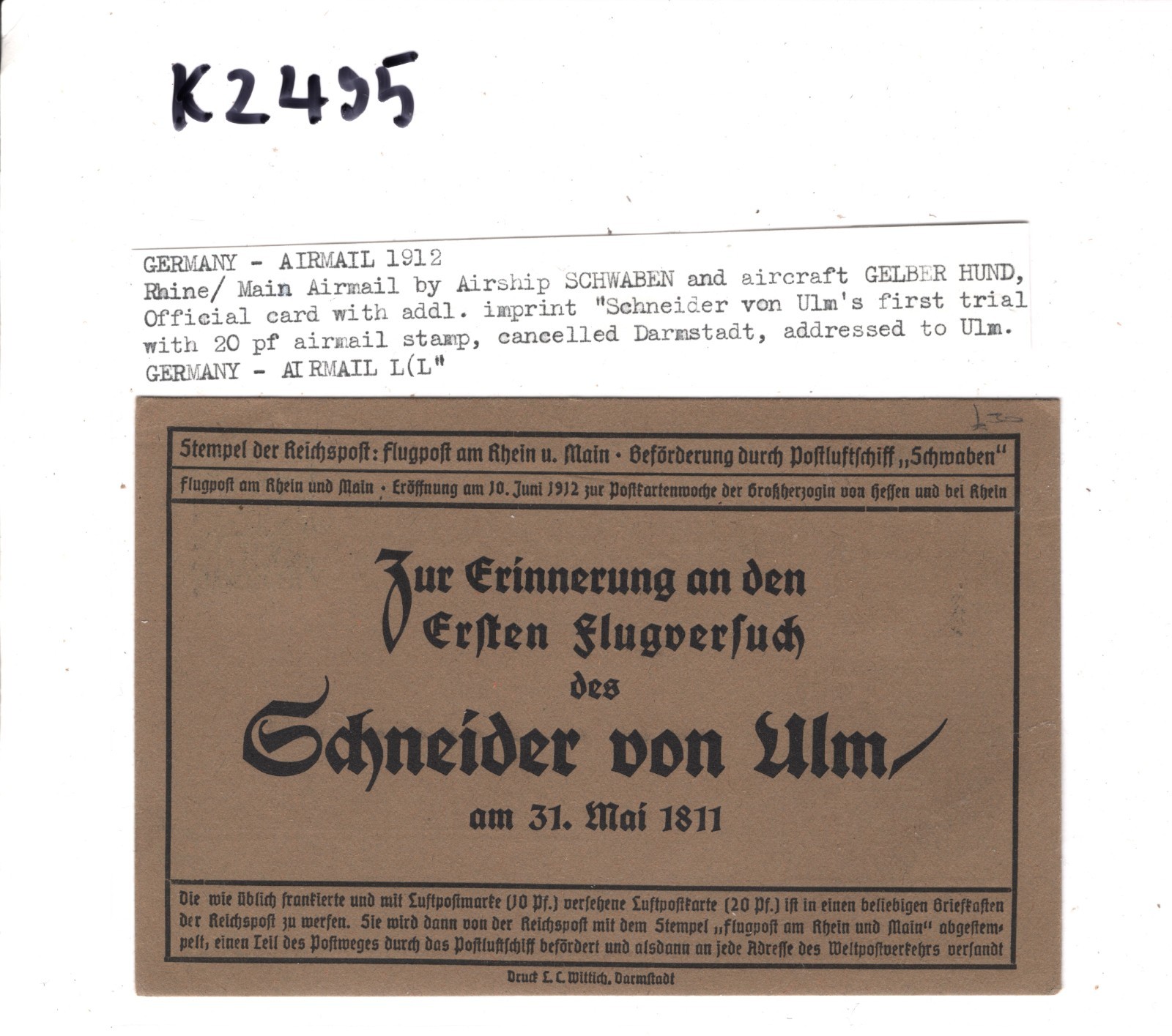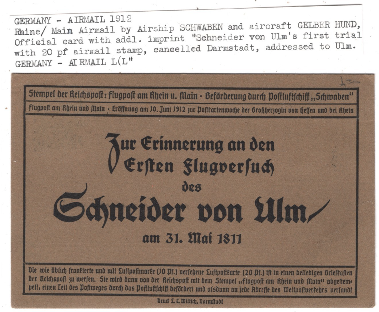 GERMANY Pioneer Air 1912 *SCHNEIDER ULM* Card 20pf BIRD Stamp Darmstadt KZ495