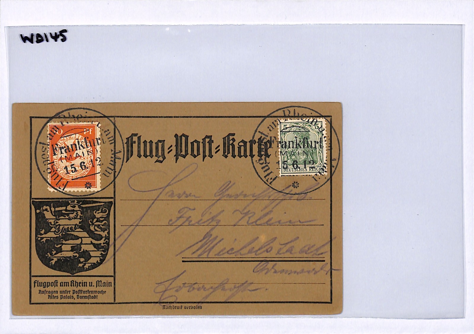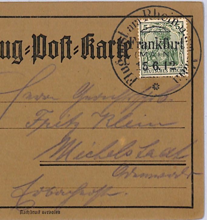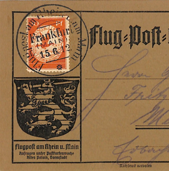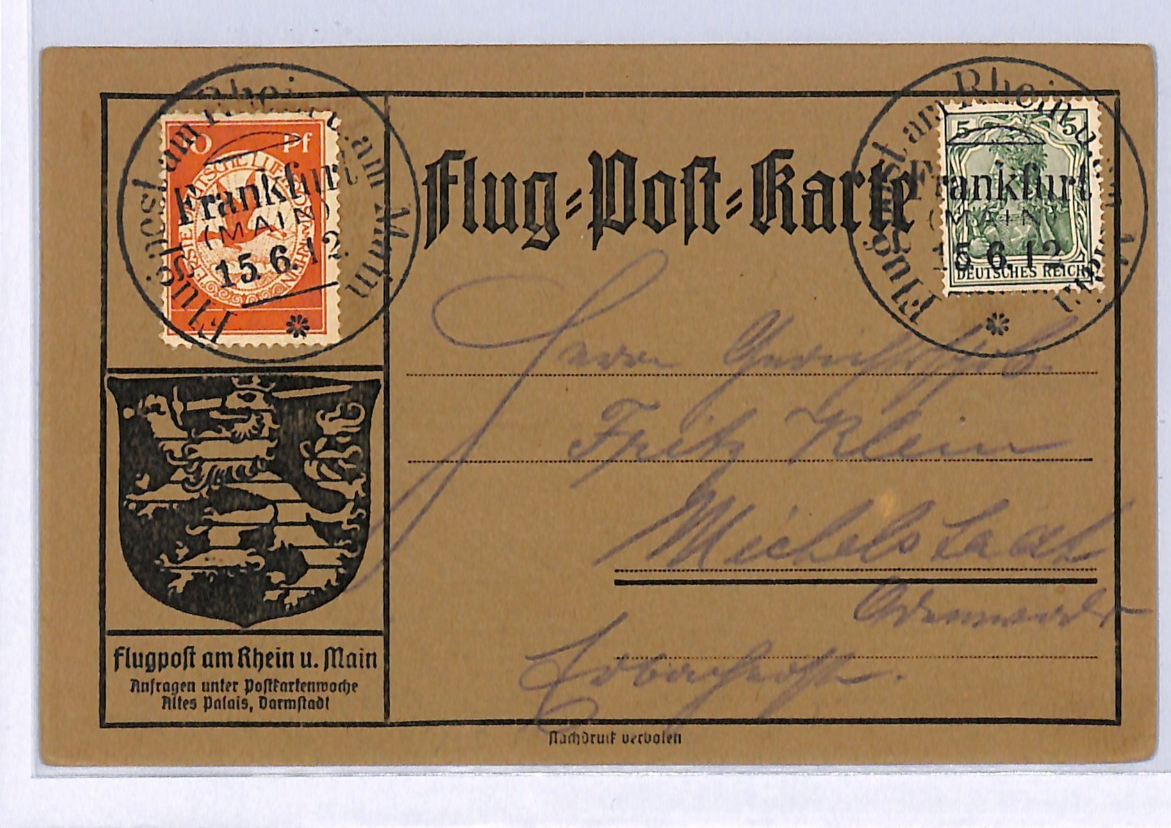 GERMANY Pioneer Air Mail 1912 Card 10pf BIRD Stamp *Frankfurt* 15/6 CDS WD145
