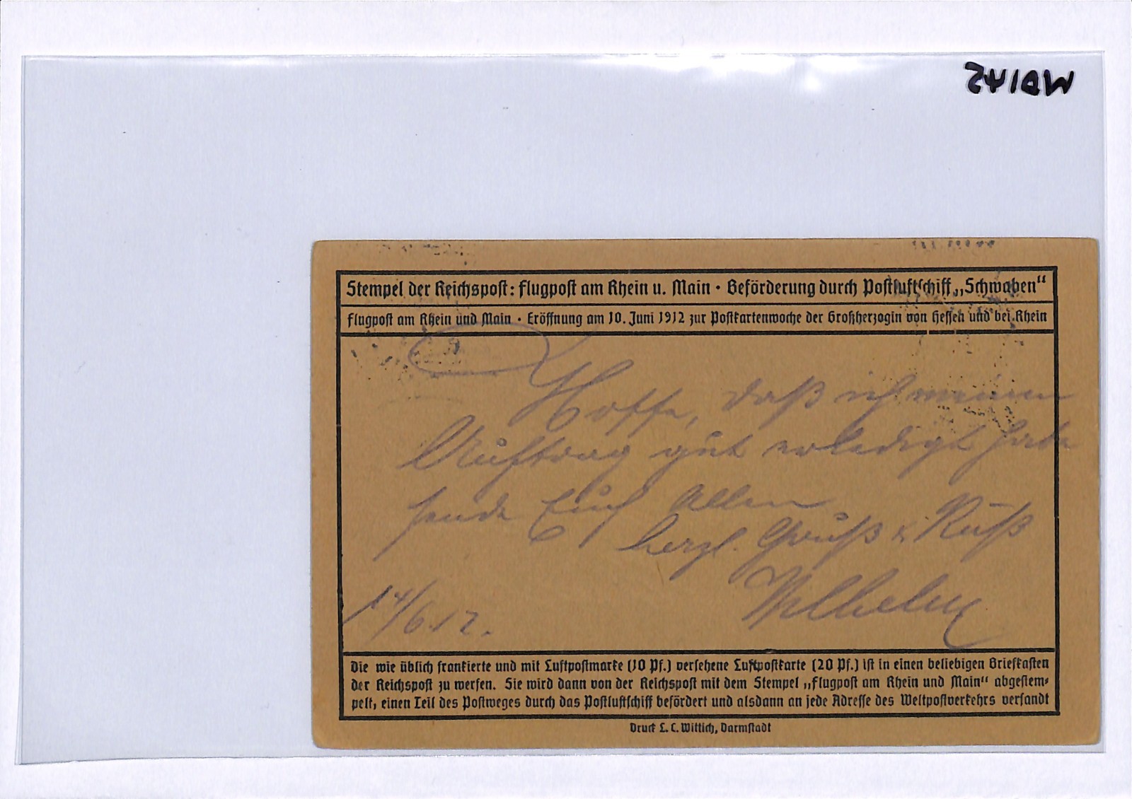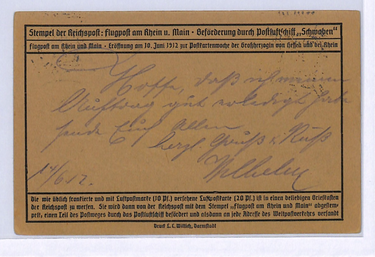 GERMANY Air Mail 1912 ZEPPELIN SCHWABEN Pigeon SEMI-OFFICIAL Frankfurt WD145