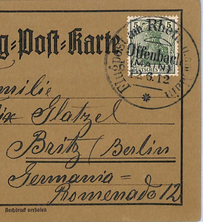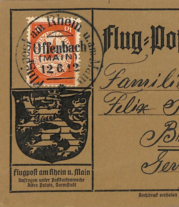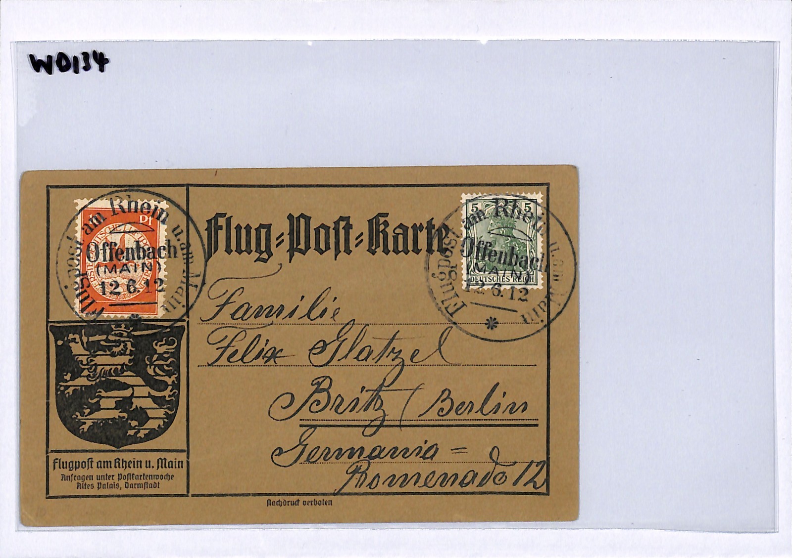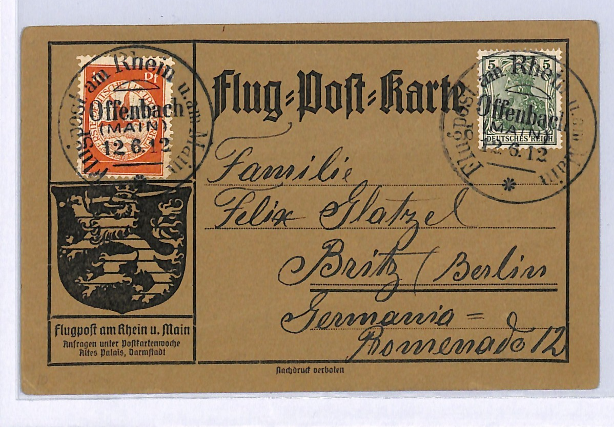 GERMANY Pioneer Air Mail 1912 Card 10pf BIRD Stamp *Offenbach* 12/6 CDS WD134