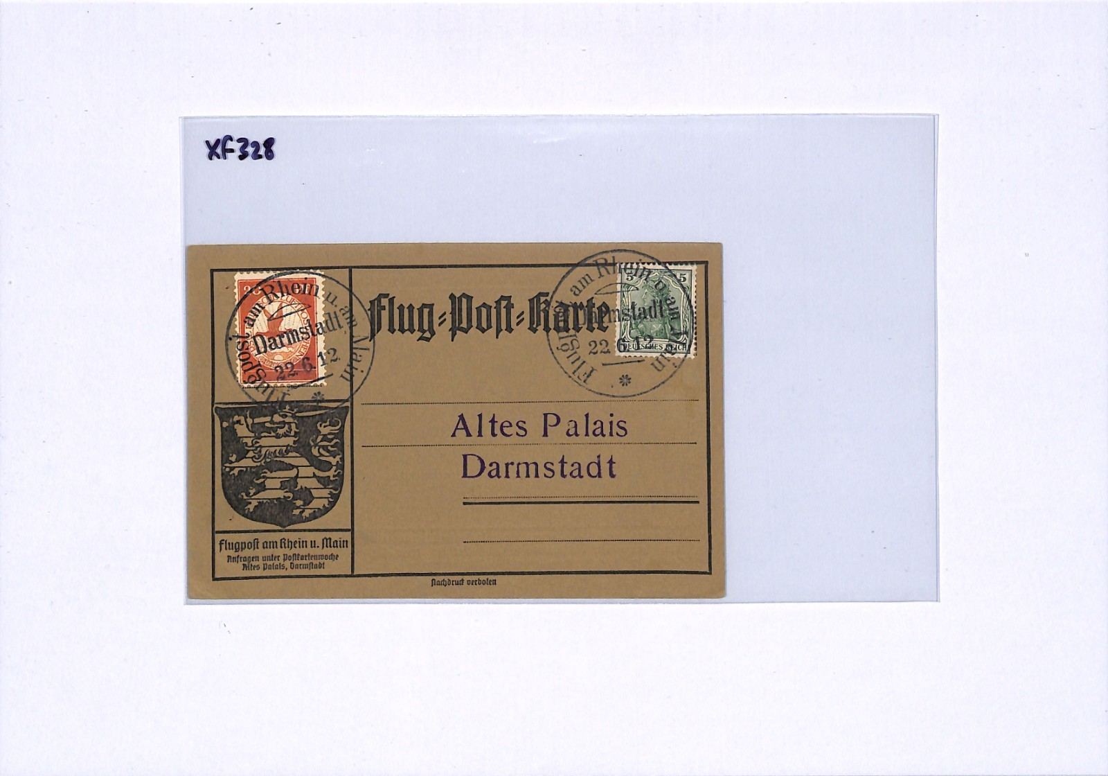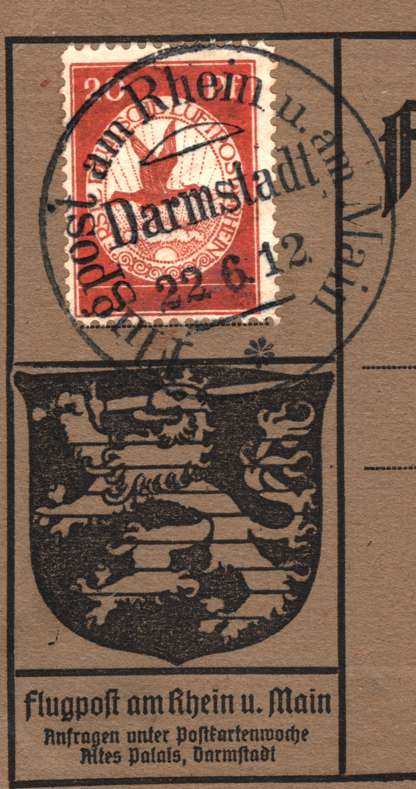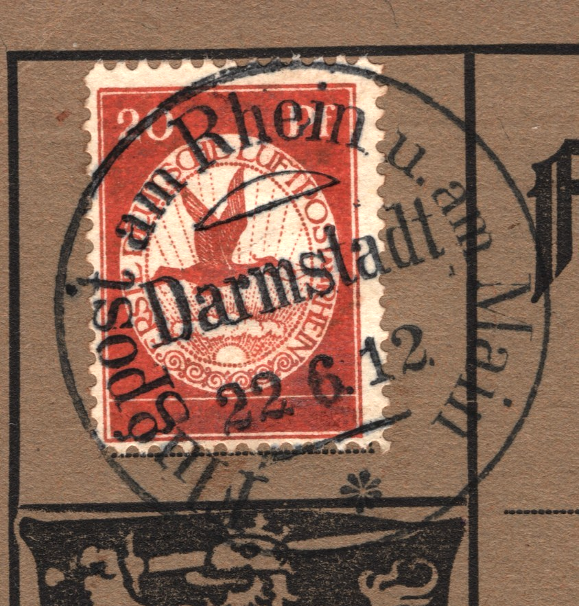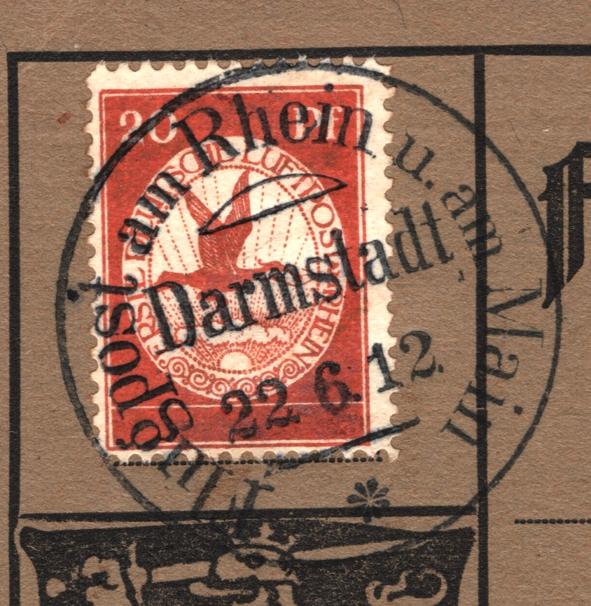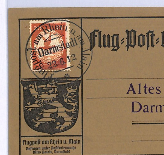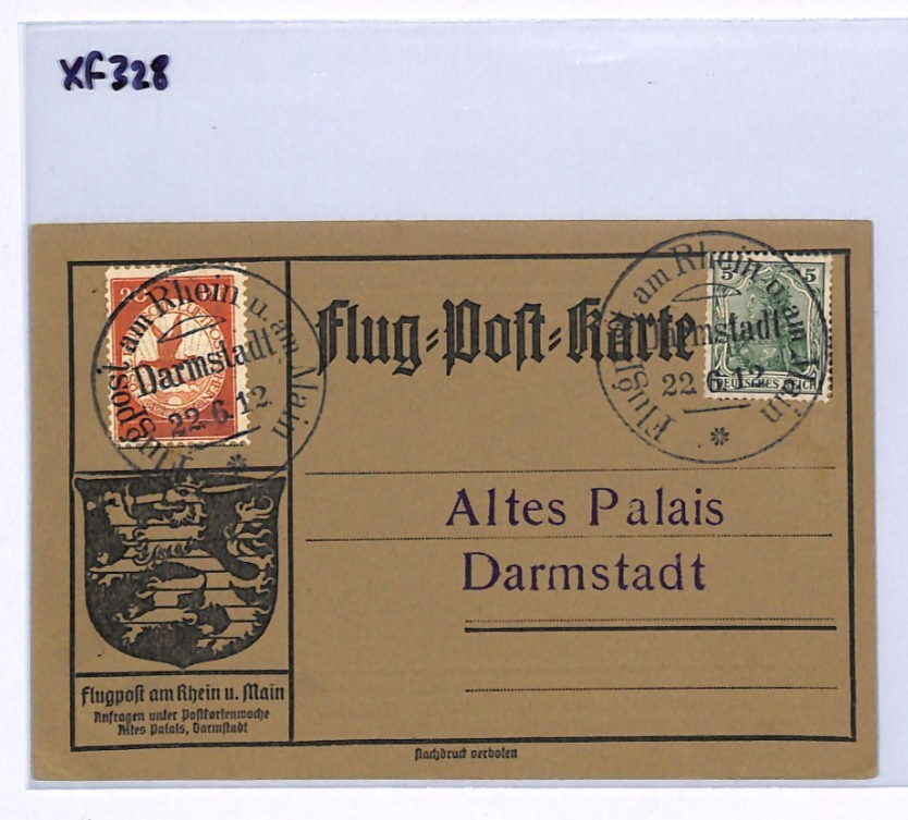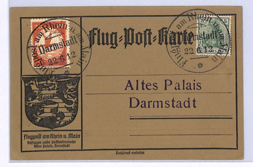 GERMANY Pioneer Air Mail 1912 Card *20pf* BIRD Stamp Darmstadt 22/6 Flight XF328