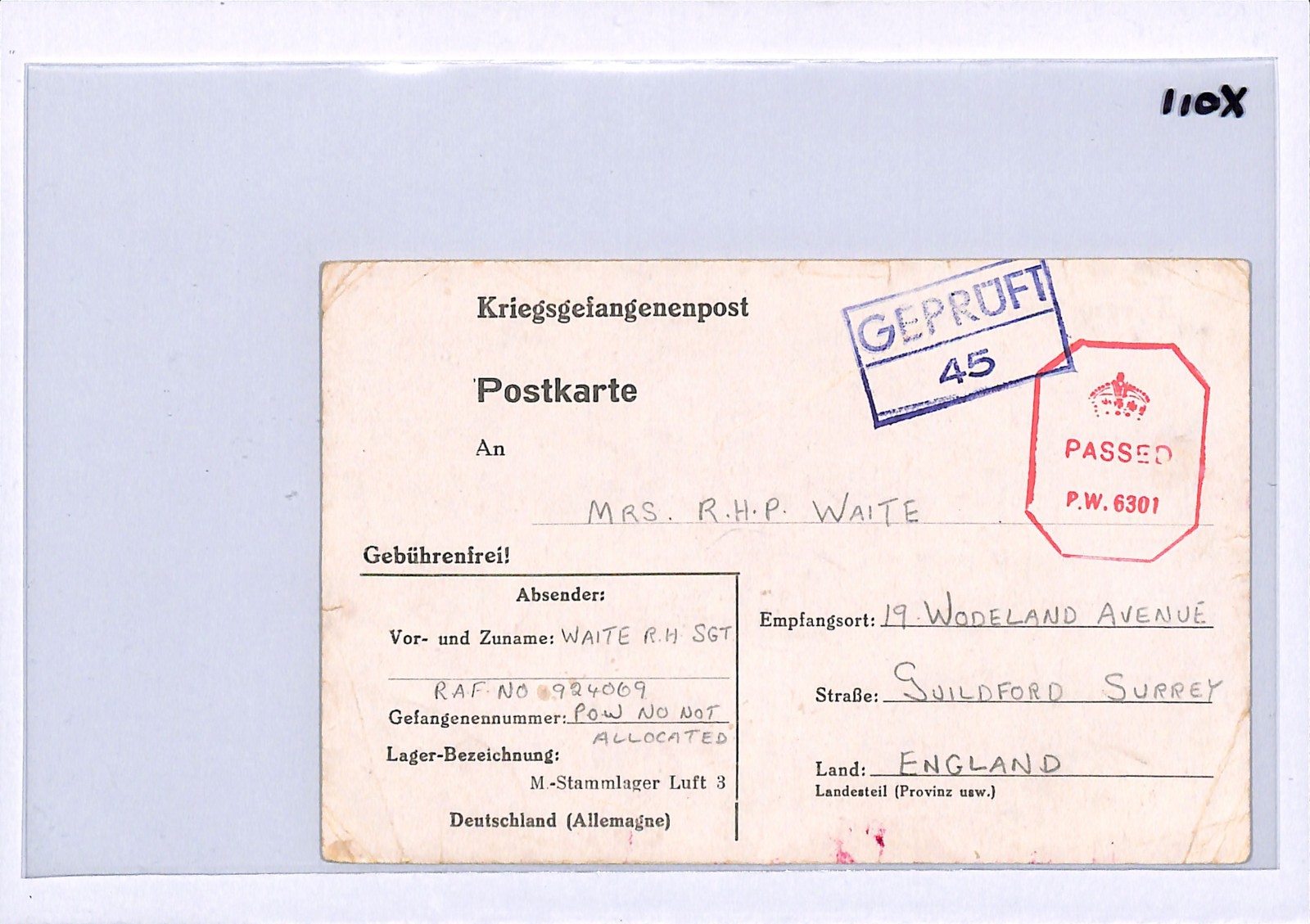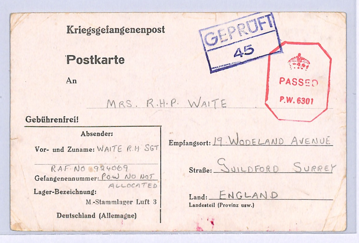 POLAND Germany Occupation WW2 GB RAF POW Card STALAG *LUFT 3* Imprint 1942 Guildford Surrey Sergeant Waite XO11