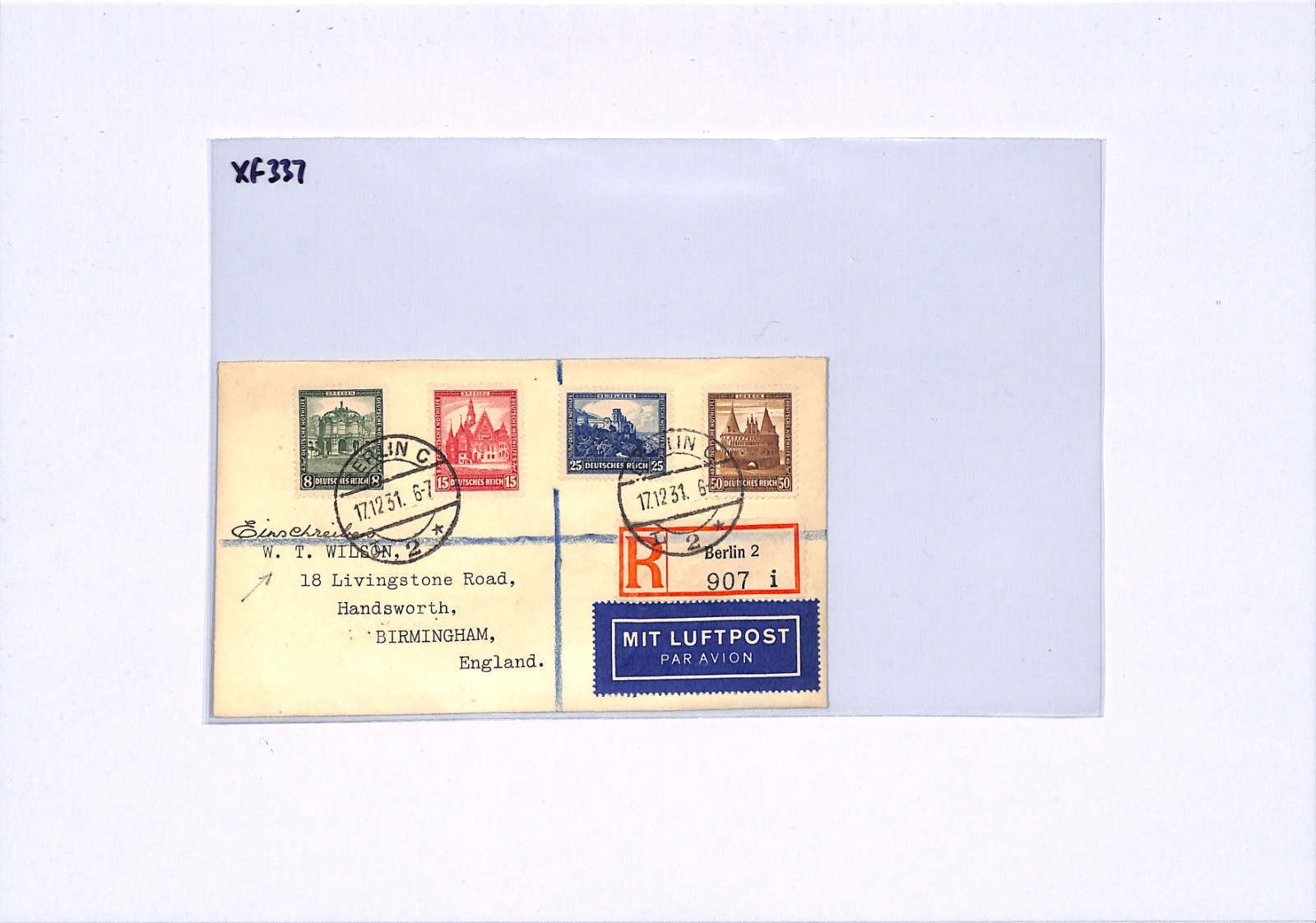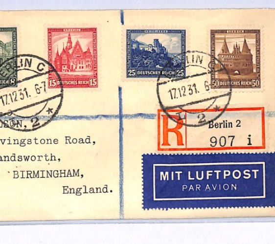 GERMANY Air Mail Cover Berlin Registered GB Birmingham WT Wilson 1931 XF337