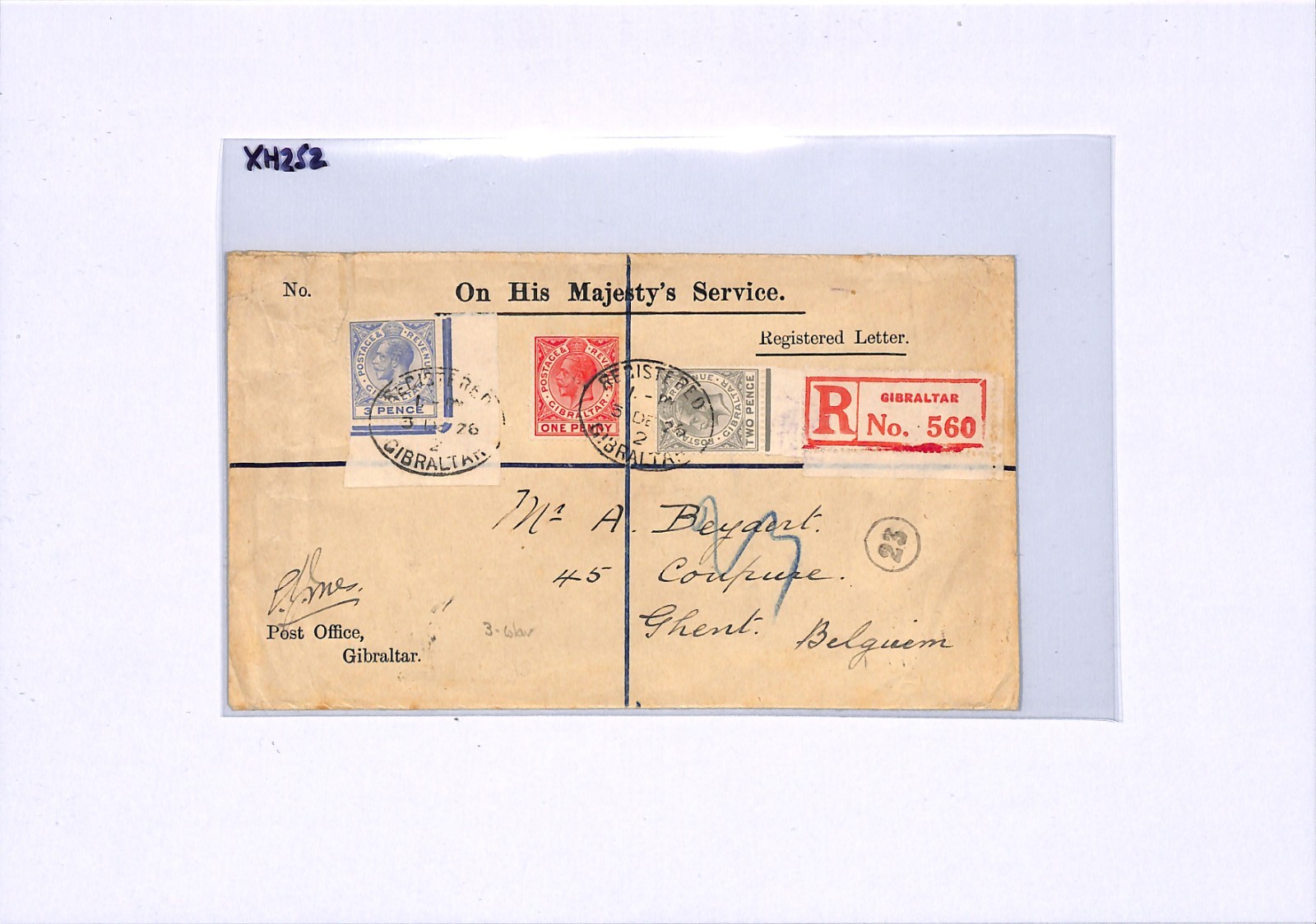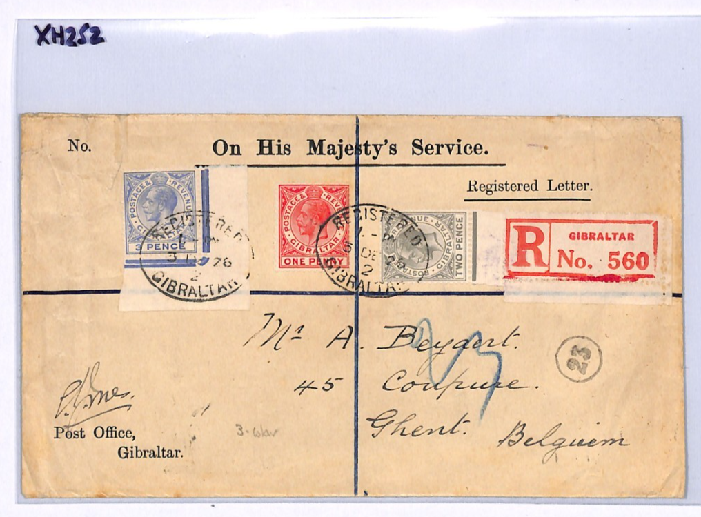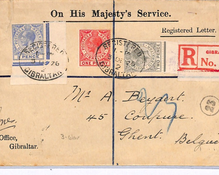 GIBRALTAR Official Cover KGV 3-COLOUR FRANKING 3d Corner Reg 1926 Ghent XH252