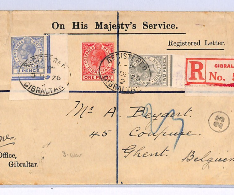 GIBRALTAR Official Cover KGV 3-COLOUR FRANKING 3d Blue Corner Marginal Registered OHMS 1926 Ghent XH252