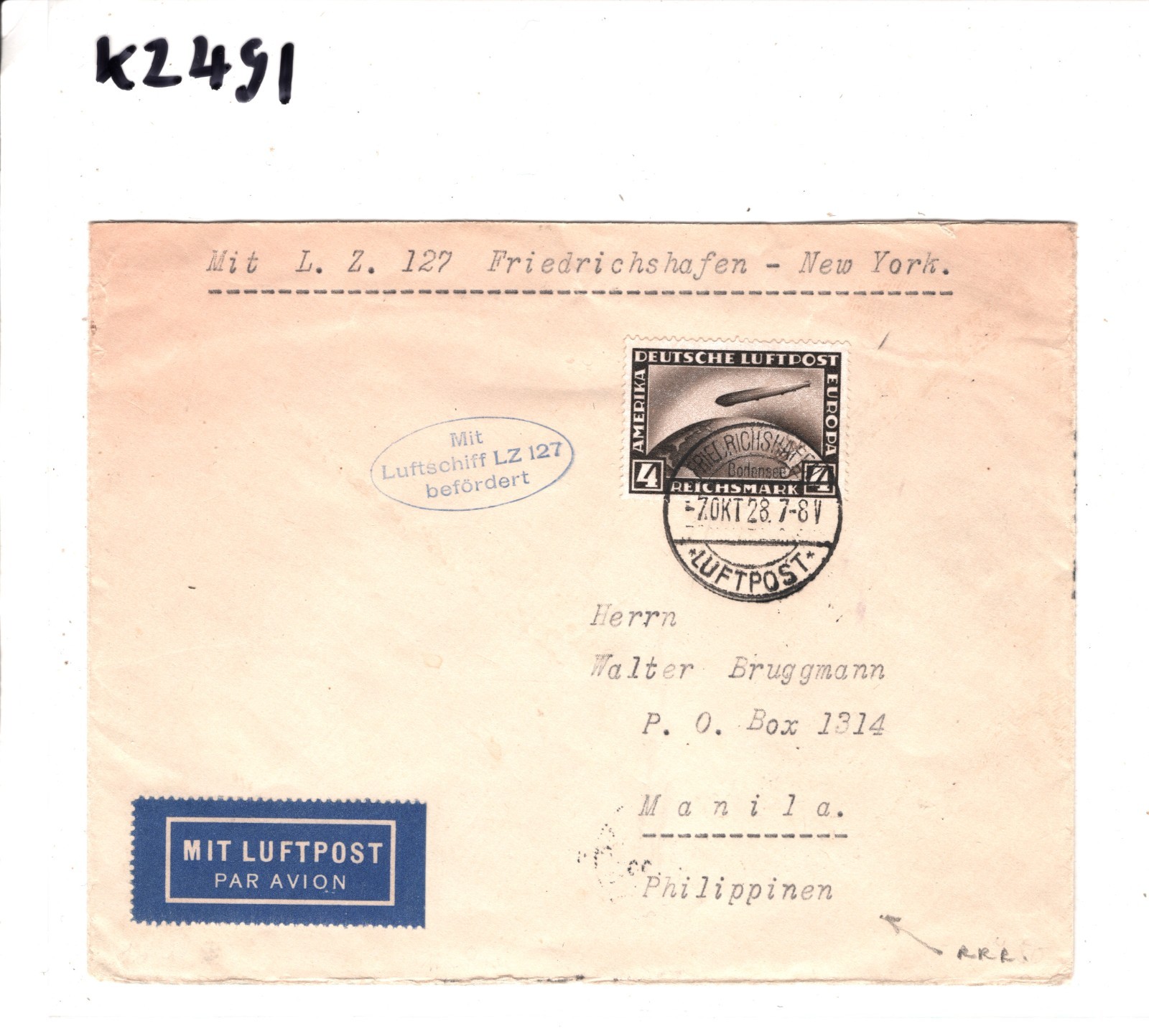 GRAF ZEPPELIN GERMANY Air Mail Cover 1928 PHILIPPINES Manila via USA NY KZ491