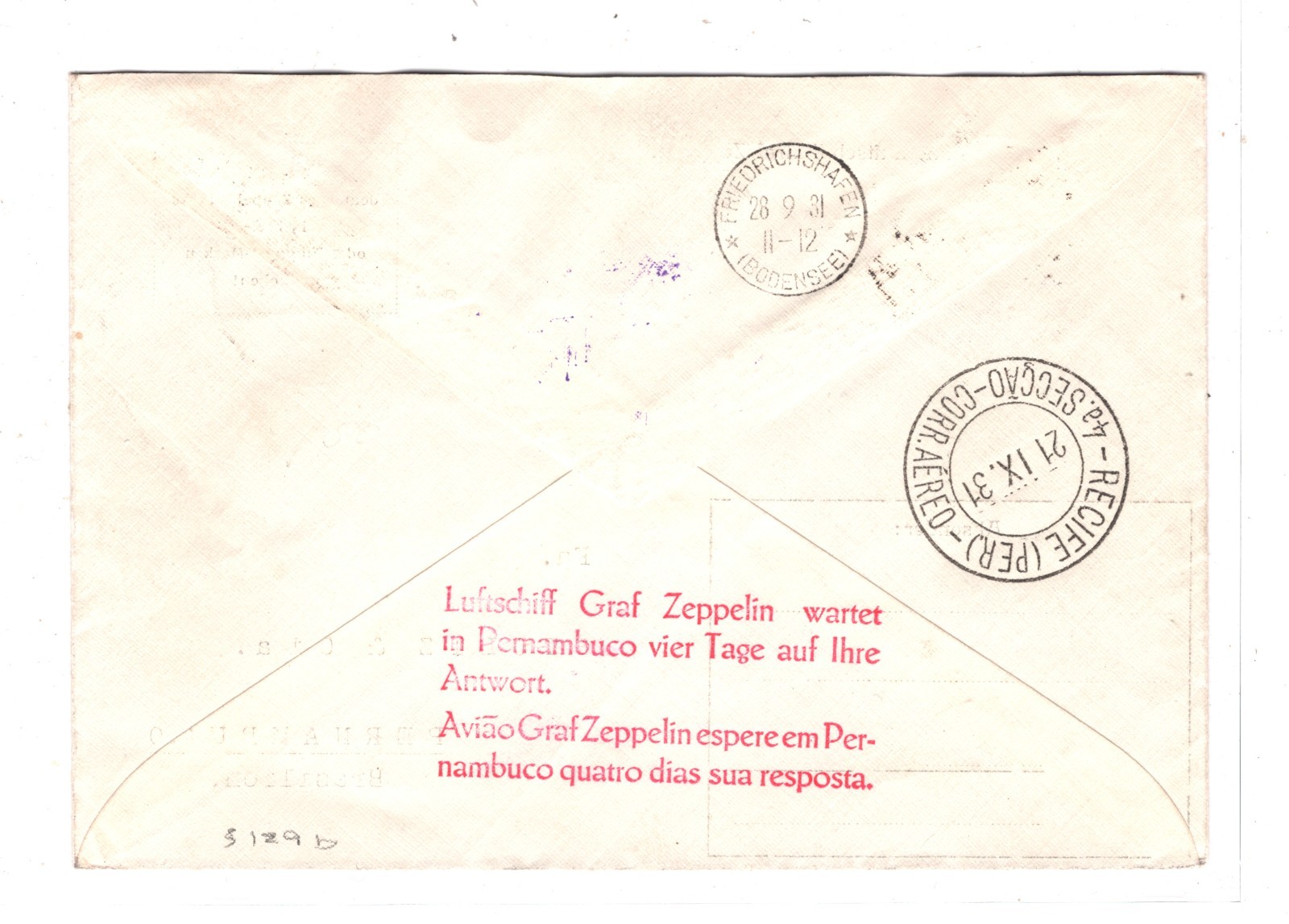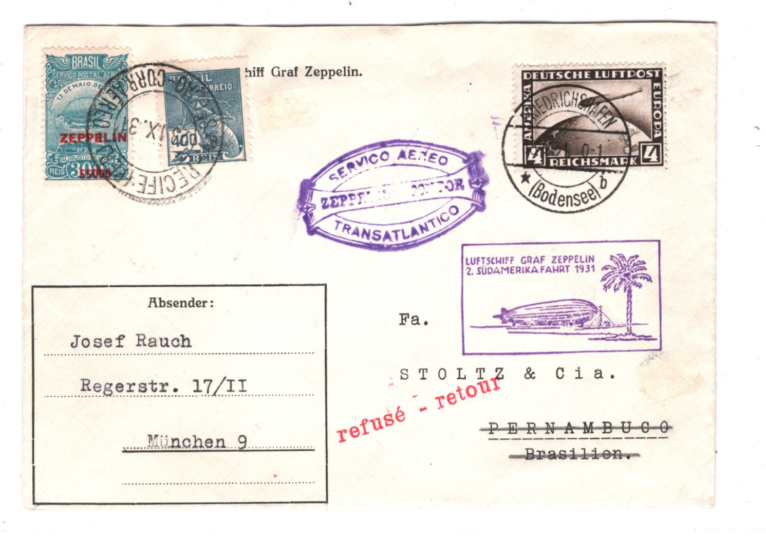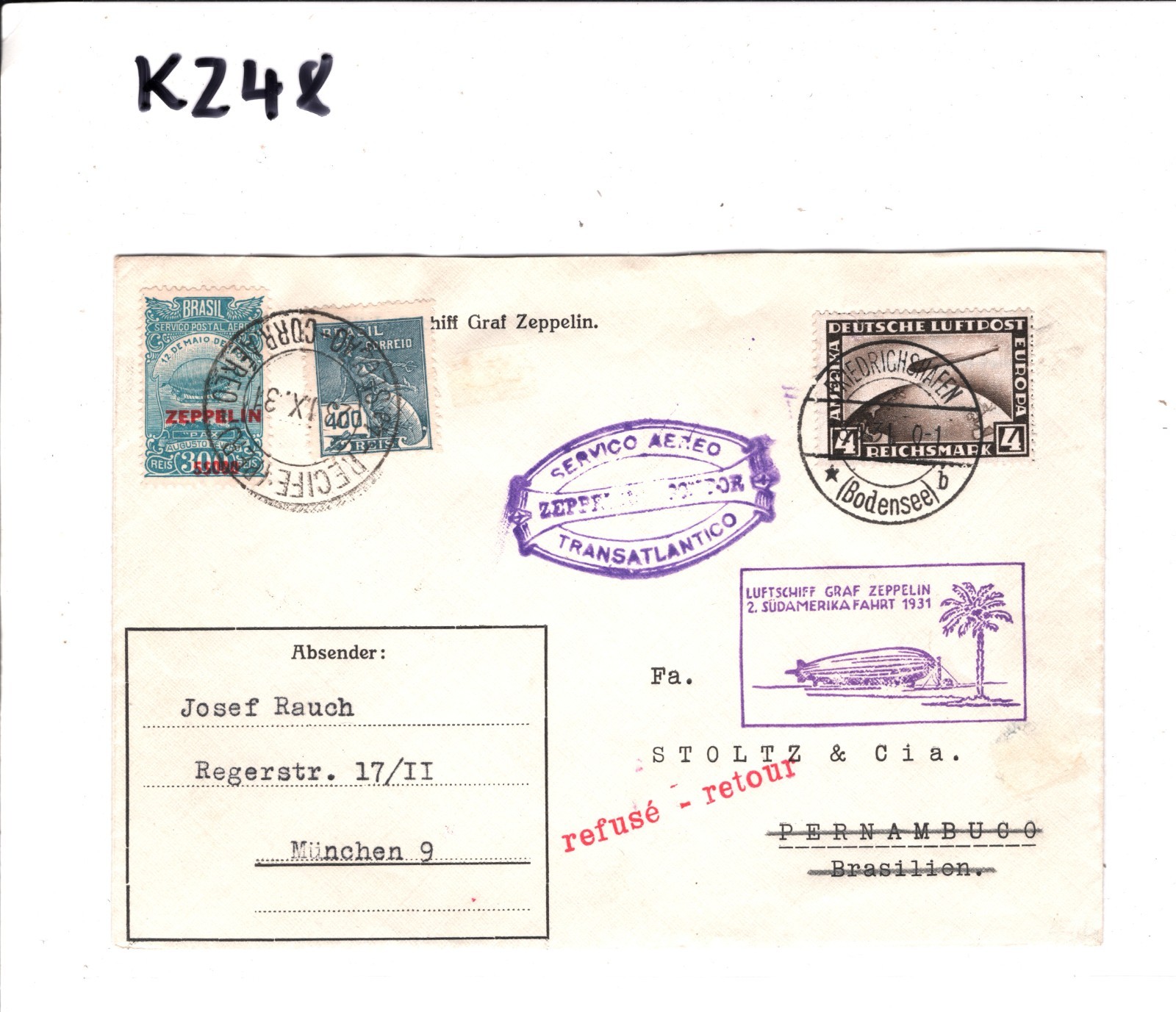 GRAF ZEPPELIN GERMANY Air Mail Cover 1931 2 SÜDAMERIKAFAHRT BRAZIL Recife Munich Retour KZ48