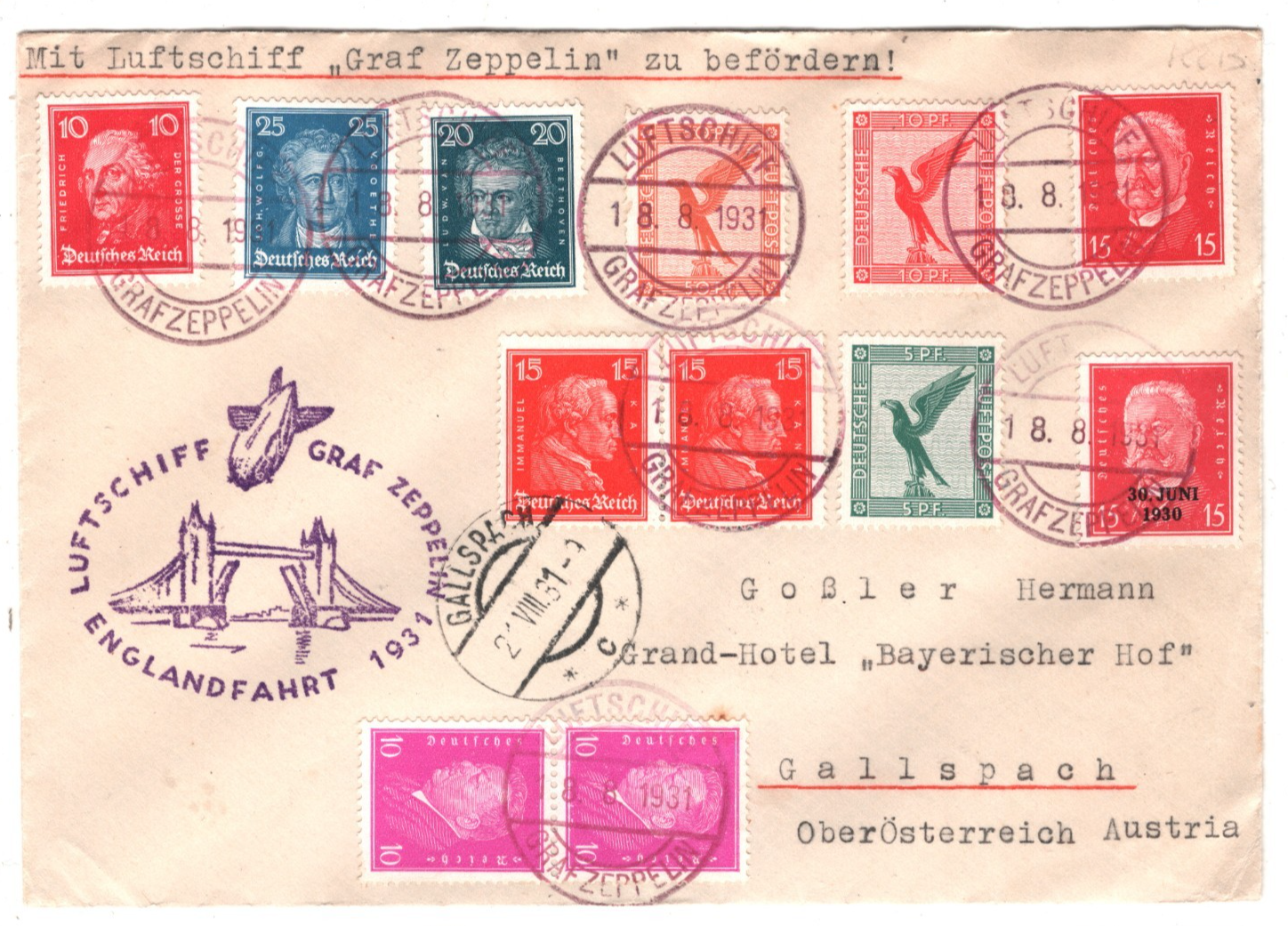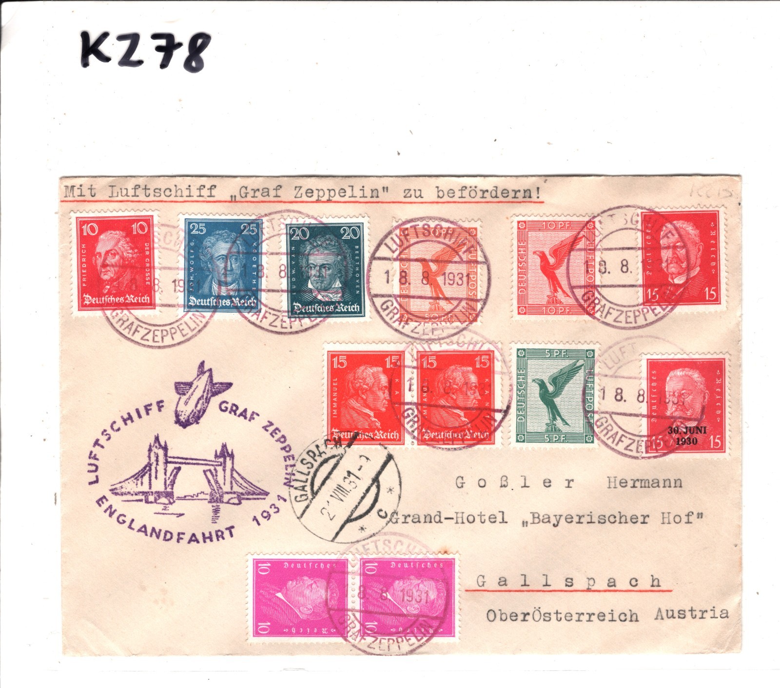 GRAF ZEPPELIN Air Mail 1m Cover Germany 1931 ENGLANDFAHRT AUSTRIA Gallspach KZ78