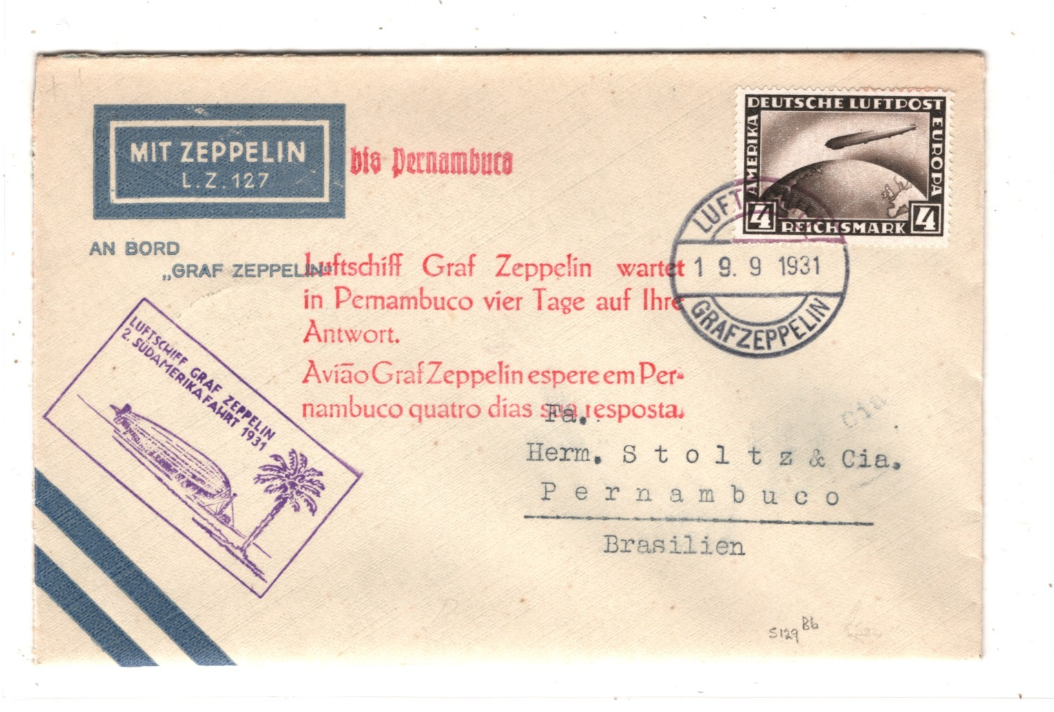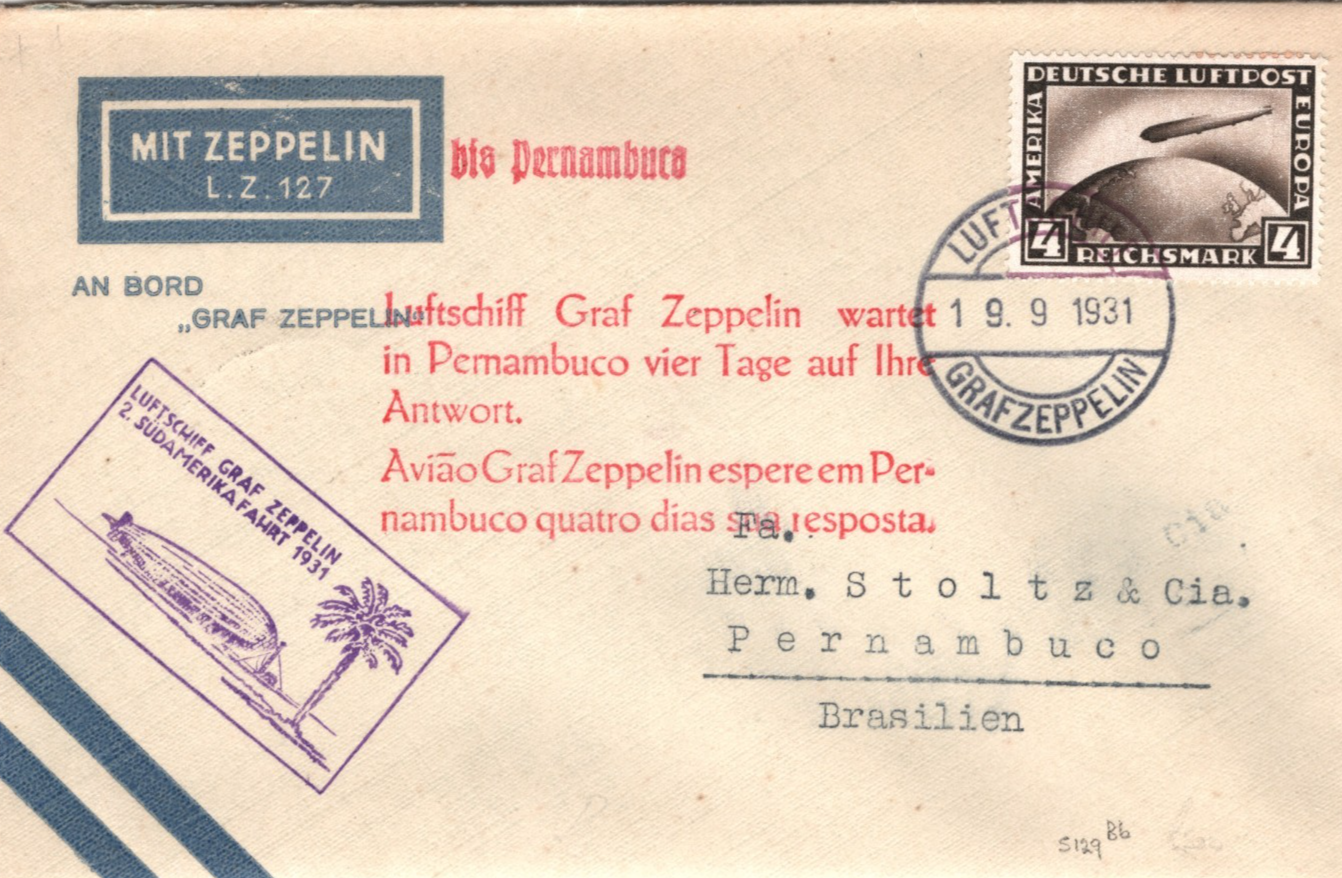 GRAF ZEPPELIN Air Mail 4m AN BORD Cover *2.SÜDAMERIKAFAHRT* 1931 Brazil KZ107