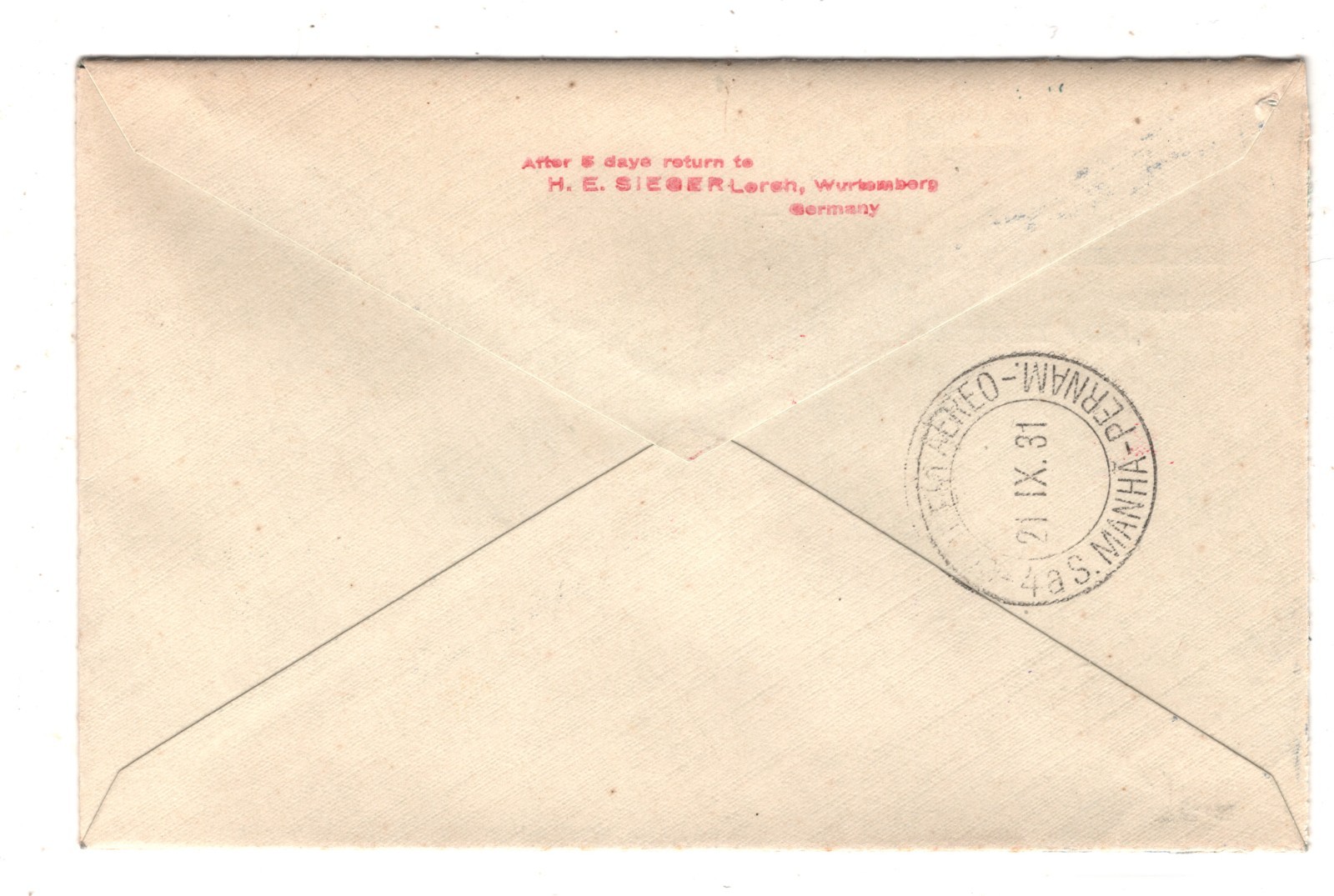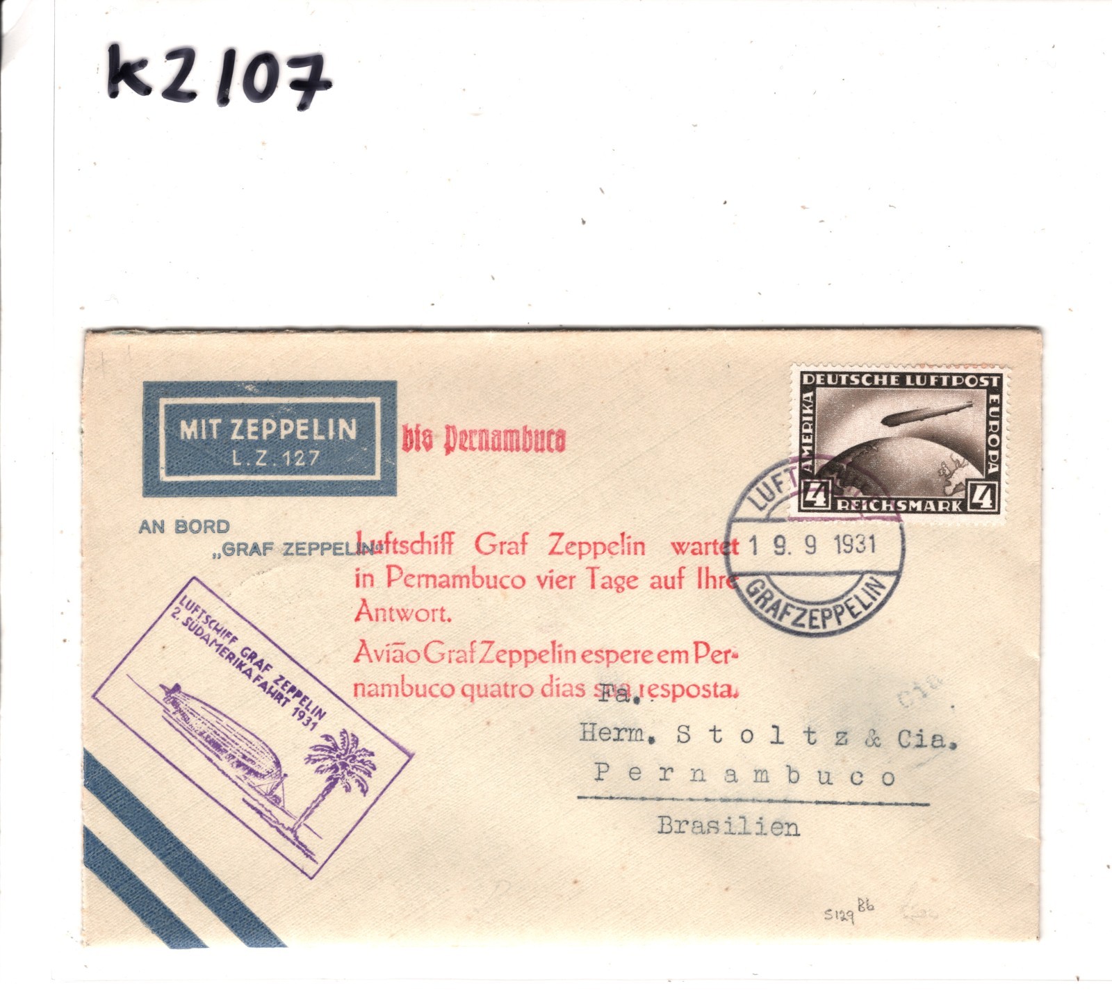 GRAF ZEPPELIN Air Mail Cover 2 SÜDAMERIKAFAHRT 1931 BRAZIL Pernambuco KZ107