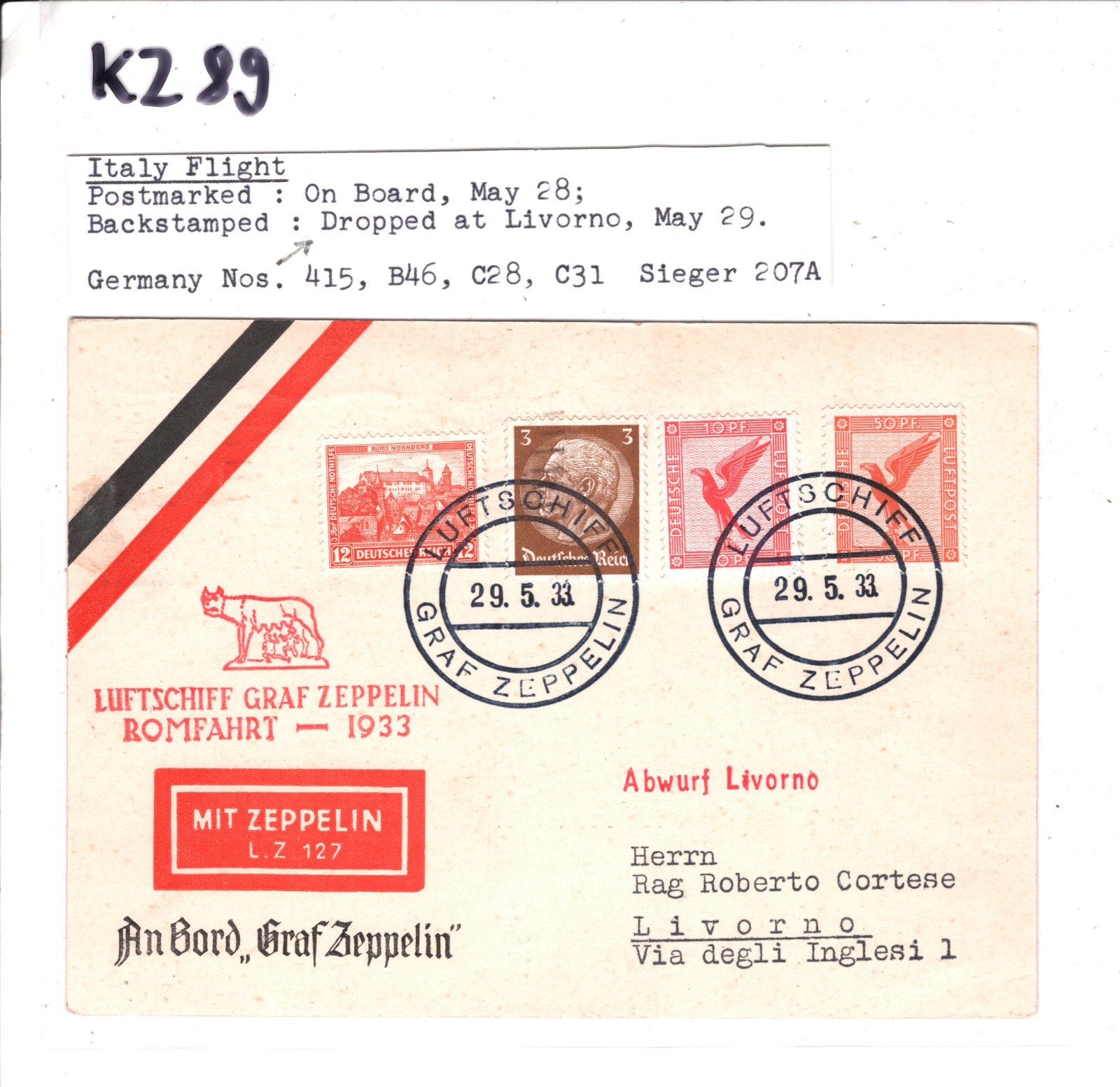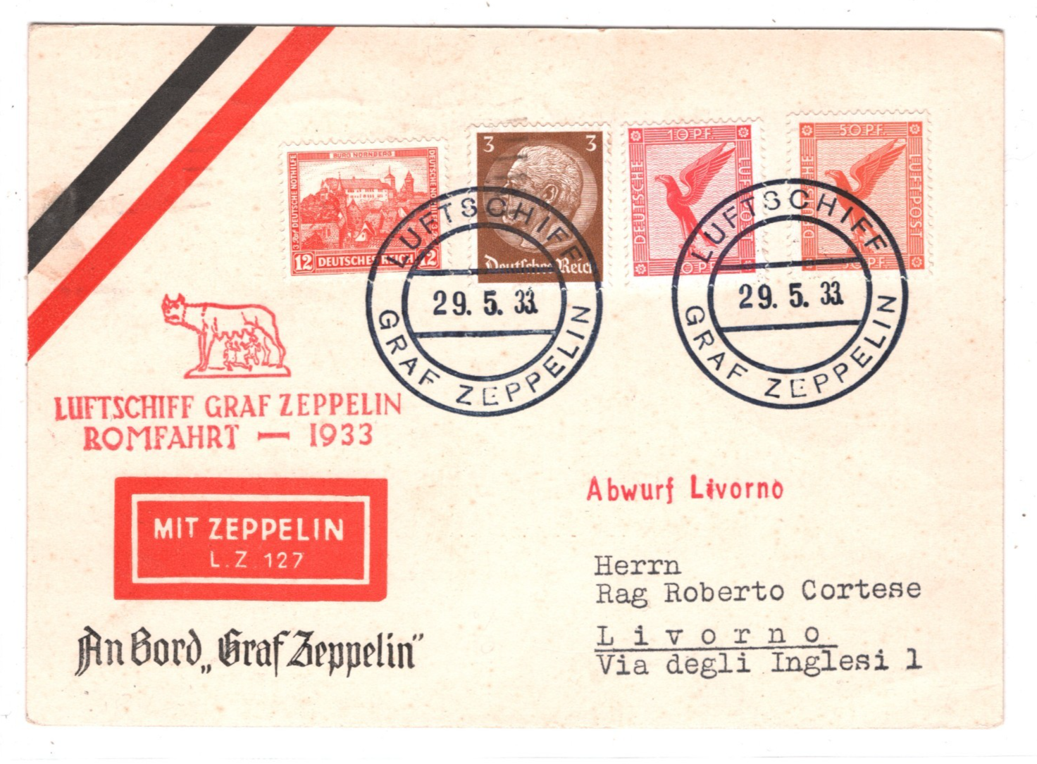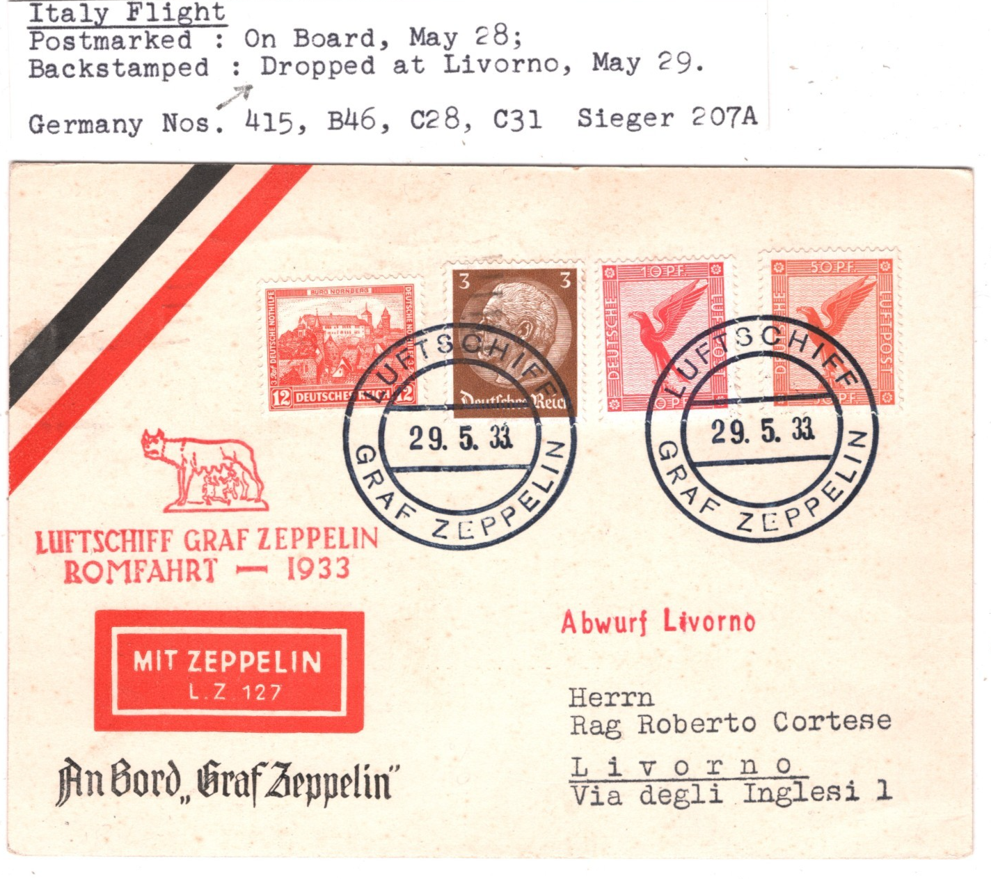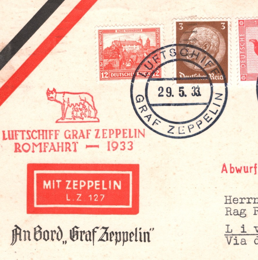 GRAF ZEPPELIN Air Mail AN BORD Card ROMFAHRT 1933 Italy *LIVORNO DROP* Mail KZ89