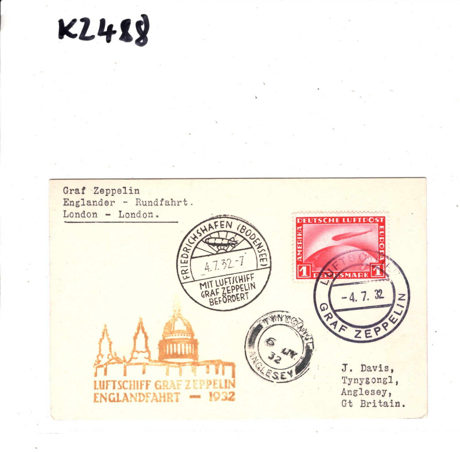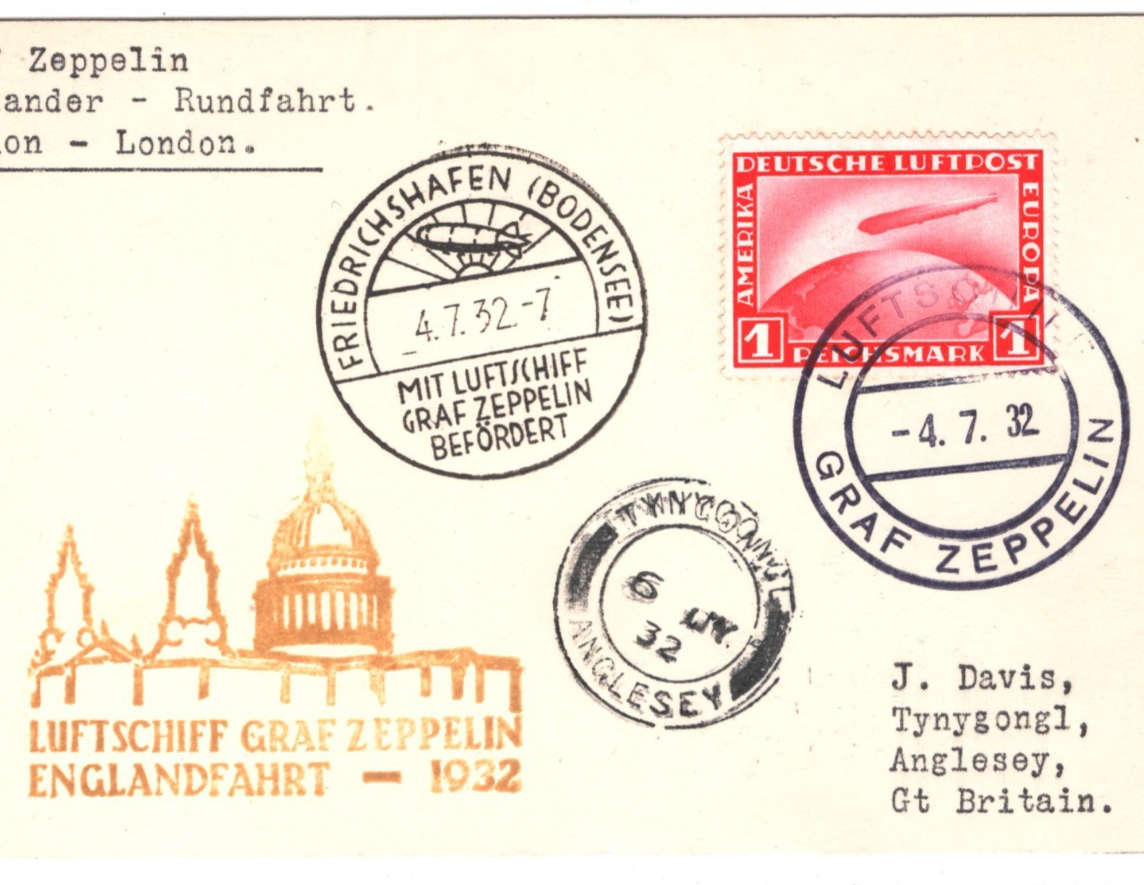 GRAF ZEPPELIN GERMANY Air Mail Card 1932 ENGLANDFAHRT GB Wales Tynygongl KZ488