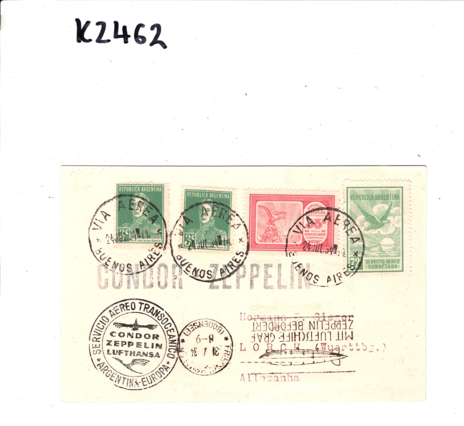 GRAF ZEPPELIN Card ARGENTINA Air Mail 1934 CONDOR B. Aires GERMANY Lorch KZ462