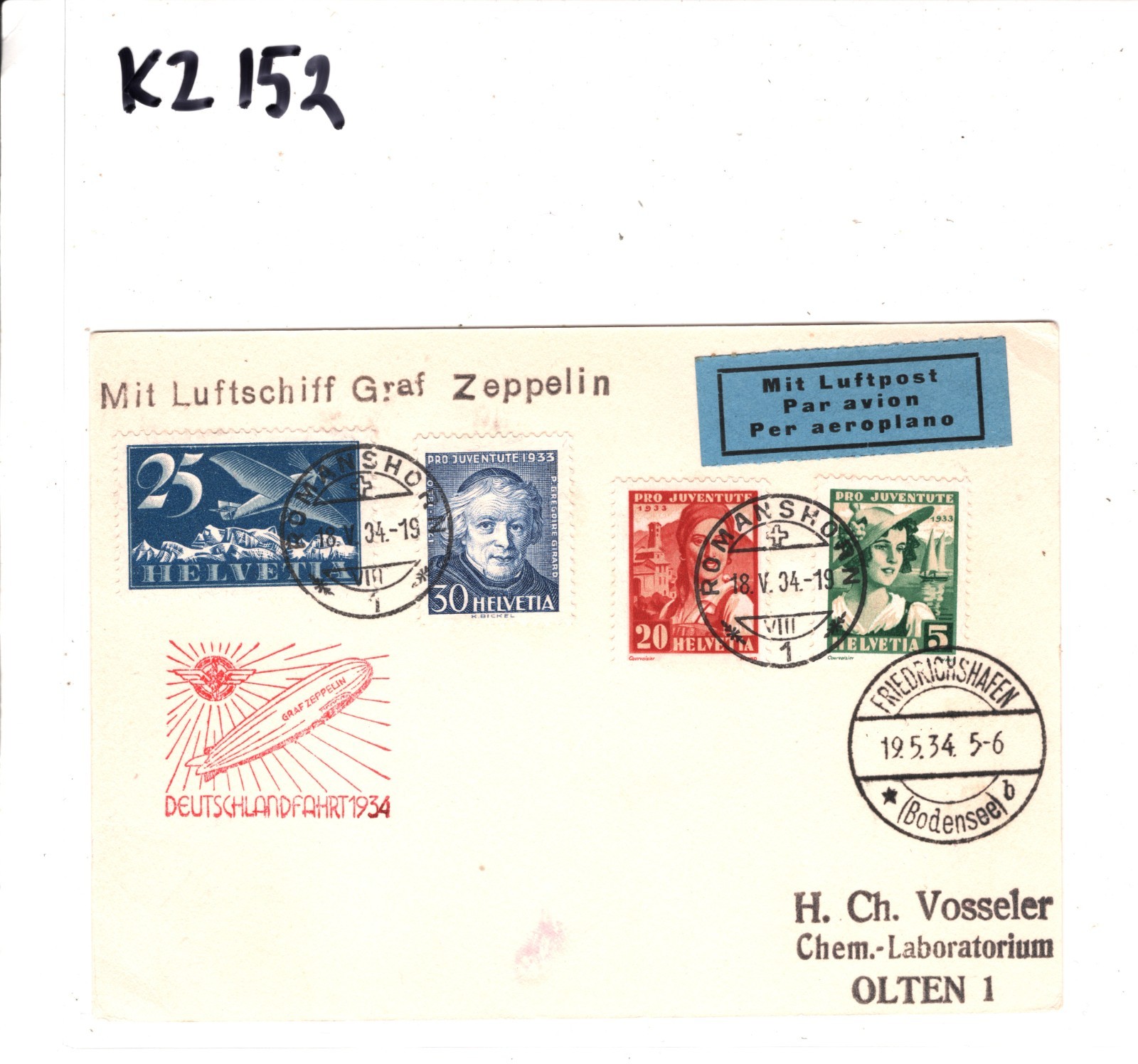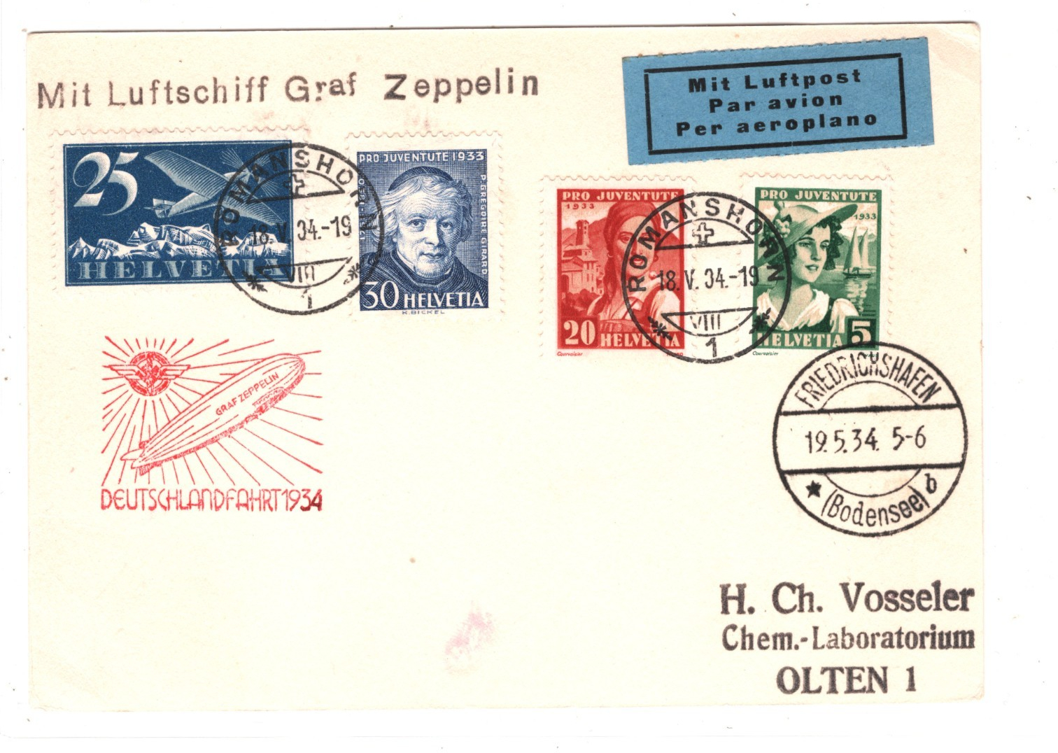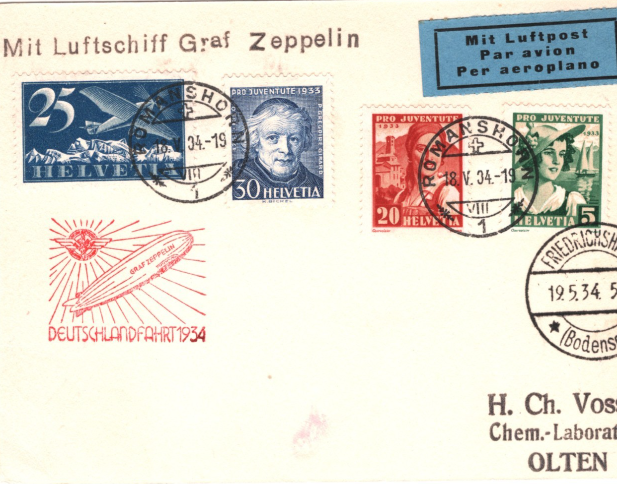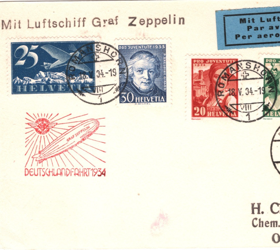 GRAF ZEPPELIN SWITZERLAND Card Air Mail *1934 DEUTSCHLANDFAHRTEN* Olten Romanshorn KZ152