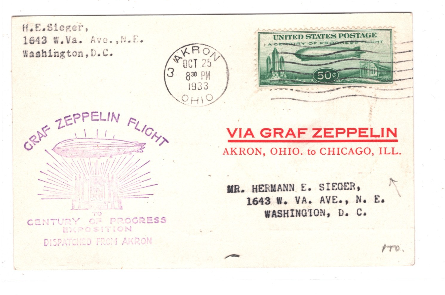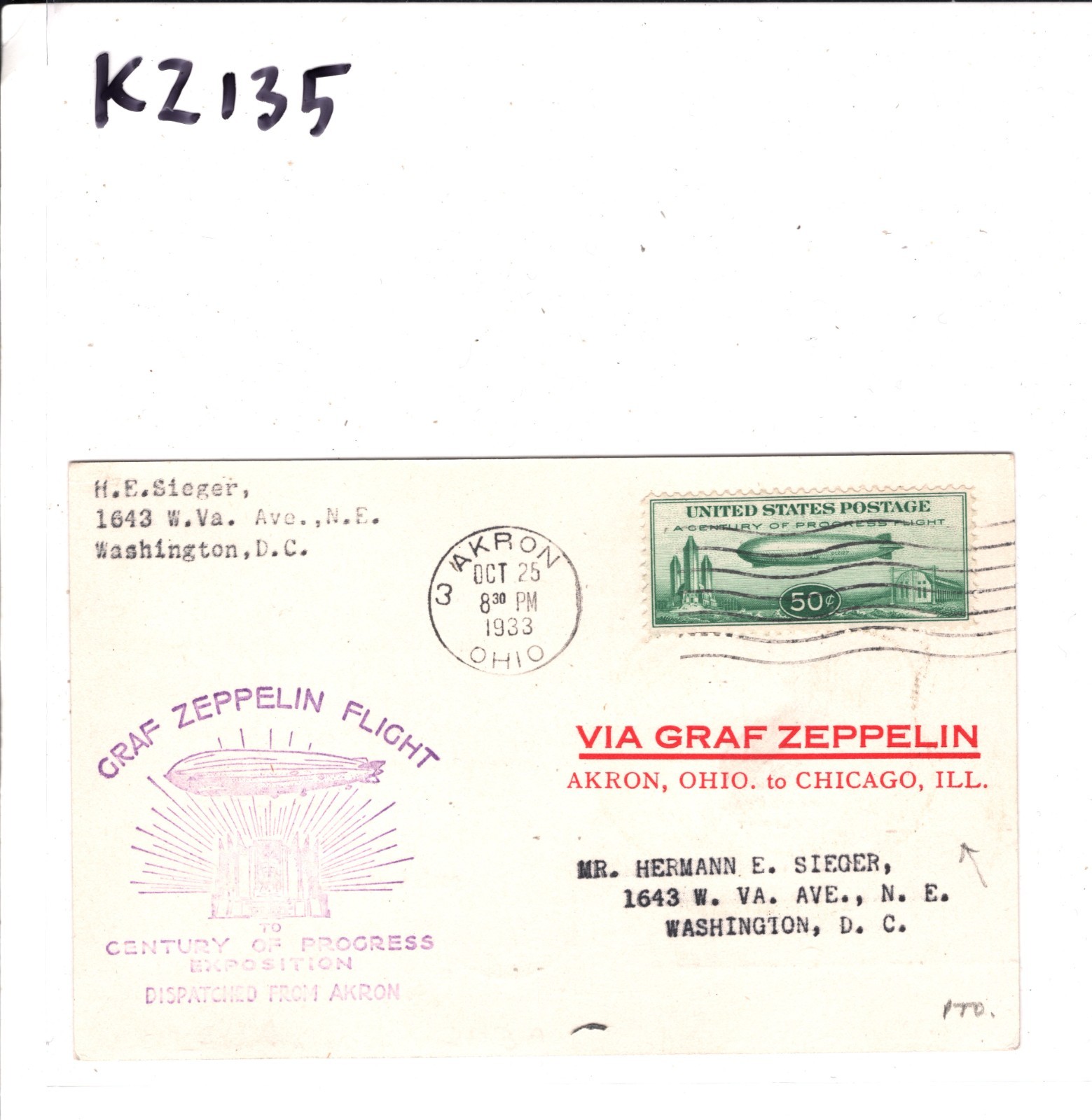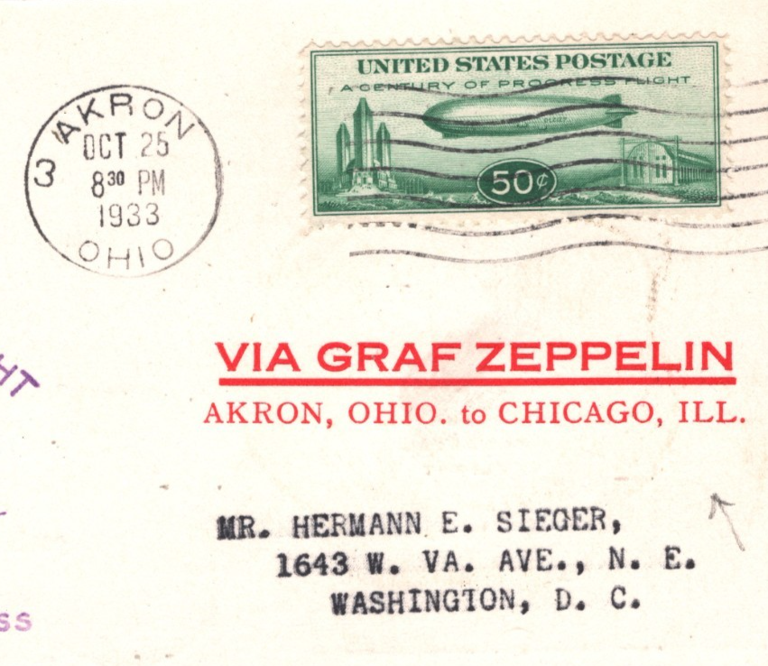 GRAF ZEPPELIN USA Air Mail Card CENTURY OF PROGRESS CHICAGO AKRON WASHINGTON DC 1933 KZ135