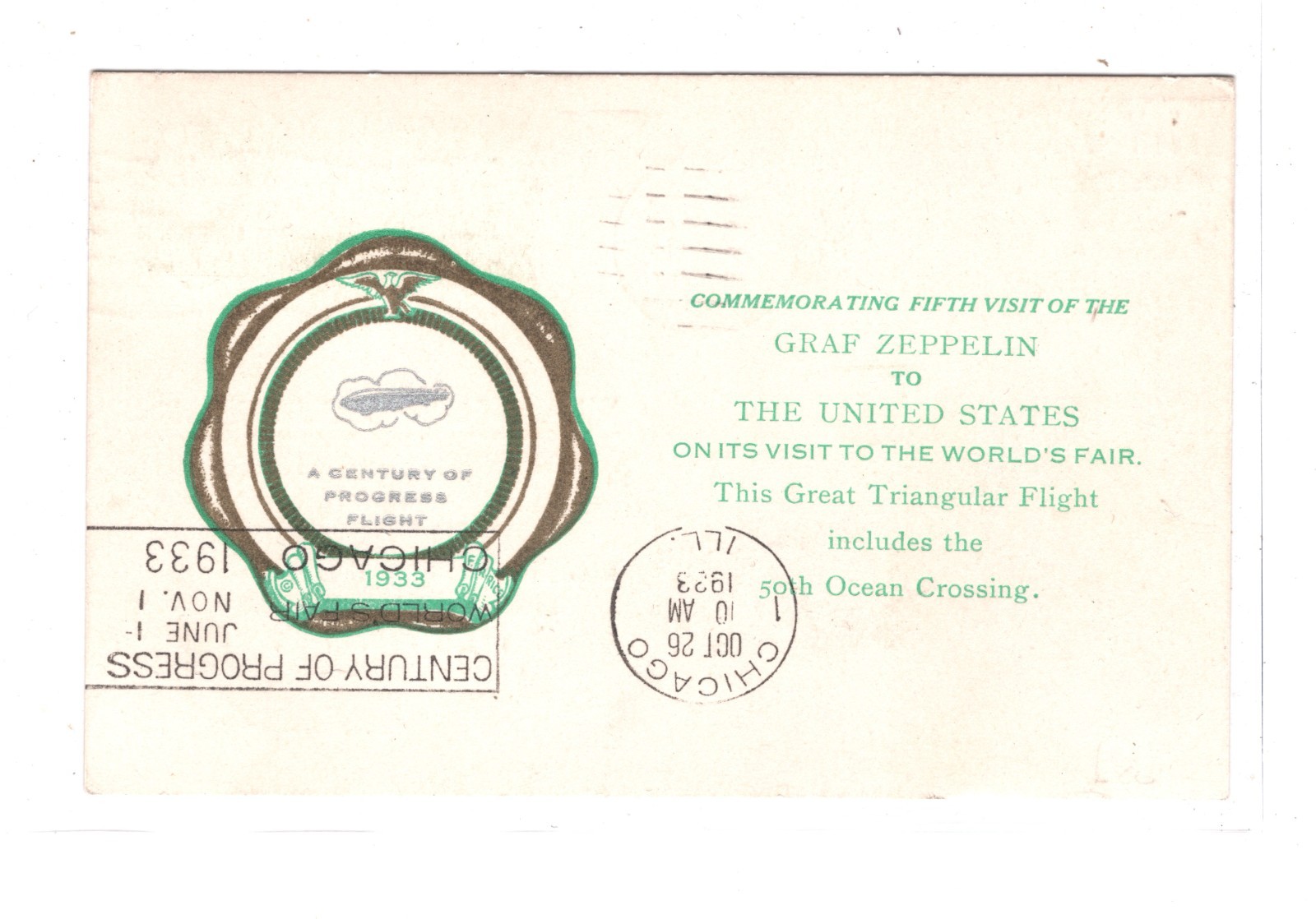 GRAF ZEPPELIN Card USA #C18 50c Air Mail 1933 *TRIANGULAR FLIGHT* Cachet KZ135
