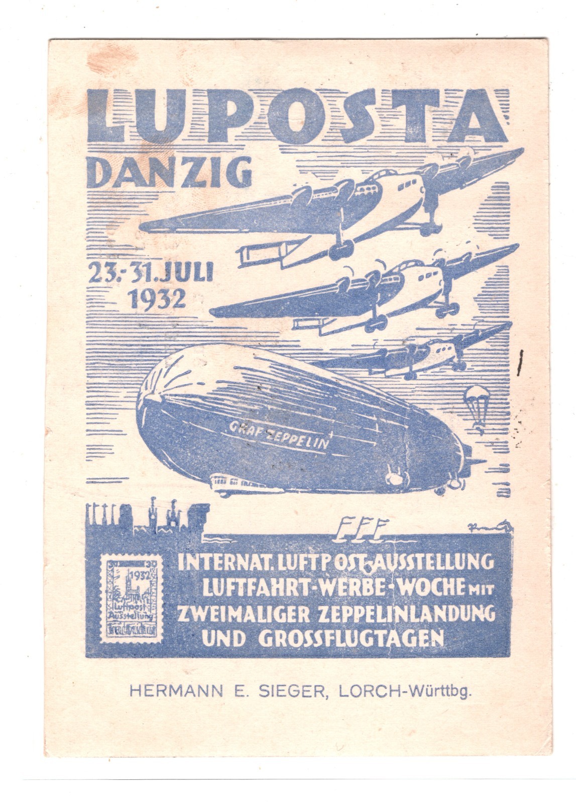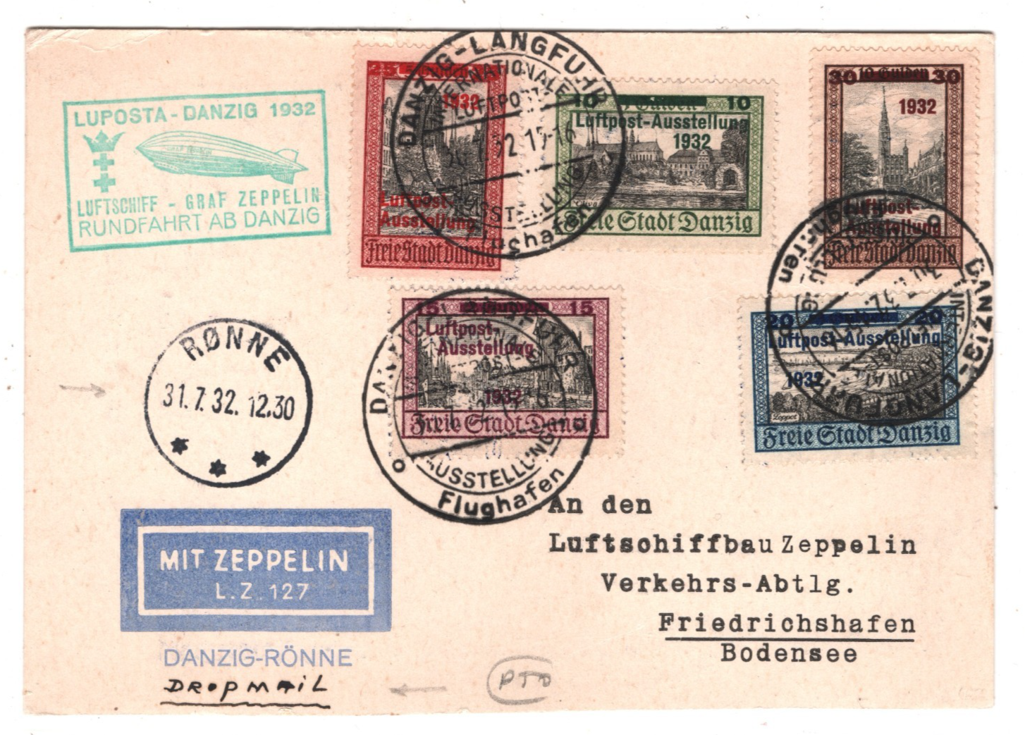 GRAF ZEPPELIN Cover *DANZIG* Treaty Air Mail 1932 LUPOSTA Rønne DROP-MAIL KZ396