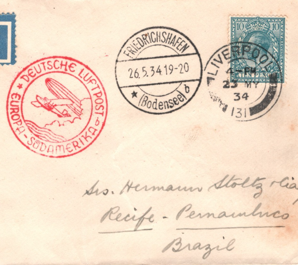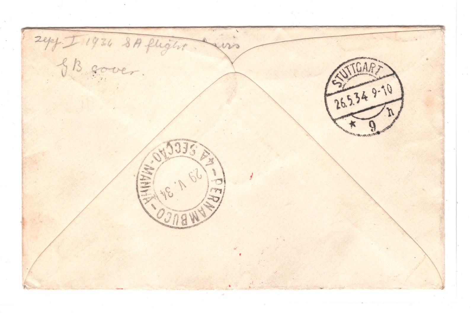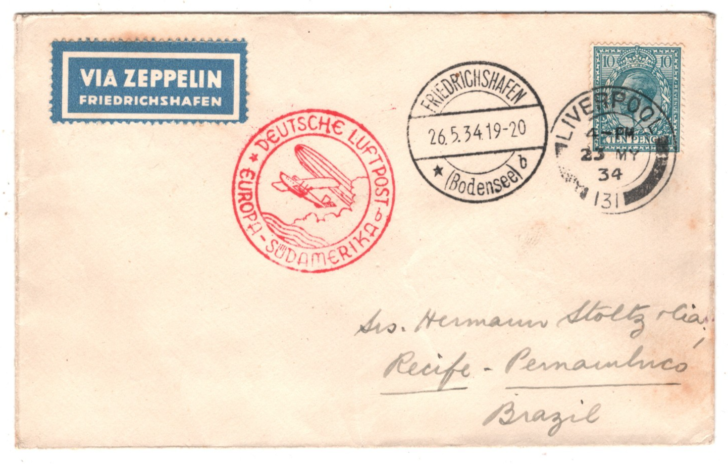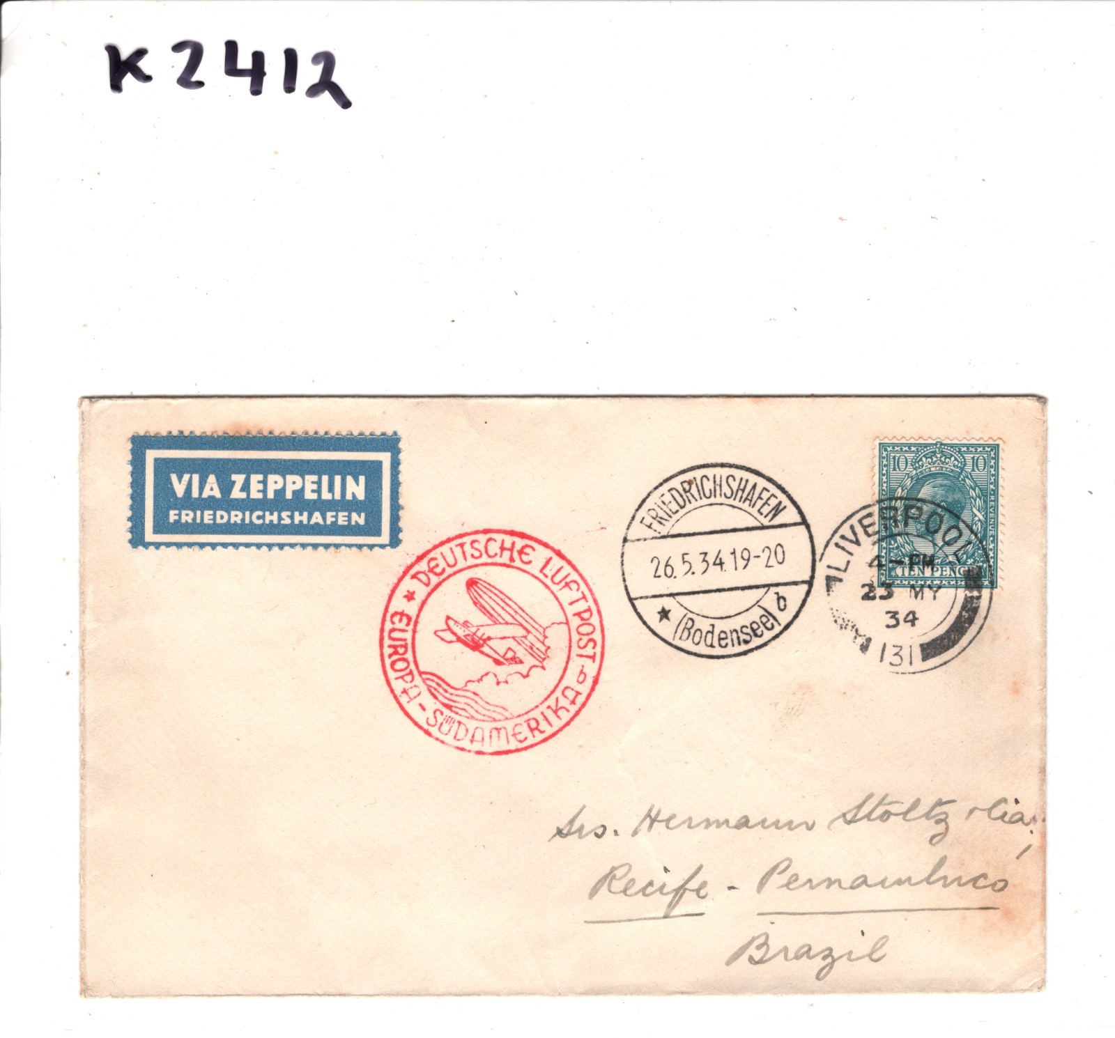 GRAF ZEPPELIN GB Air Mail Cover Liverpool BRAZIL Pernambuco via Germany Stuttgart Friedrichshafen 1934 KZ412