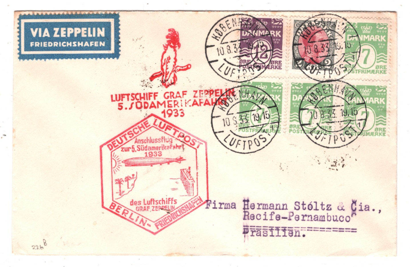 GRAF ZEPPELIN DENMARK Air Mail Cover SÜDAMERIKAFAHRT BRAZIL Recife Pernambuco Copenhagen 1933 KZ439