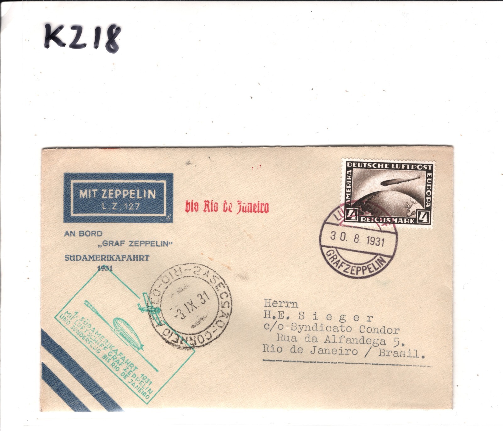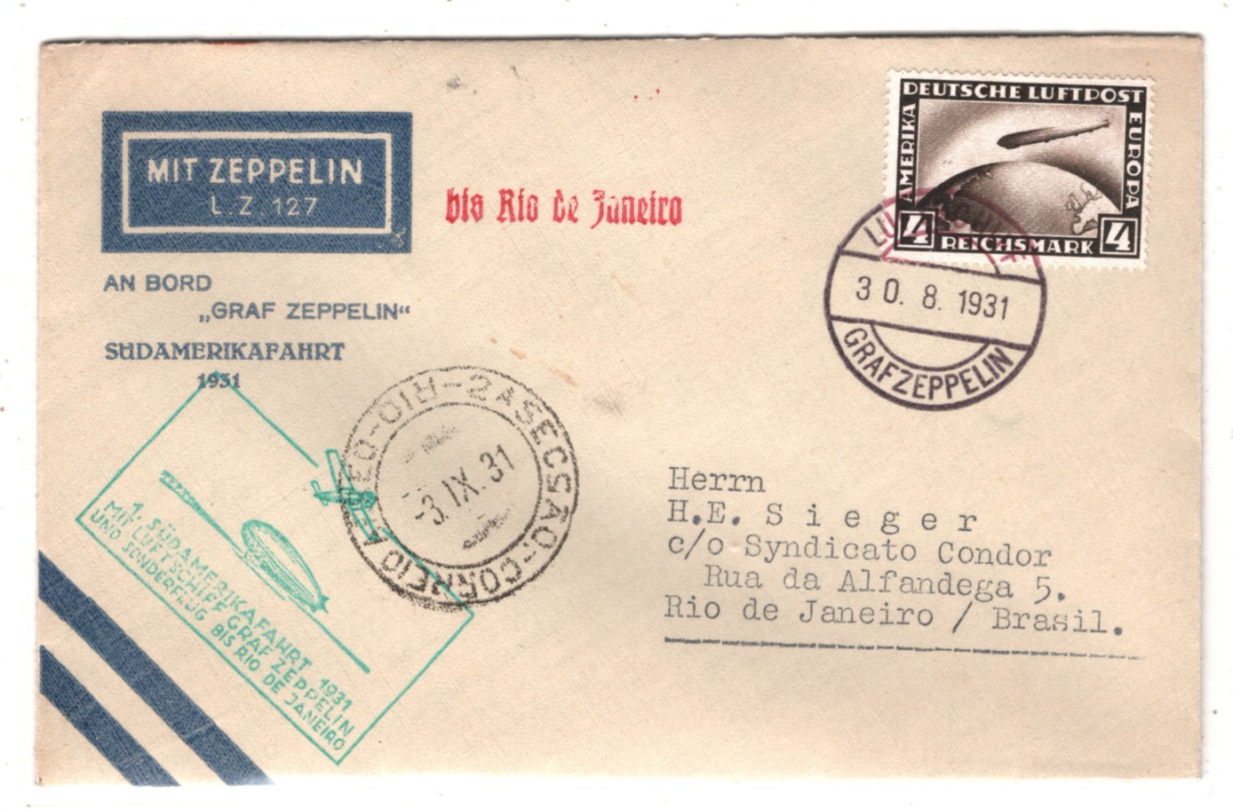 GRAF ZEPPELIN GERMANY Air Mail Cover 1931 1 SÜDAMERIKAFAHRT BRAZIL Rio de Janeiro KZ18
