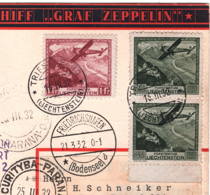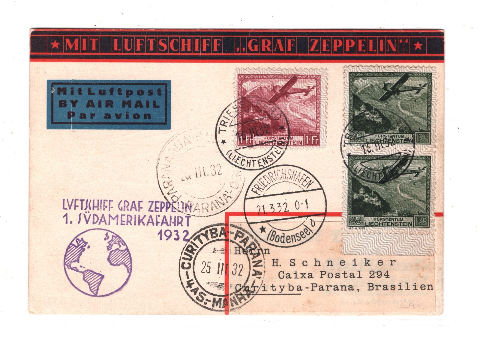 GRAF ZEPPELIN LIECHTENSTEIN Air Mail Card SÜDAMERIKAFAHRT 1932 BRAZIL Curityba Parana Triesenberg KZ477