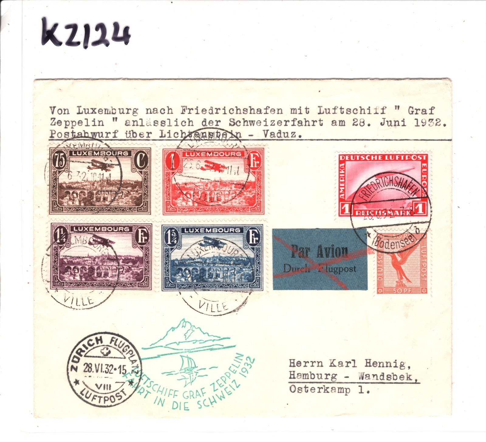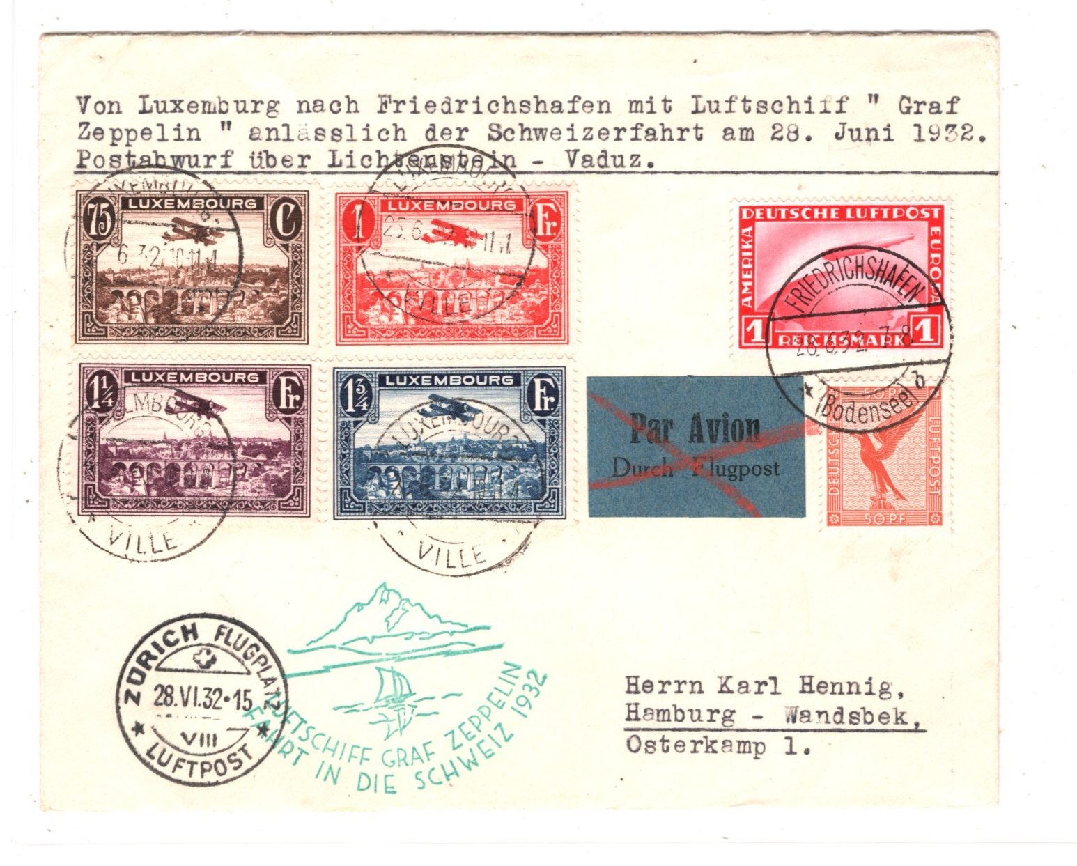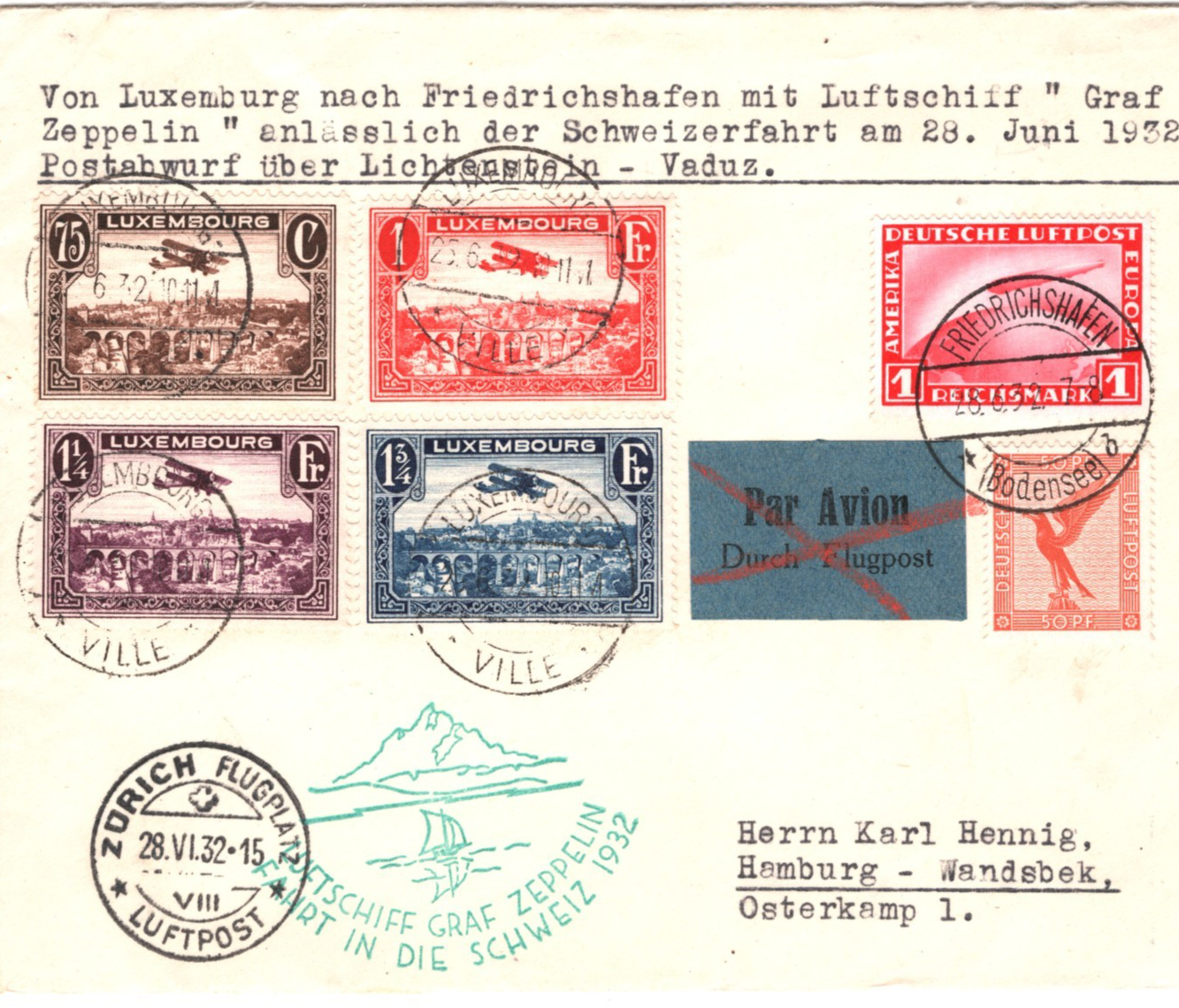 GRAF ZEPPELIN LUXEMBOURG GERMANY MIXED FRANKING Air Mail Cover FAHRT IN DIE SCHWEIZ 1932 Zürich Hamburg KZ124