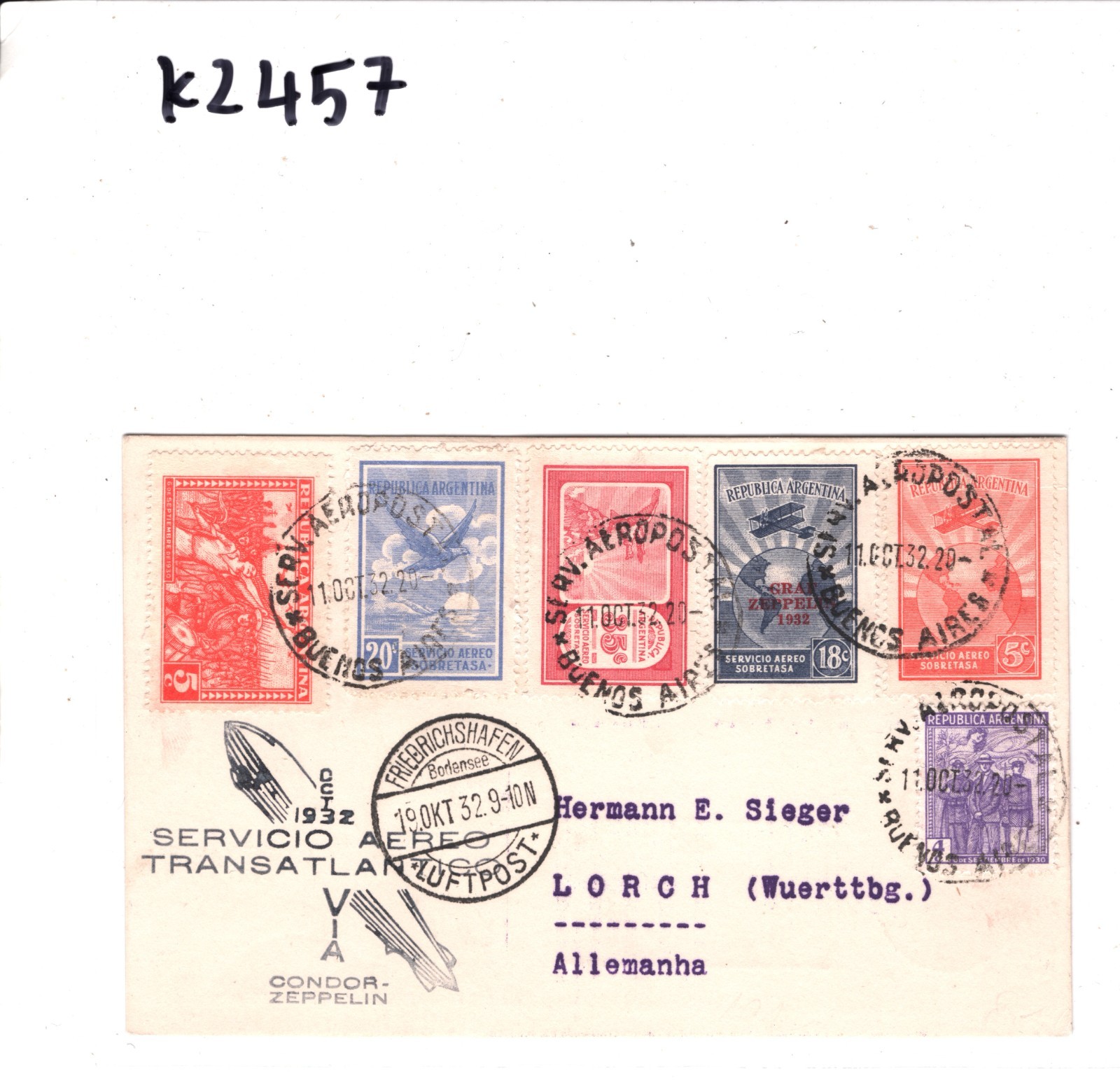 GRAF ZEPPELIN ARGENTINA Air Mail Card CONDOR Buenos Aires GERMANY Lorch 1932 KZ457