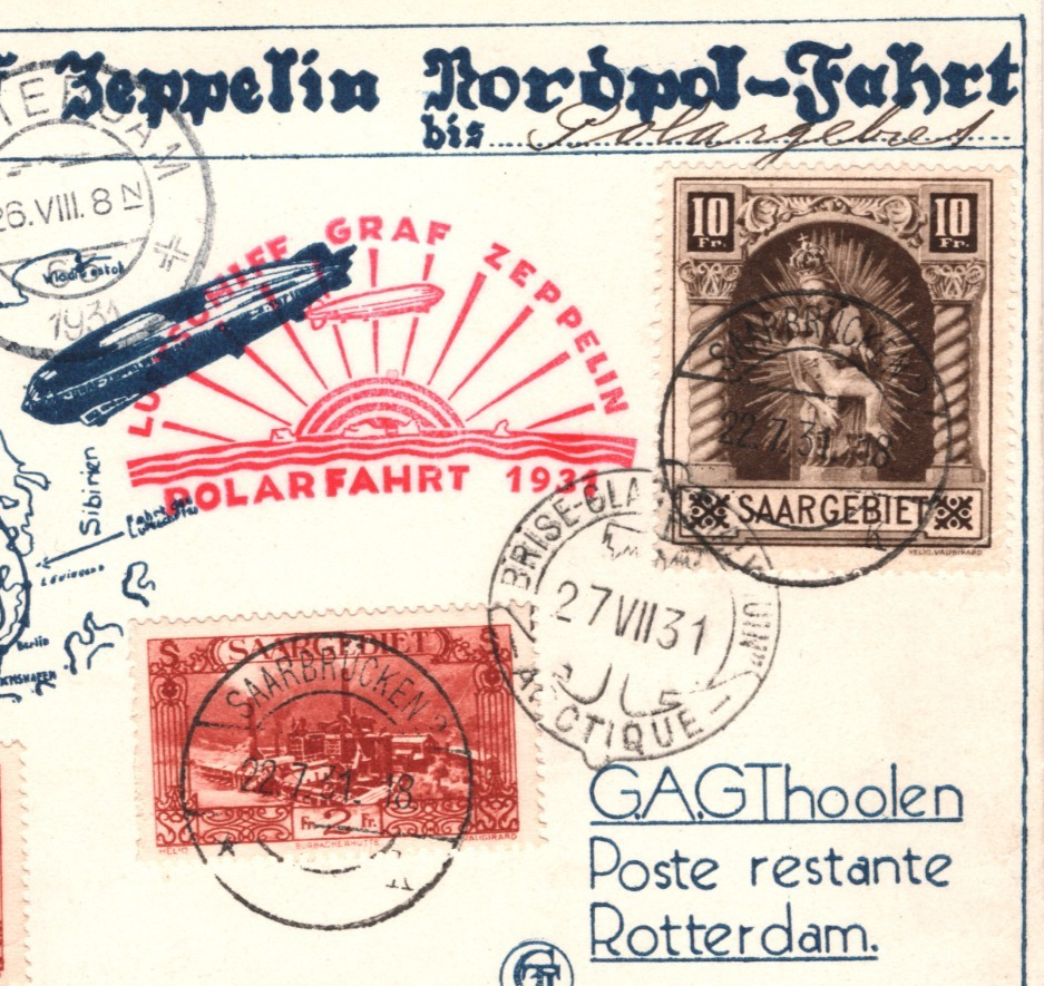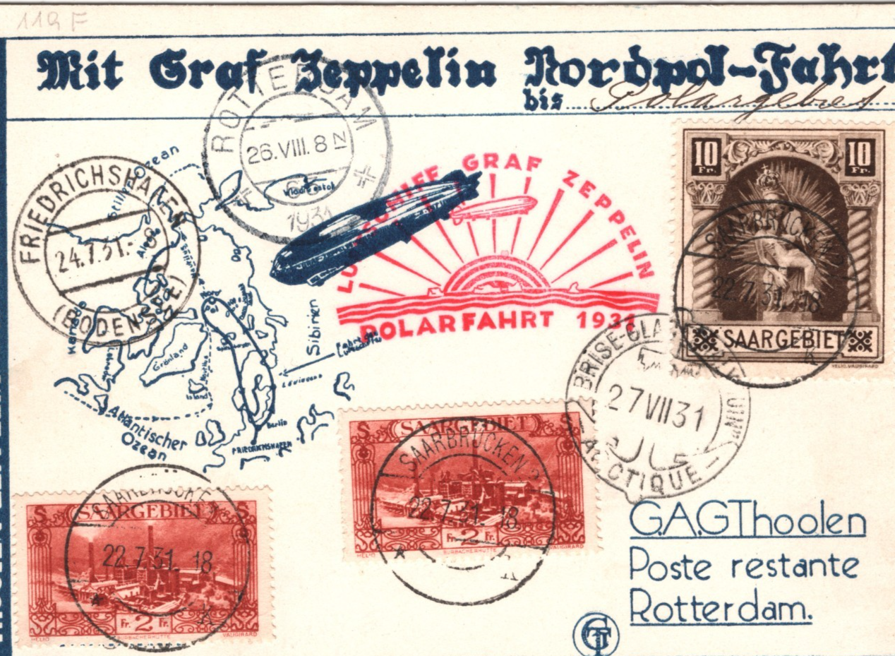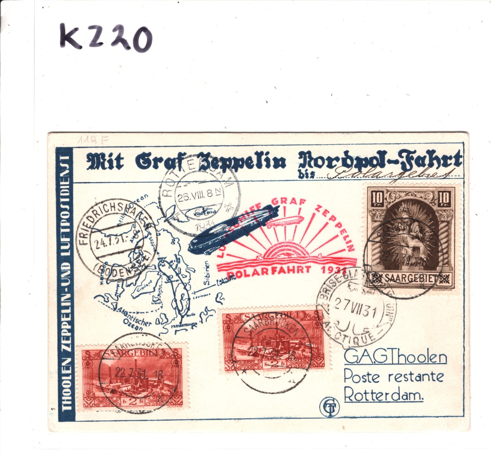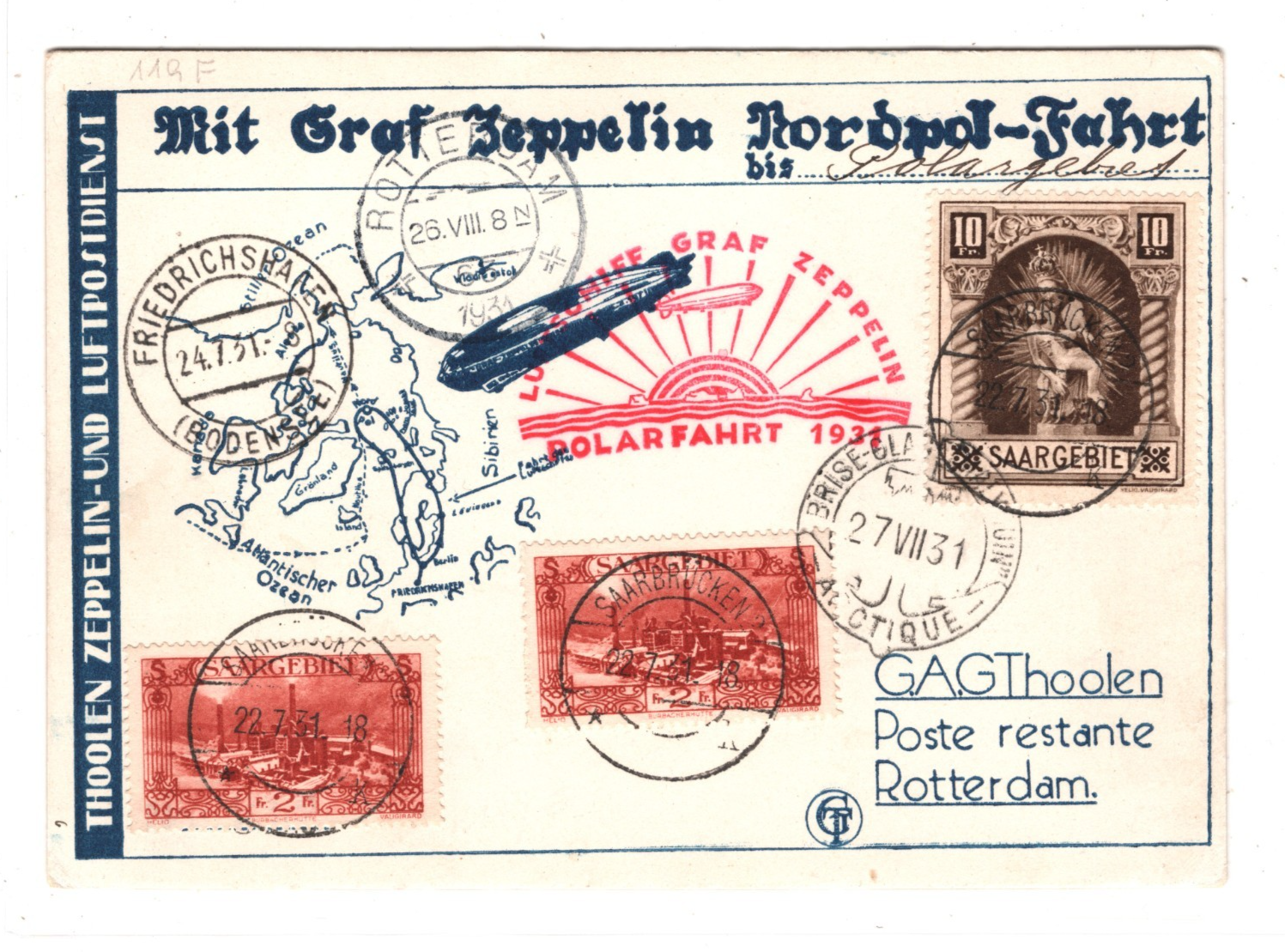 GRAF ZEPPELIN *SAAR* Air Mail 10F Card POLARFAHRT 1931 MALYGUIN Rotterdam KZ20
