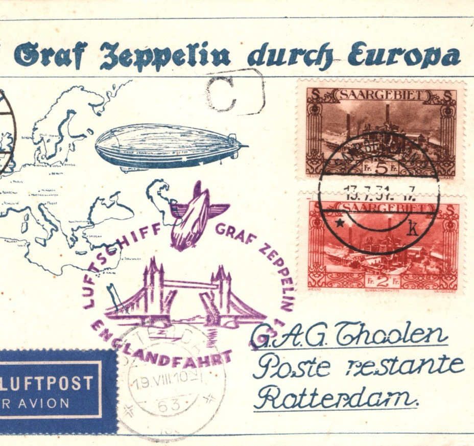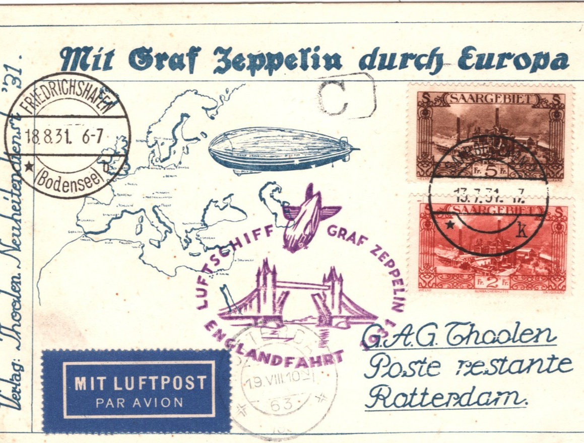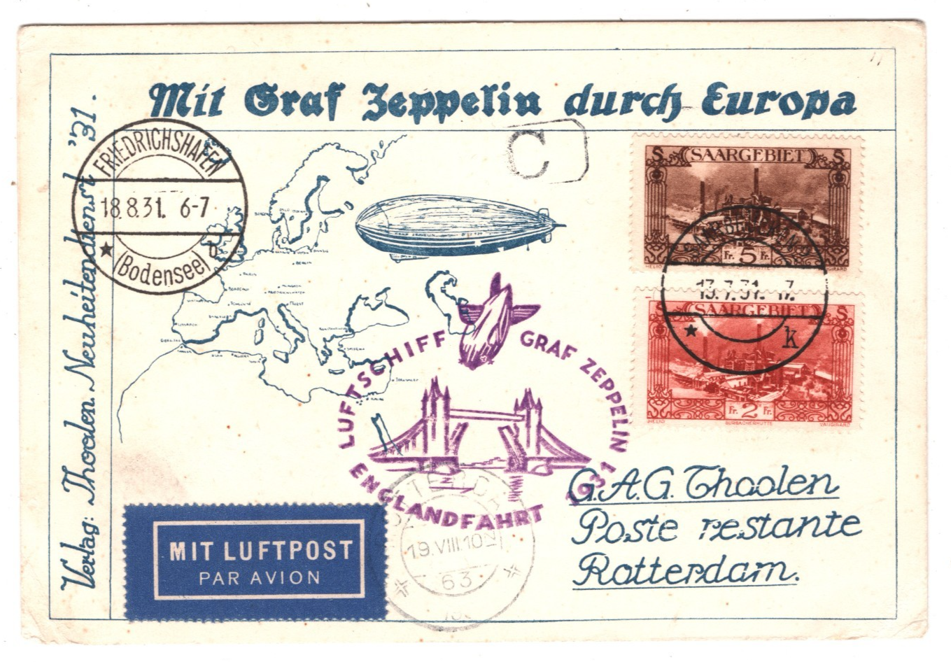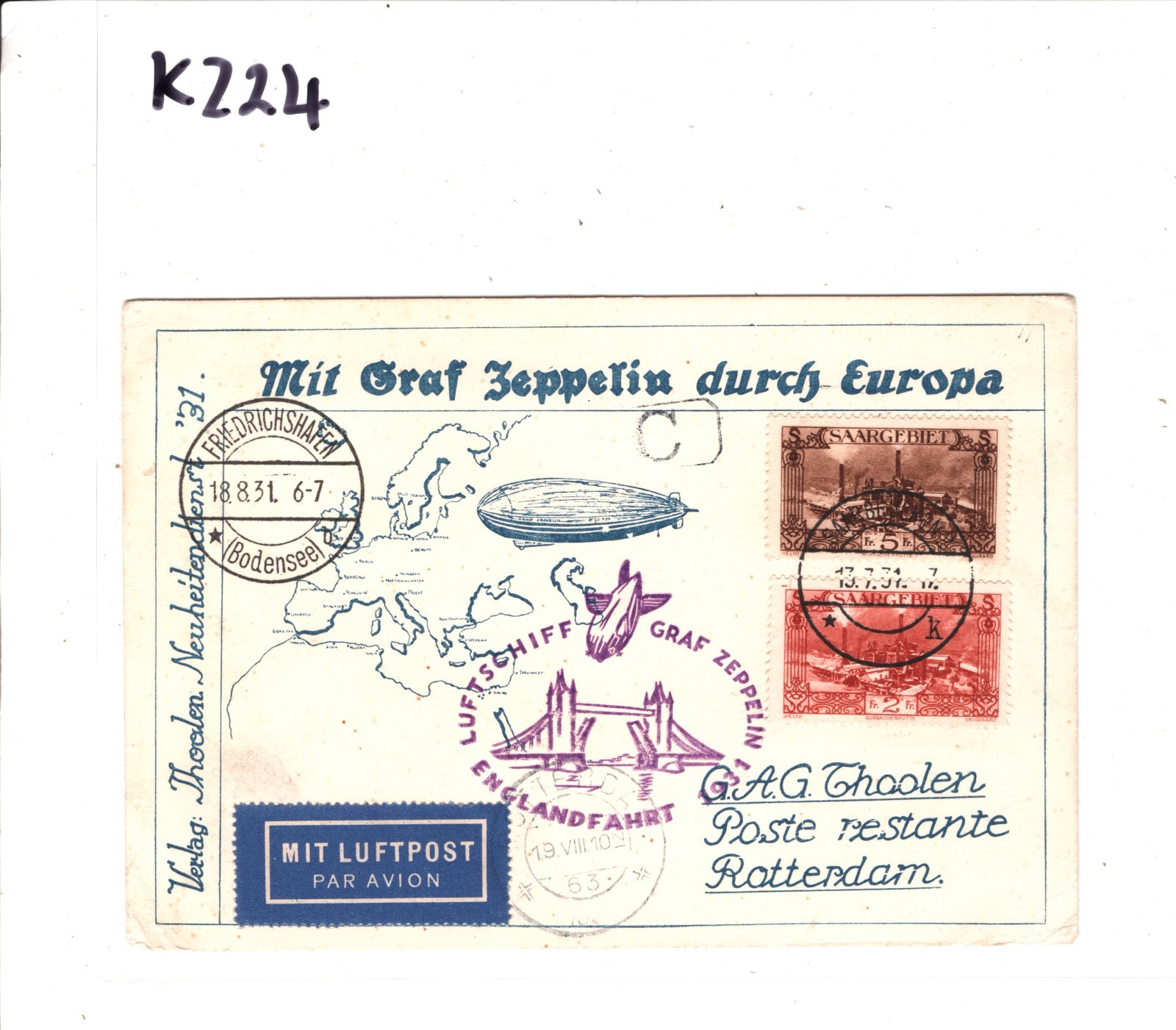 GRAF ZEPPELIN *SAAR* Air Mail Card ENGLANDFAHRT 1931 Rotterdam Netherlands  Saarbrücken KZ24