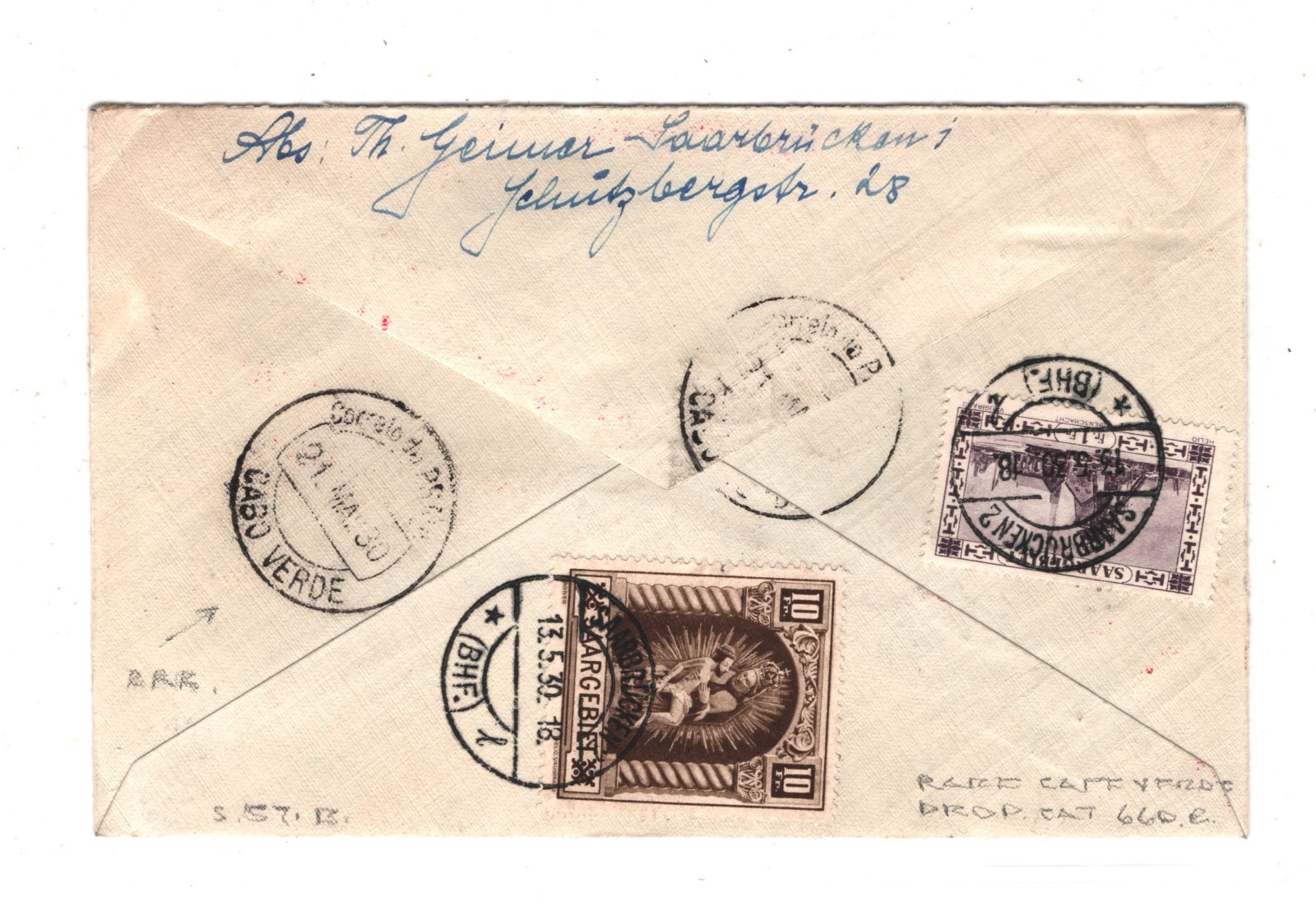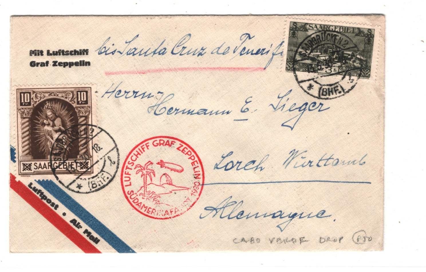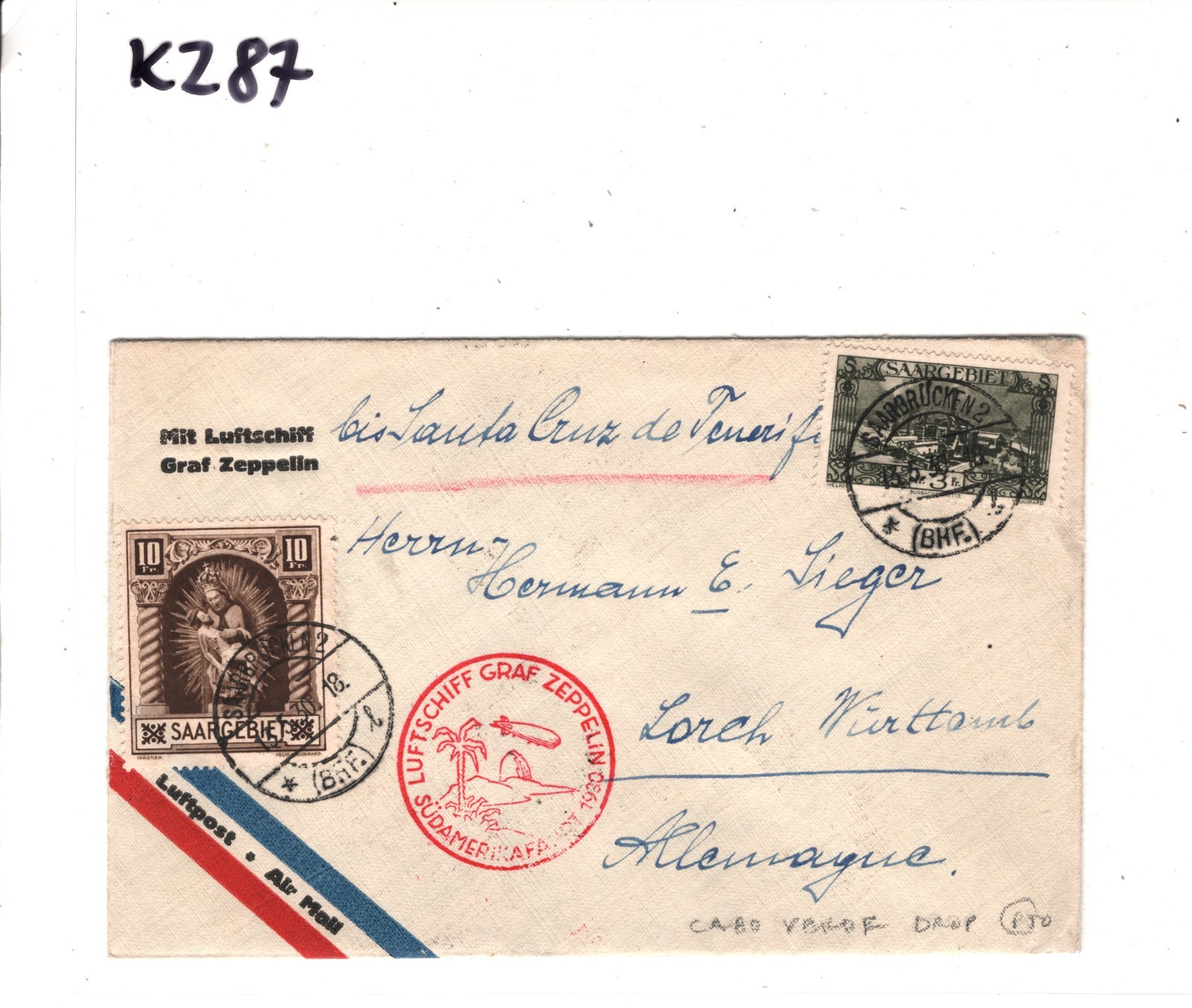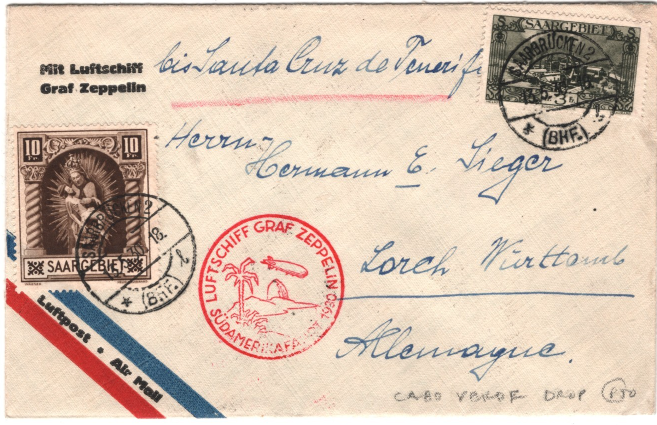 GRAF ZEPPELIN *SAAR* Air Mail Cover SÜDAMERIKAFAHRT 1930 CABO VERDE Lorch KZ87