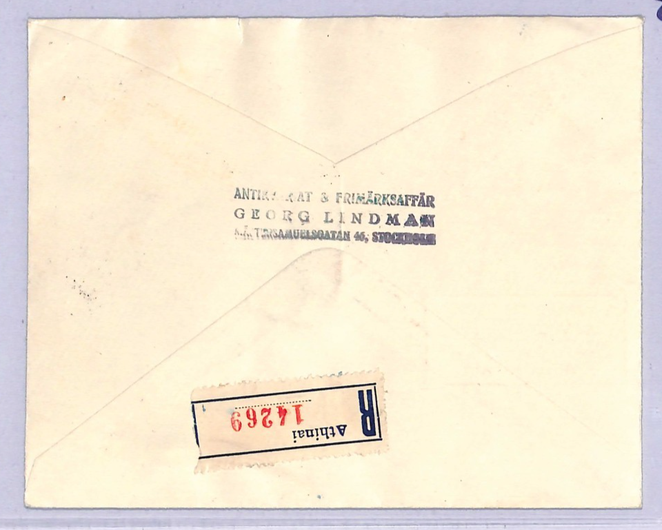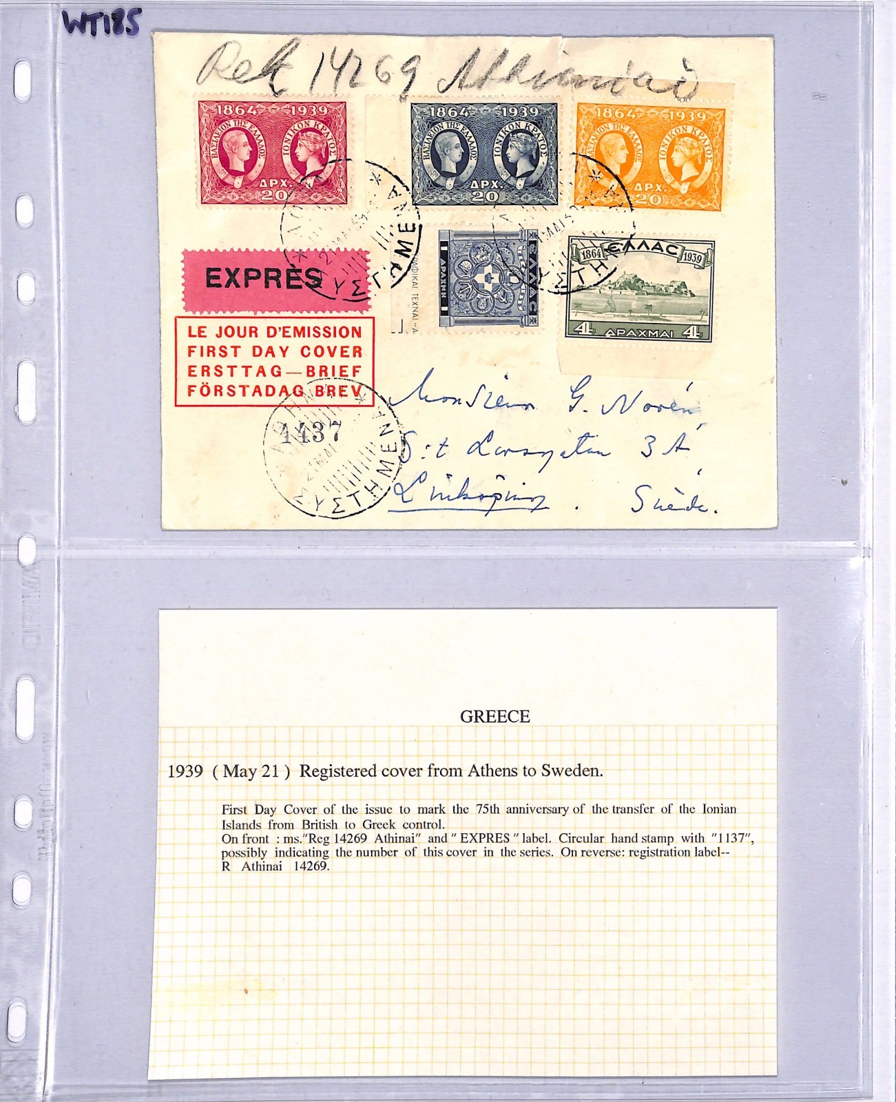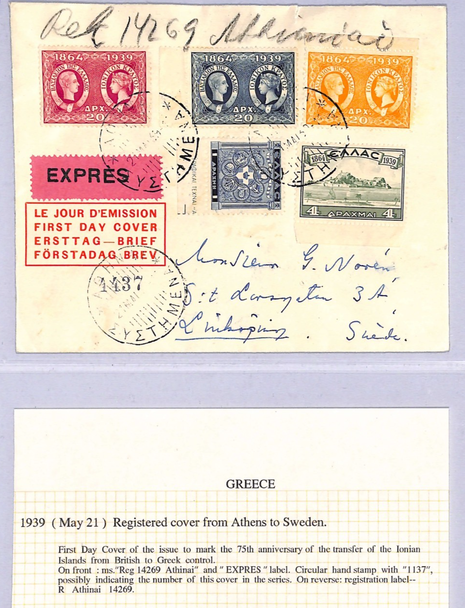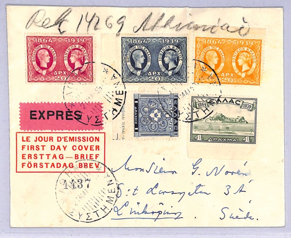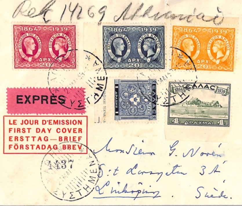 GREECE FDC 1939 IONIAN ISLANDS ANNIV Athens Sweden Linkoping Registered Express WT185