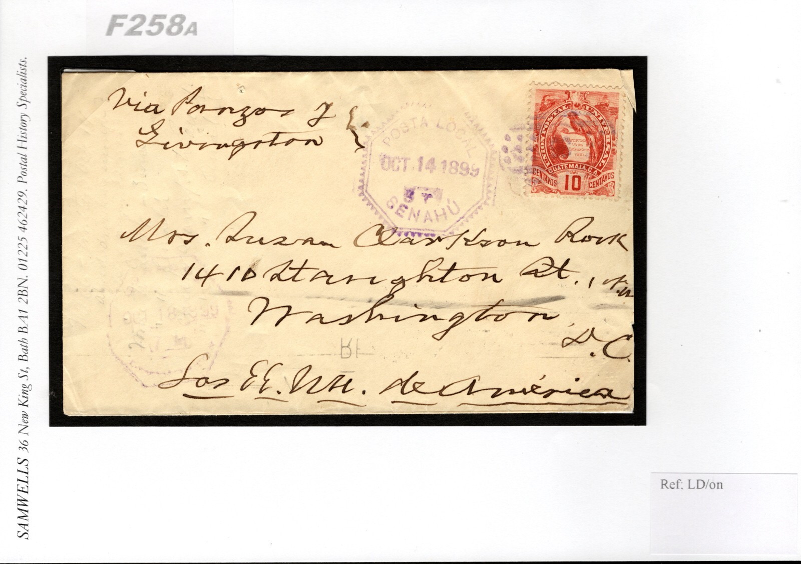 GUATEMALA Cover Registered *POSTA LOCAL SENAHU* USA Washington 1899 F258a