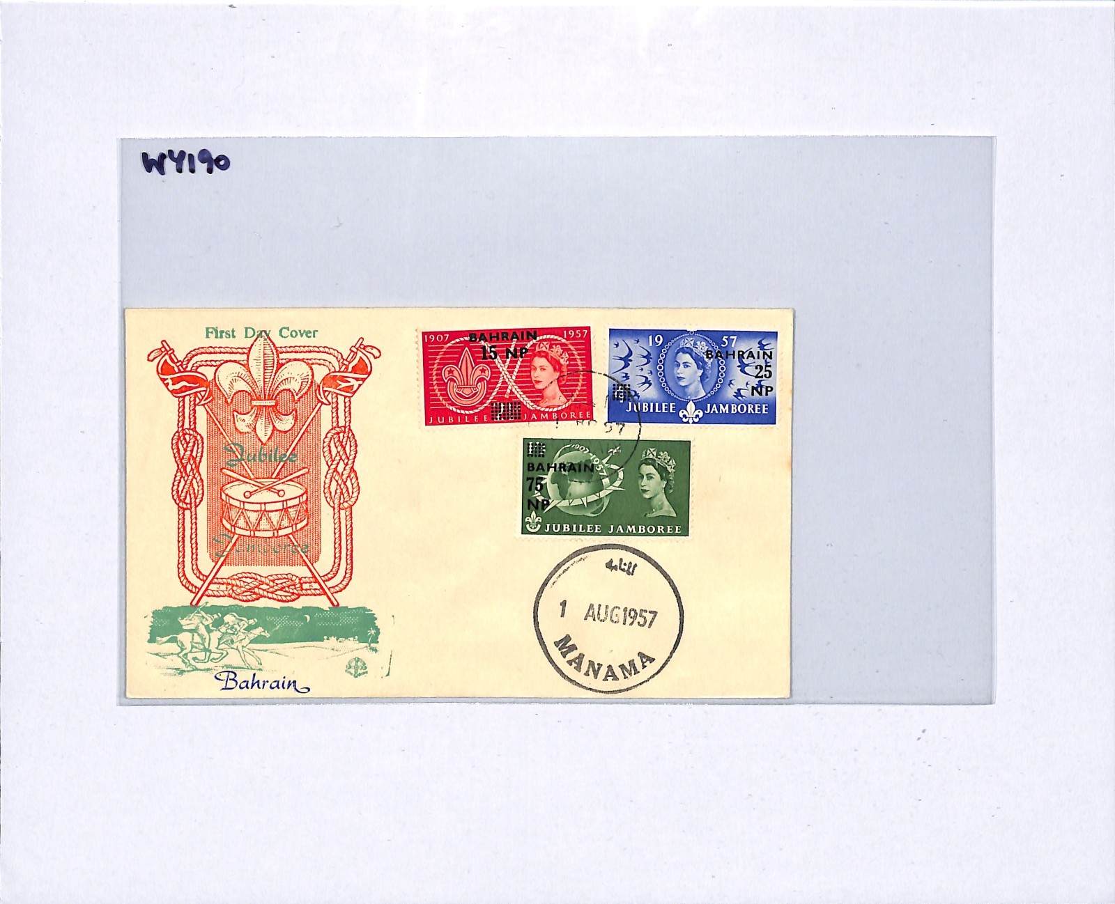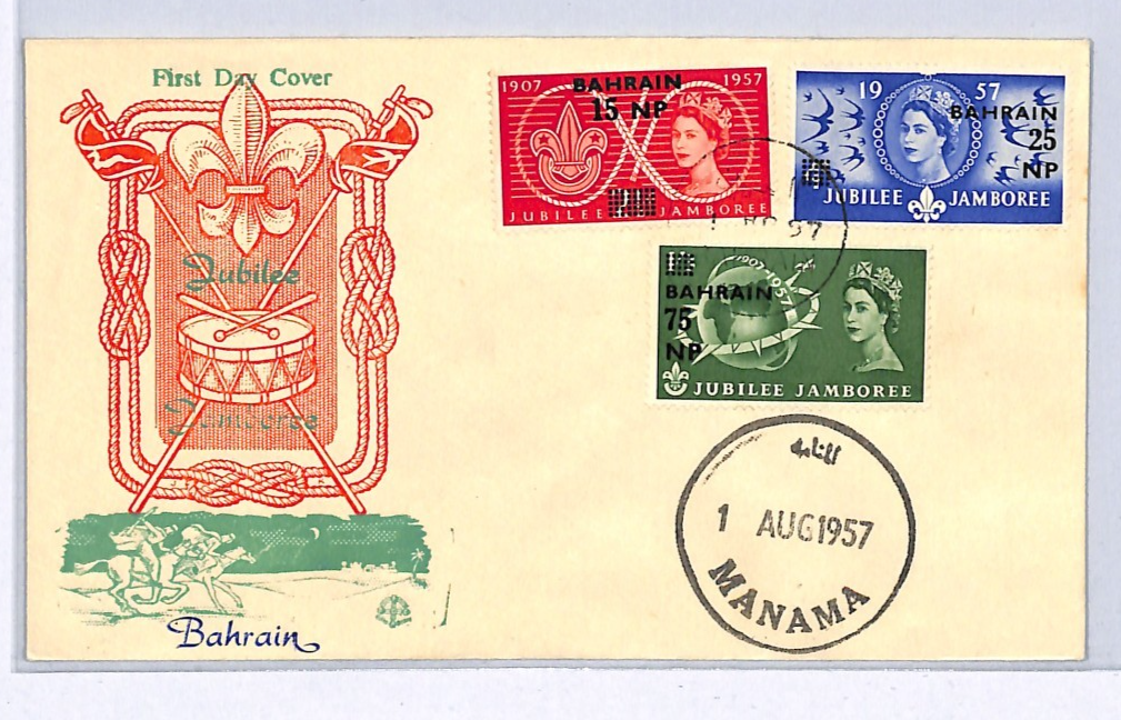 Gulf BAHRAIN 1957 FDC Jubilee Jamboree SCOUTS GB QEII Overprint Set Manama Illustrated First Day Cover WY190