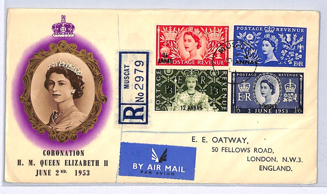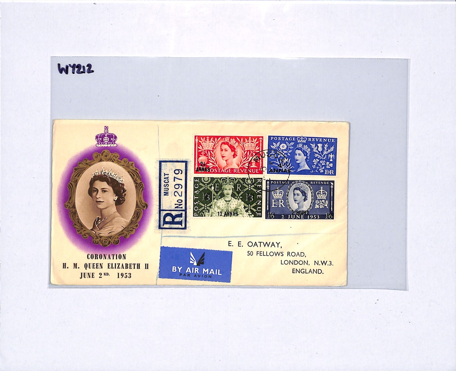 Gulf OMAN 1953 ILLUSTRATED FDC QEII Coronation *MUSCAT* CDS GB Overprint WY212