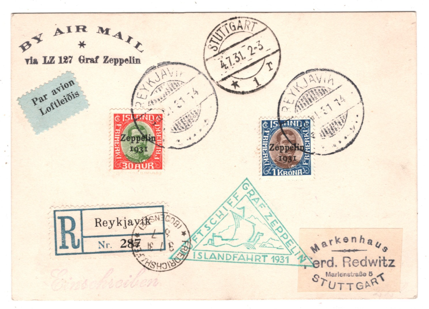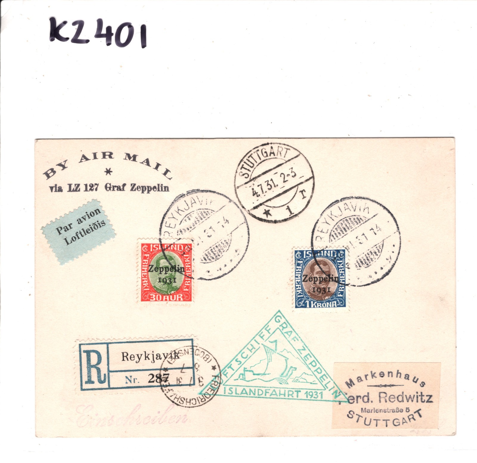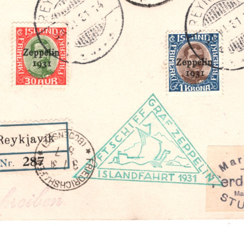 GRAF ZEPPELIN ICELAND Air Mail Card 1931 ISLANDFAHRT Germany Stuttgart Reykjavik Registered KZ401