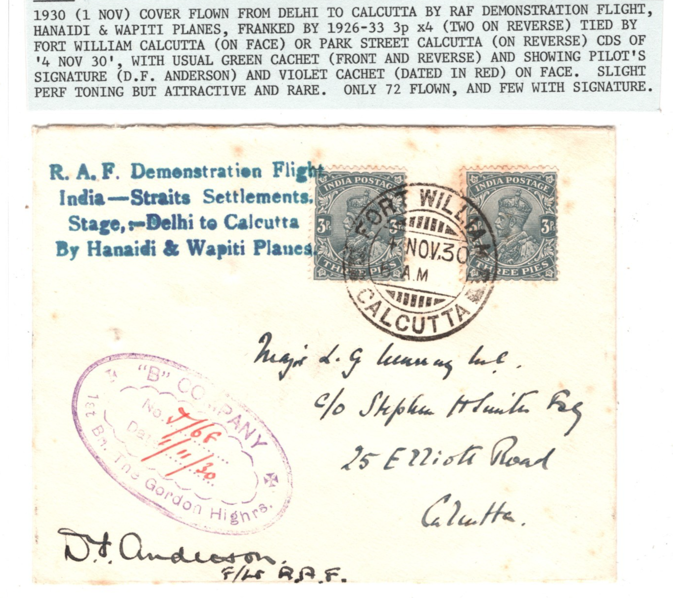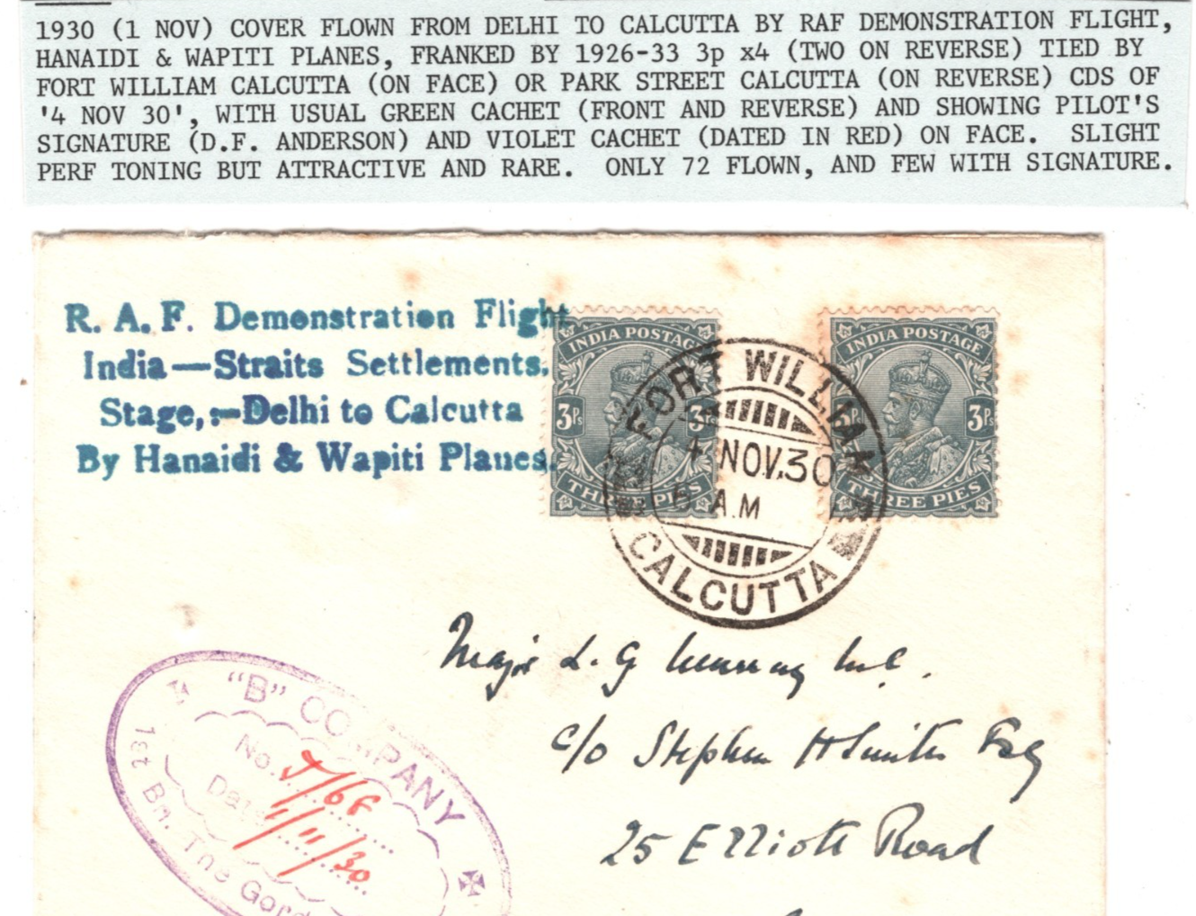 RARE PILOT SIGNED EXAMPLE of this very scarce flight which is also SIGNED BY STEPHEN SMITH on reverse. IMPORTANT ITEM from the stock of Stanley Gibbons Ltd with their typed description retained for your information. Their description notes only 72 items flown and slight perf toning. VERY FEW OF THE FLOWN ITEMS WERE SIGNED BY THE PILOT AS HERE. Some light tones. Overall Very Good for an item of this type & period. Please look at all the scans to help form your own opinion (WAF).